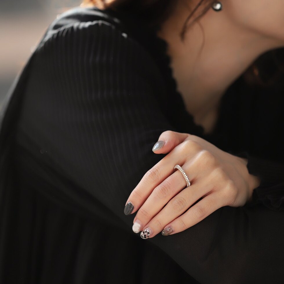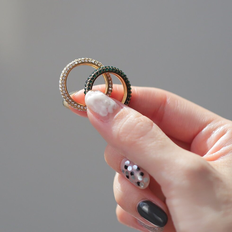 キラキラと煌くビジューをぐるっと一周飾った、ラグジュアリーな輝きを放つパヴェリング。程よく立体感のあるデザインは、手元を印象的に引き立たせます。錆びにくく傷に強いステンレス製で、デイリーに活躍◎長時間の着用も安心の低アレルギー素材です。