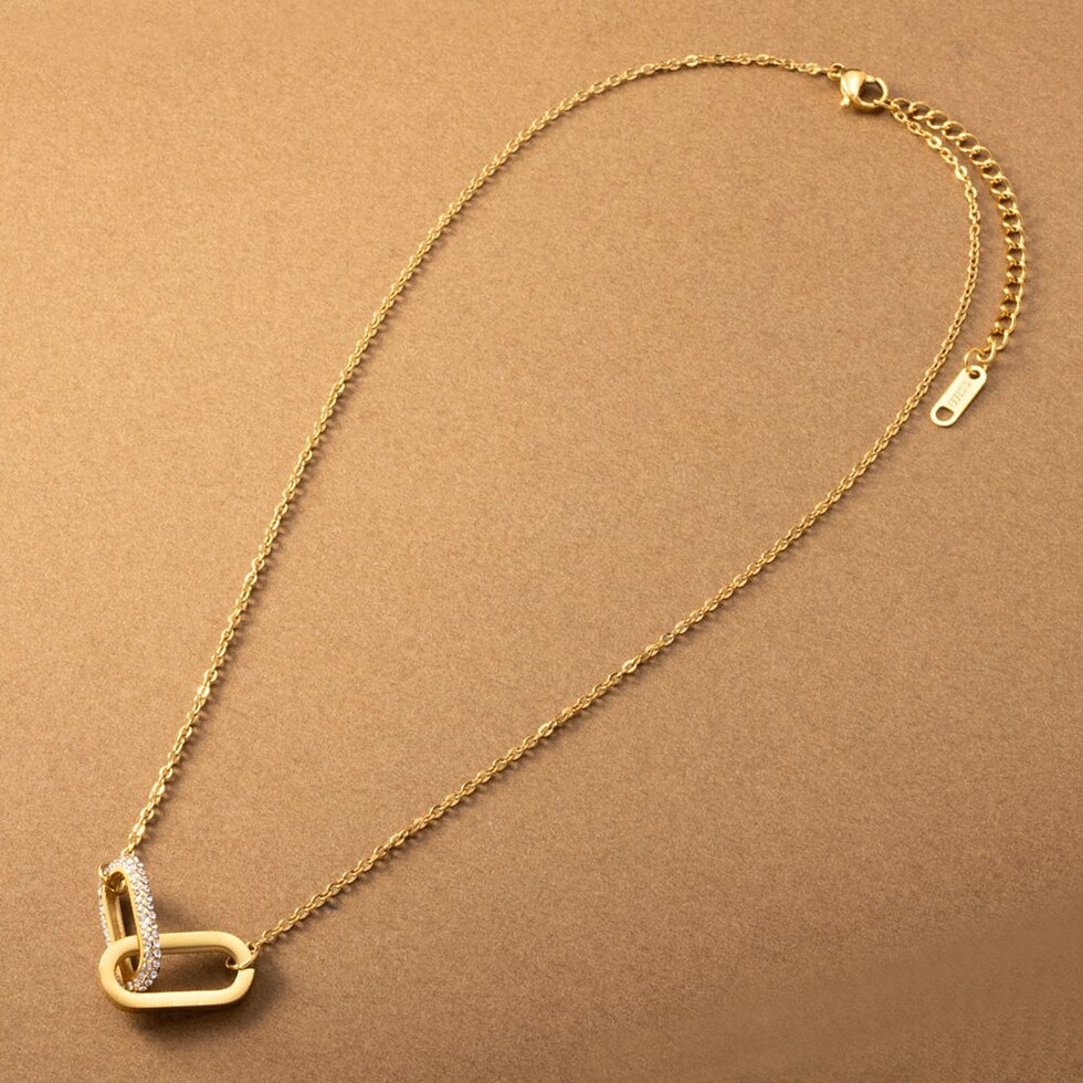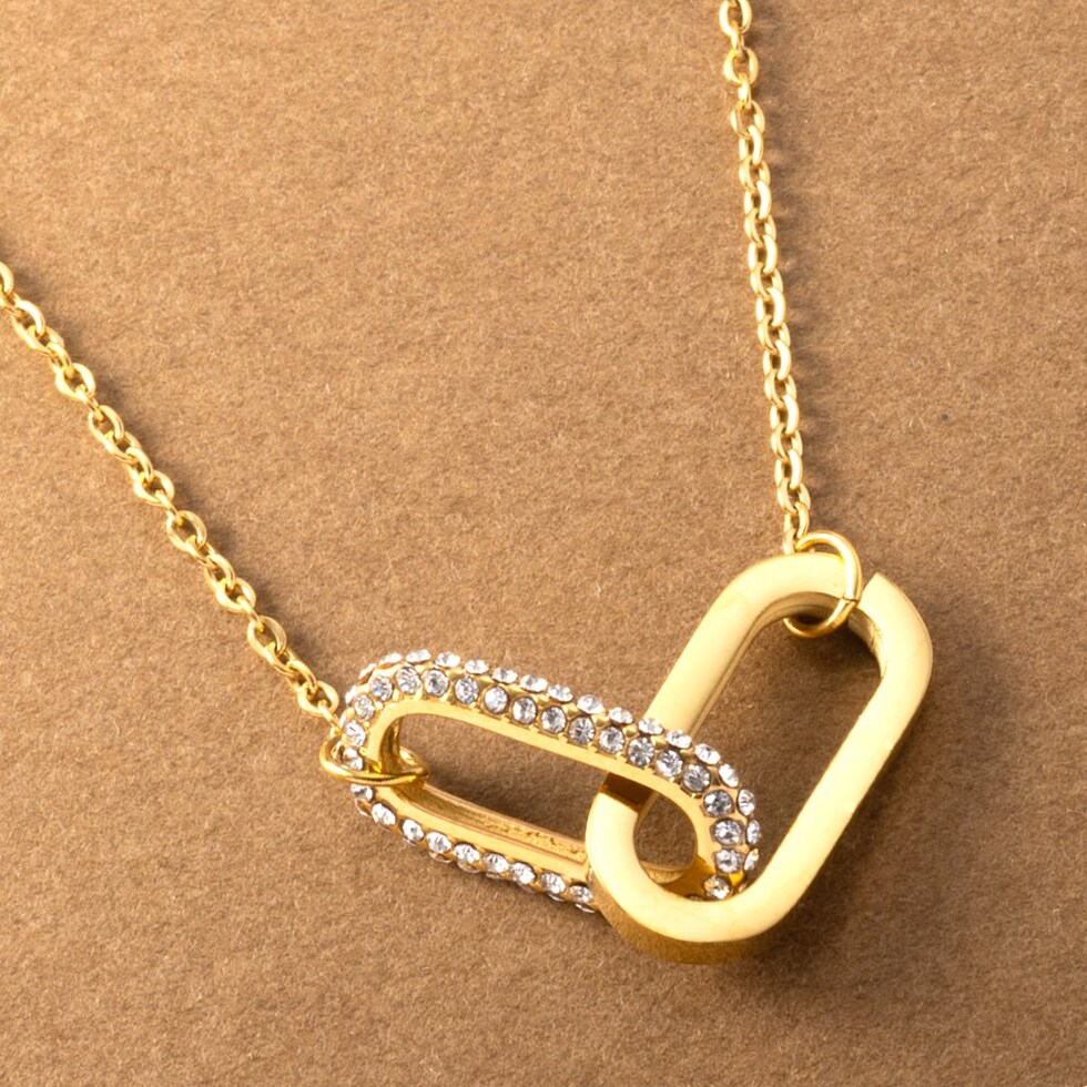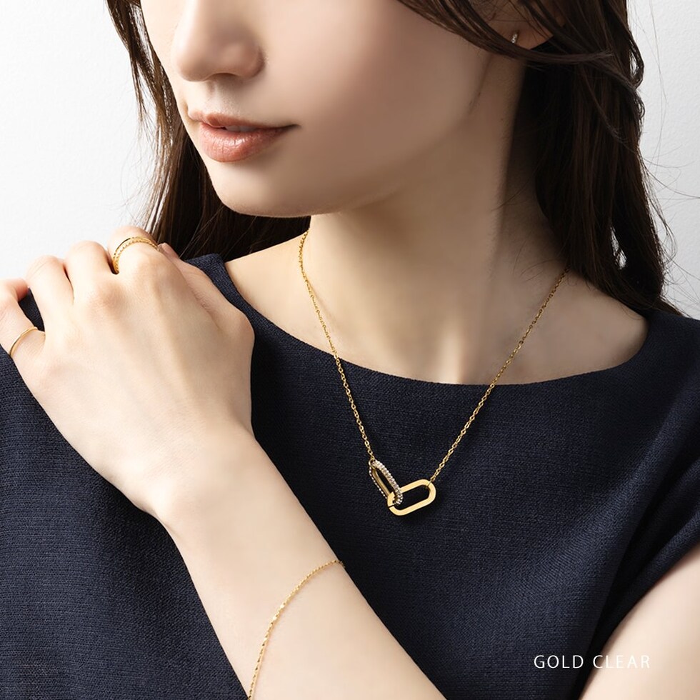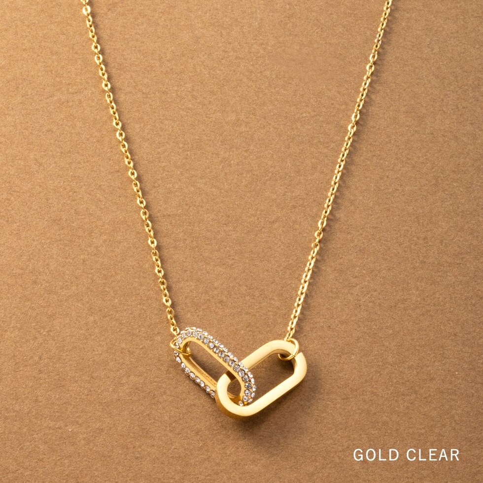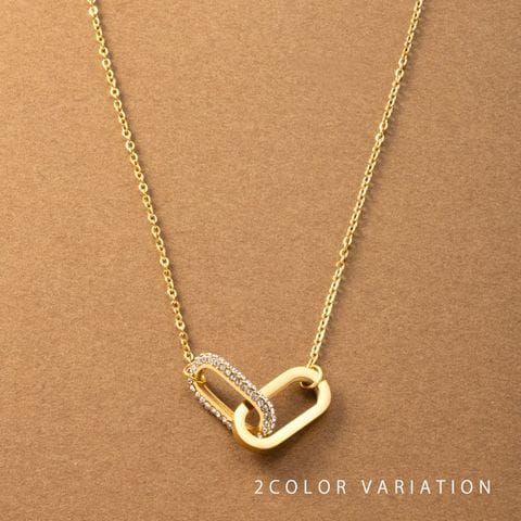 ダブルオーバルのステンレス製ネックレス。ビジューをふんだんに使用したラグジュアリーな輝きを放つオーバルフレームが高級感漂う逸品。錆びにくいステンレス製でデイリーに活躍しそう。お呼ばれシーンにも◎