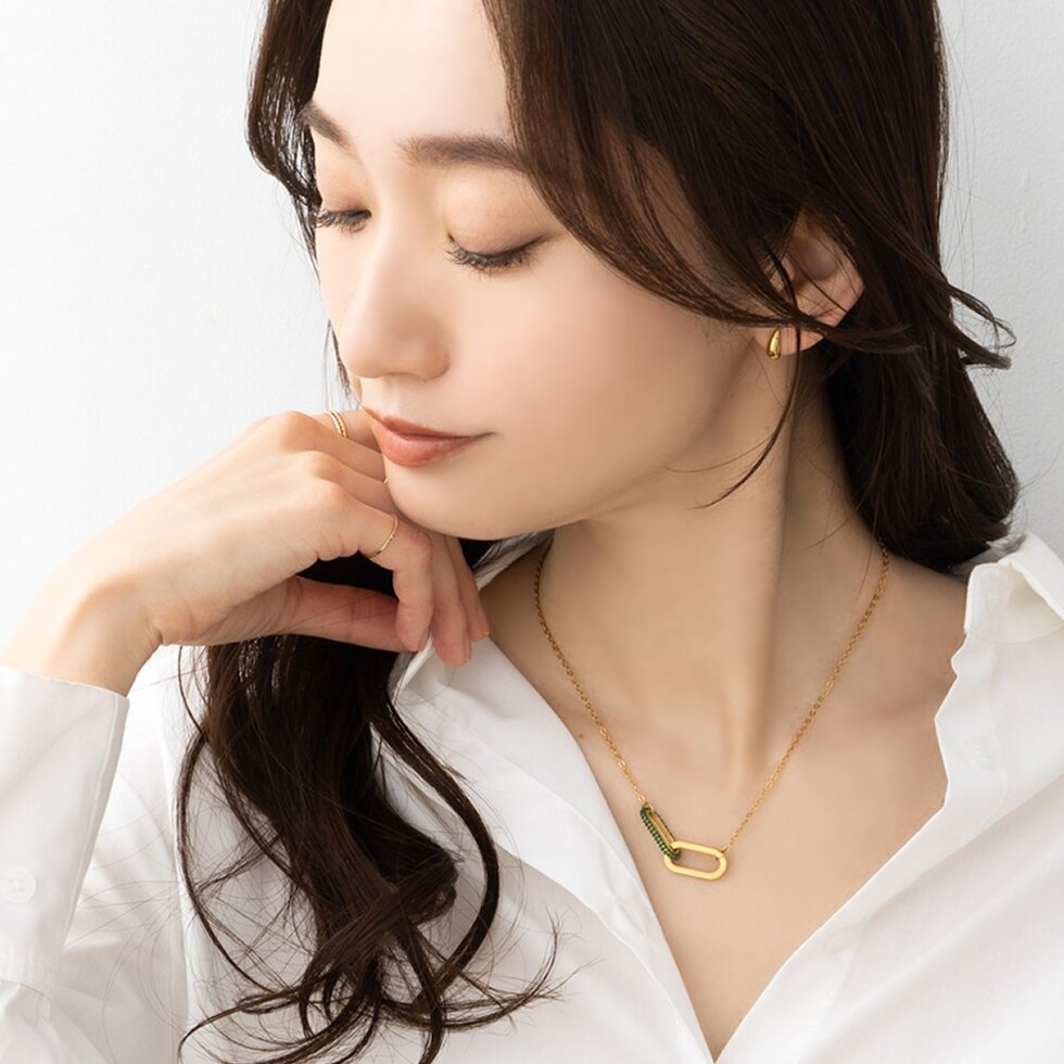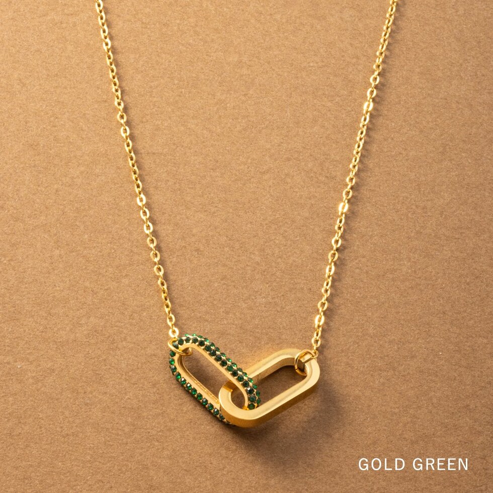 ネックレス ステンレス 金属アレルギー サージカルステンレス レディース つけっぱなし ショート チェーン パヴェ ビジュー オーバル フレーム ダブル グリーン cream dot ゆうパケット [ゴールド×グリーン_ワンサイズ]