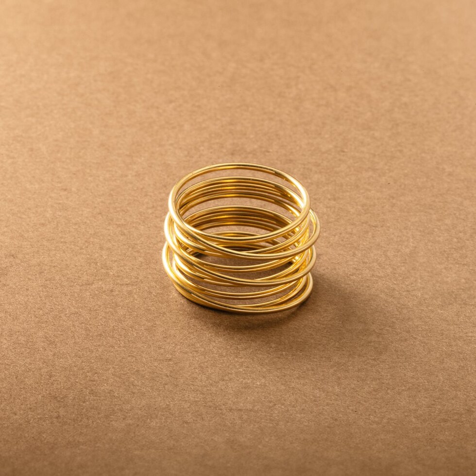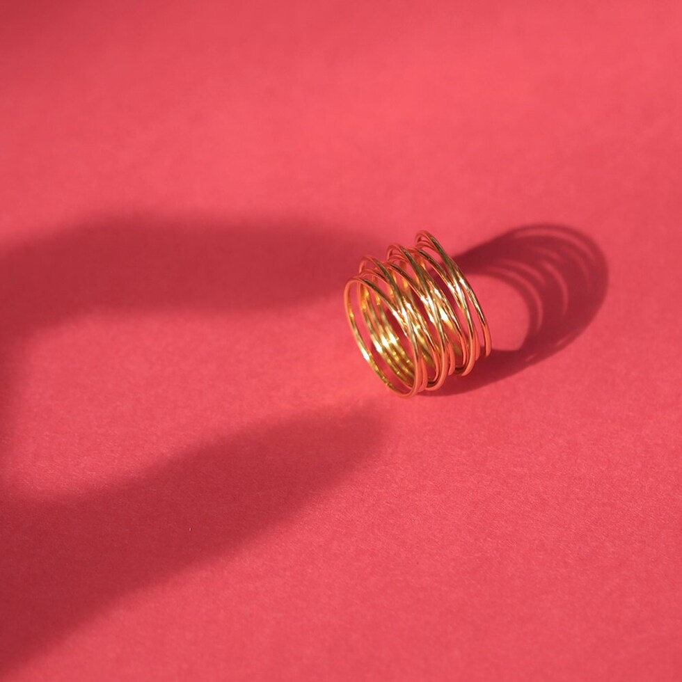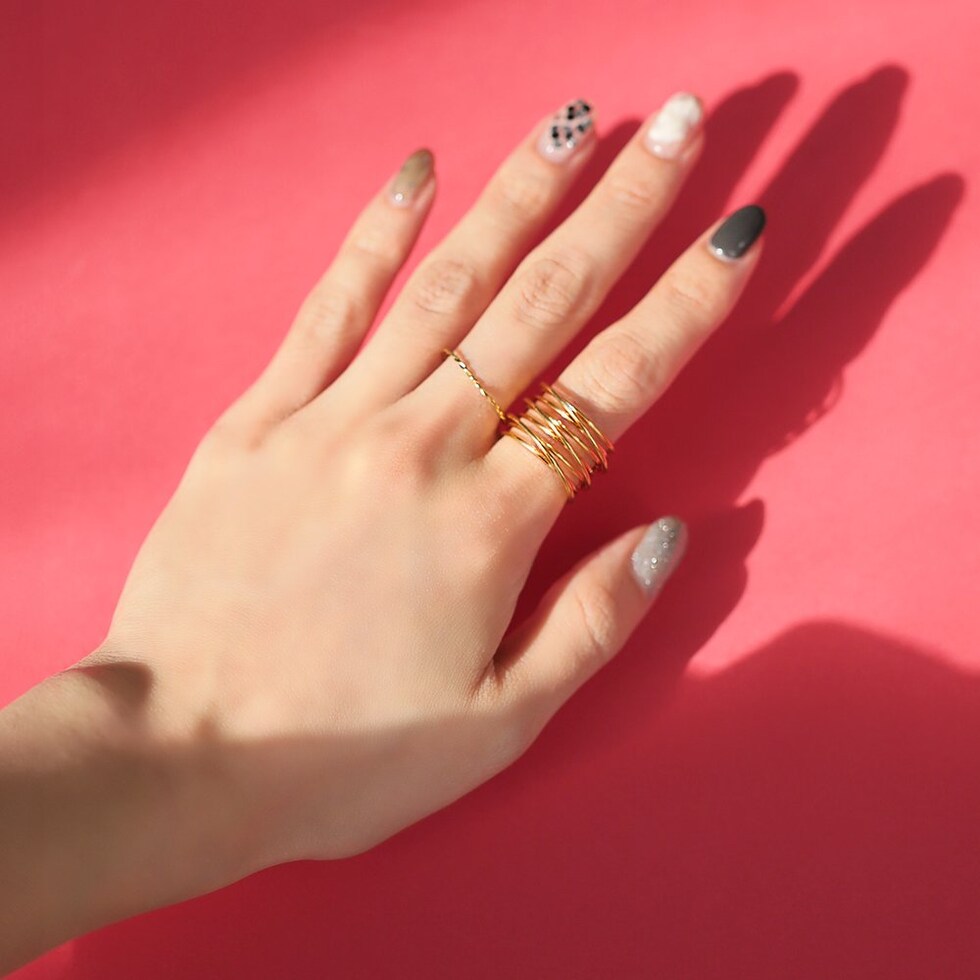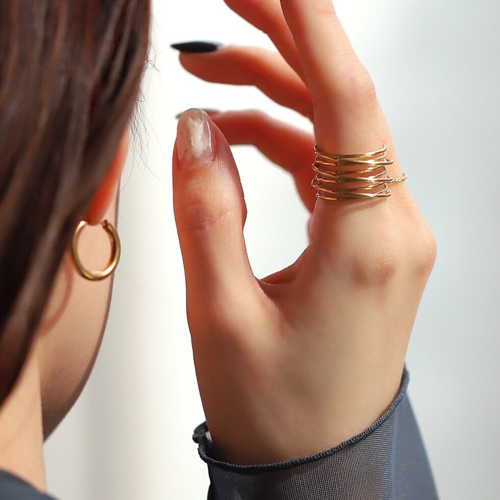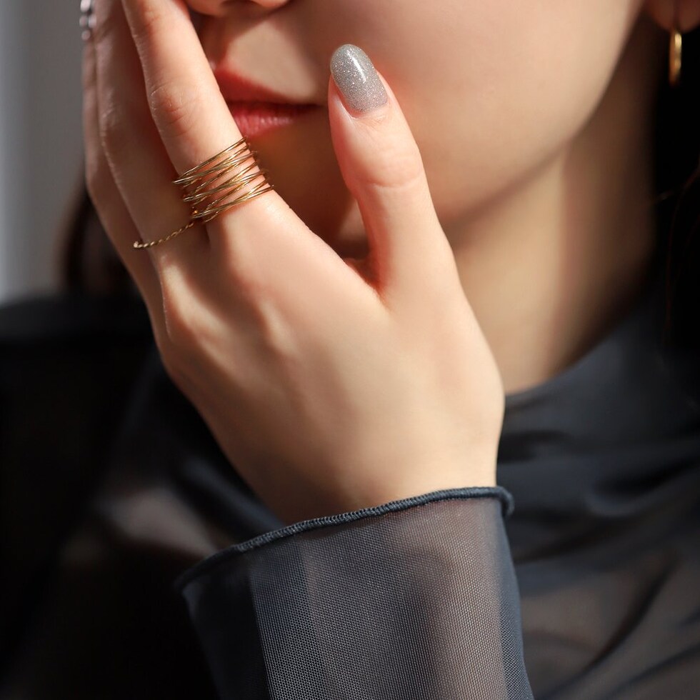 細いワイヤーを重ねた多重ワイドリング。主役級の存在感がありながらも、華奢なラインが洗練された抜け感ある手元を演出。一点投入するだけでコーデをグッと格上げしてくれるアイテムです。