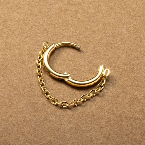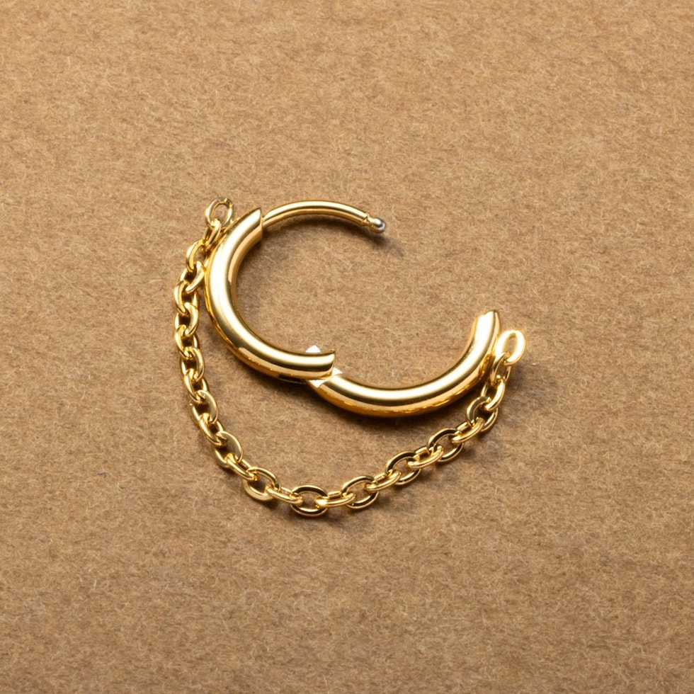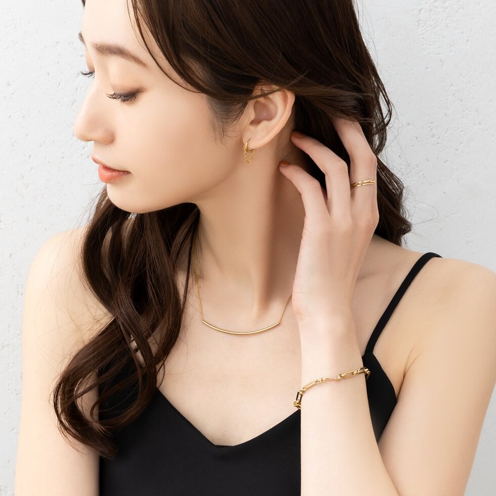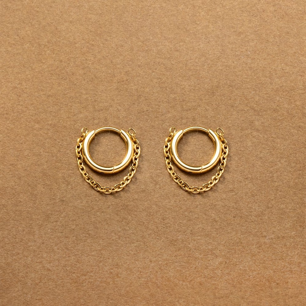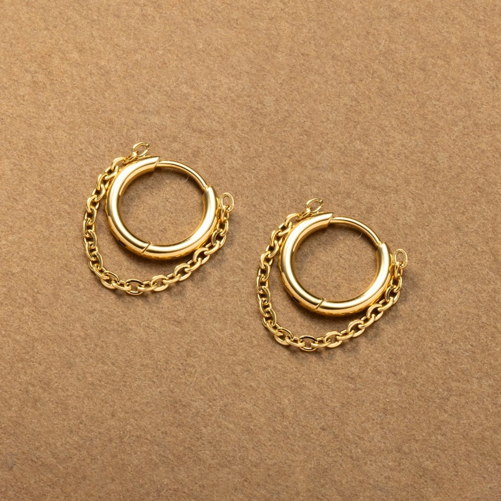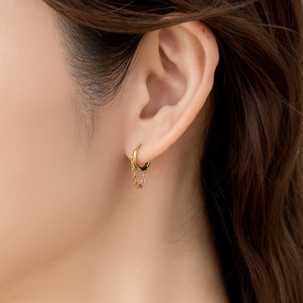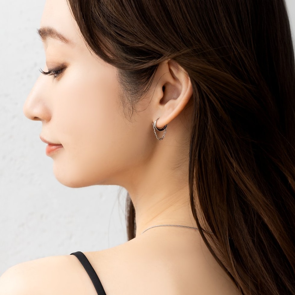 フープにチェーンのアクセントがこなれ感をプラスするキャッチレスピアス。重ね付けしたような2連デザインが、オシャレ度高めな仕上がりに◎派手過ぎない程よいサイジングが、デイリーに使いにぴったりなひと品です。