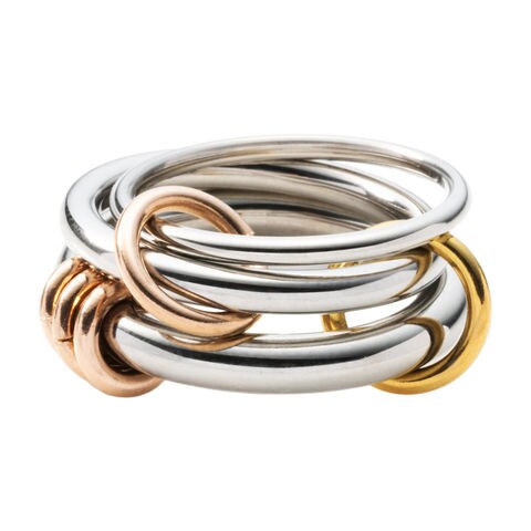 3本のリングを連結させたコンビカラーがお洒落なコネクテッドリング。全て重ねてボリュームを出したり、それぞれ違う指につけたりと4WAYでアレンジを楽しめる新感覚のアクセサリーです。これひとつで手元コーデの幅がグッと広がるマストバイアイテム◎錆びにくく傷に強いステンレス製です。