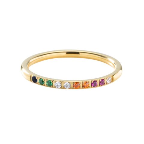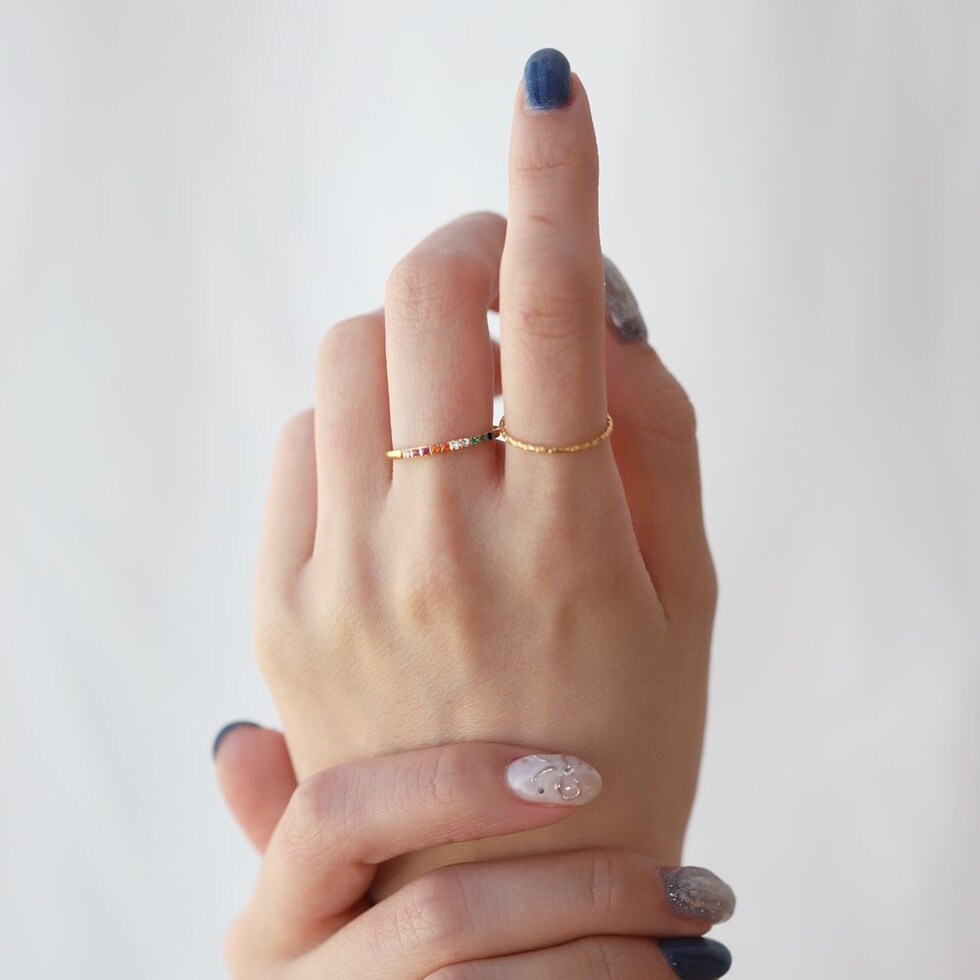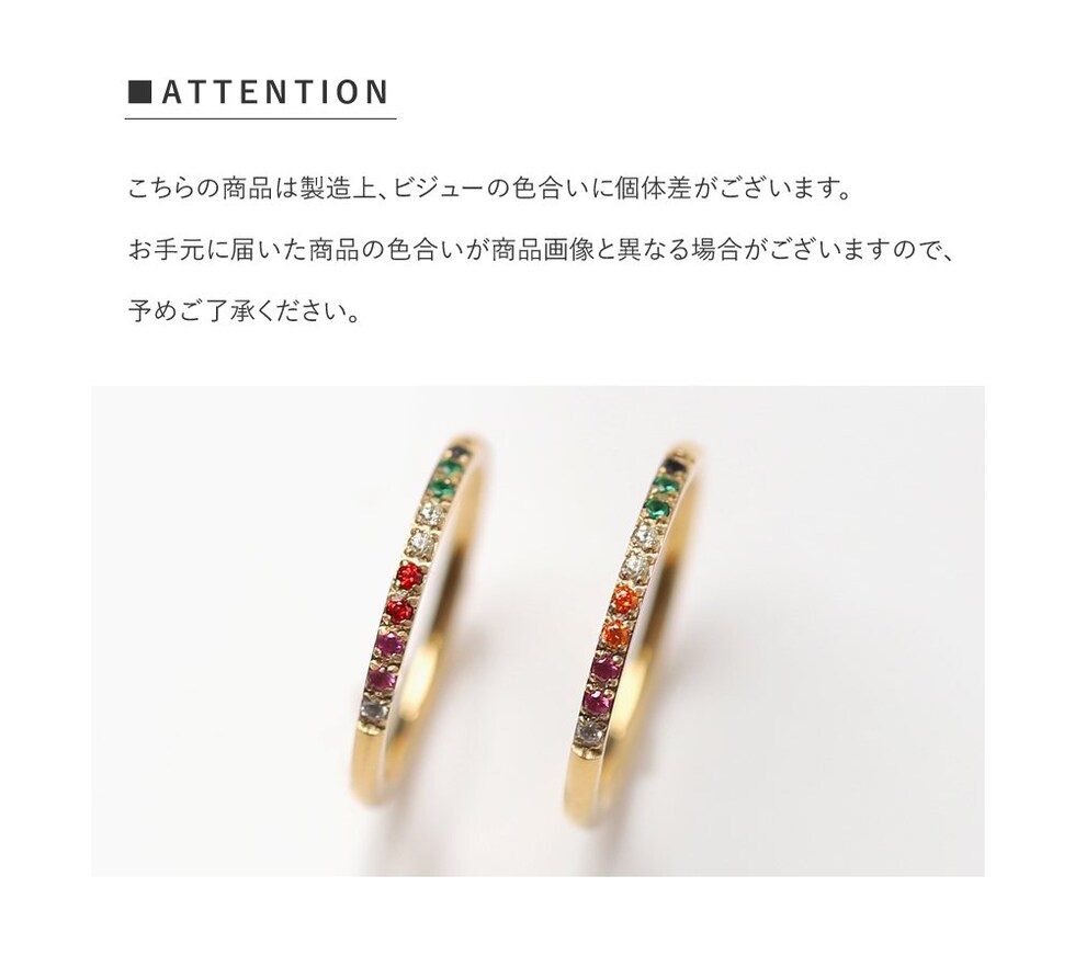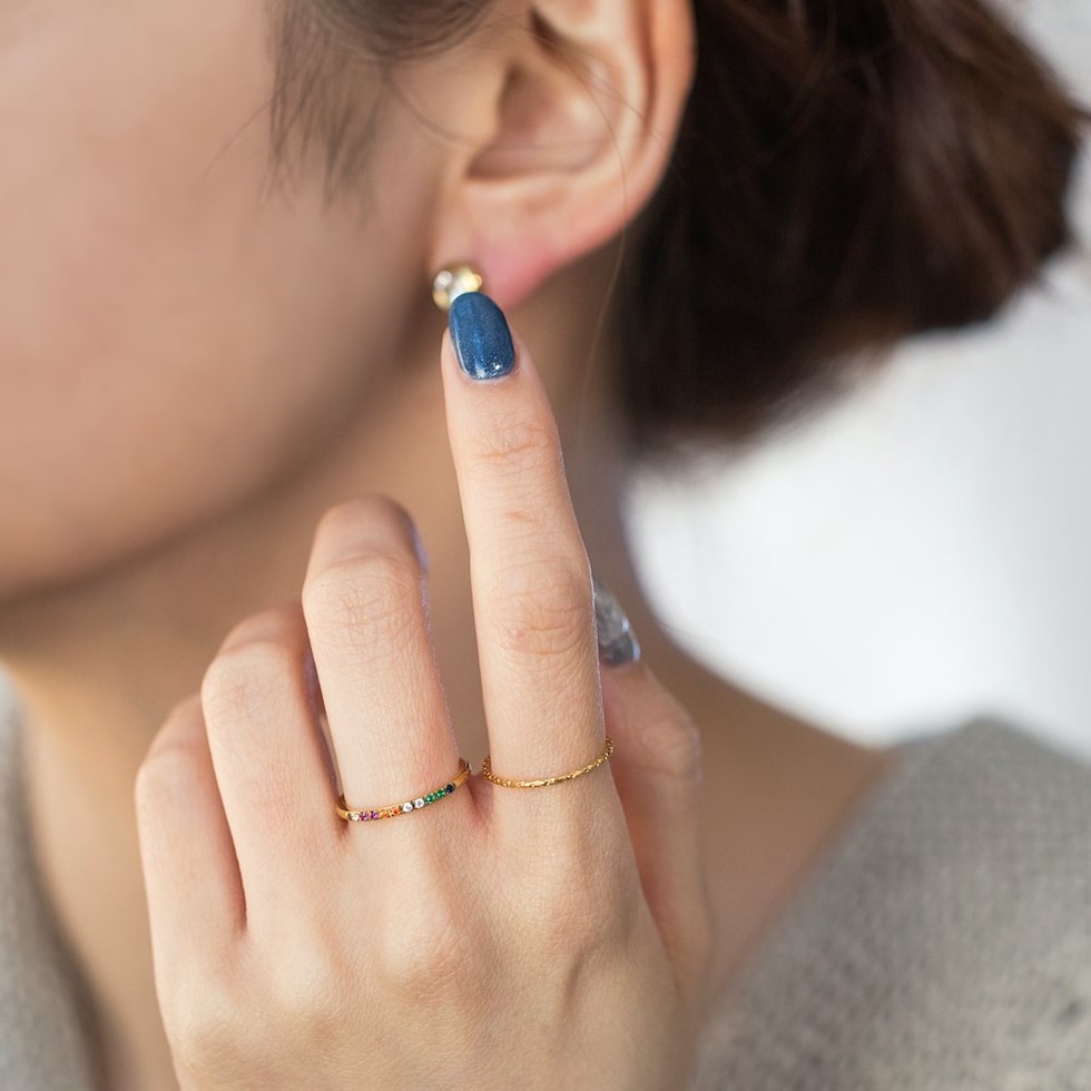 MIXビジューを並べたマルチカラーのクォーターエタニティーリング。ビビットなビタミンカラーが煌めき、手元を華やかに彩ります。錆びにくく傷に強いステンレス製で、デイリーに活躍してくれます。長時間の着用も安心の低アレルギー素材です。