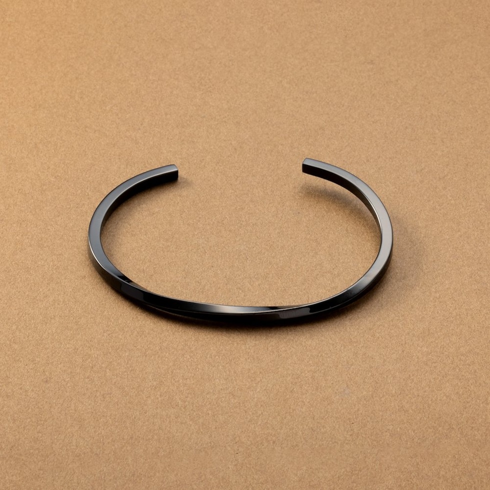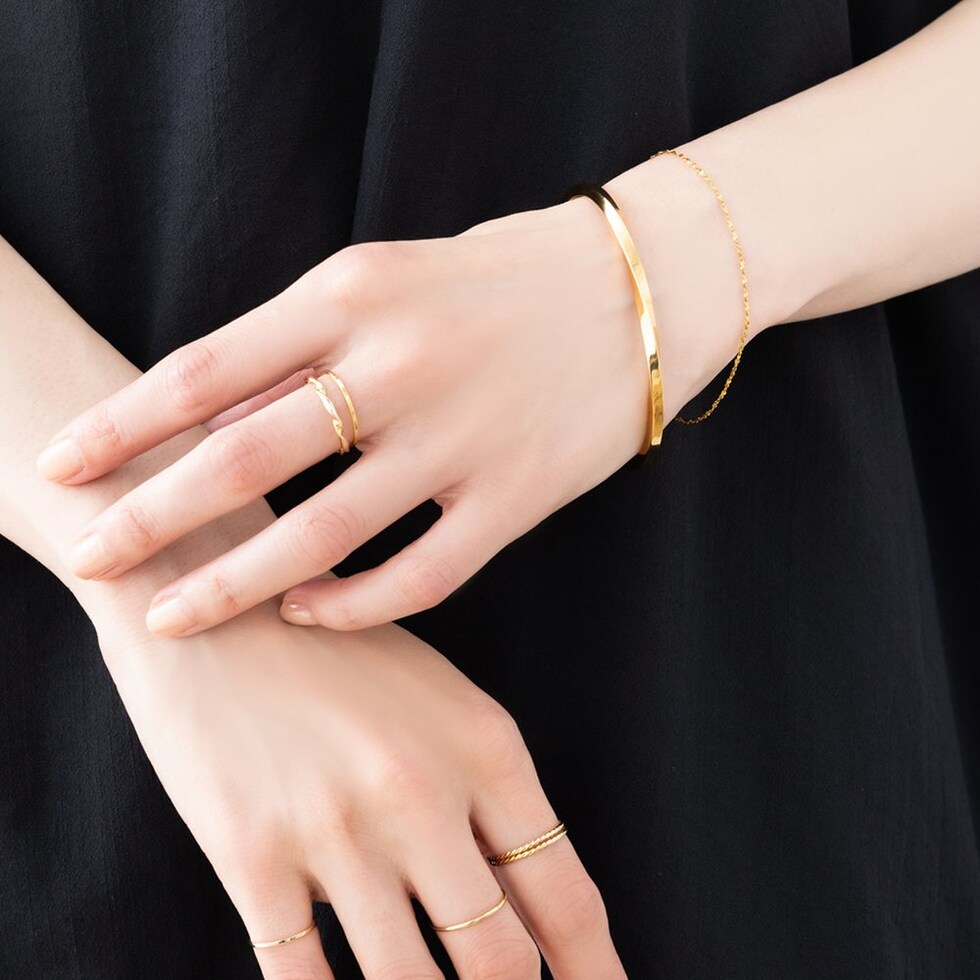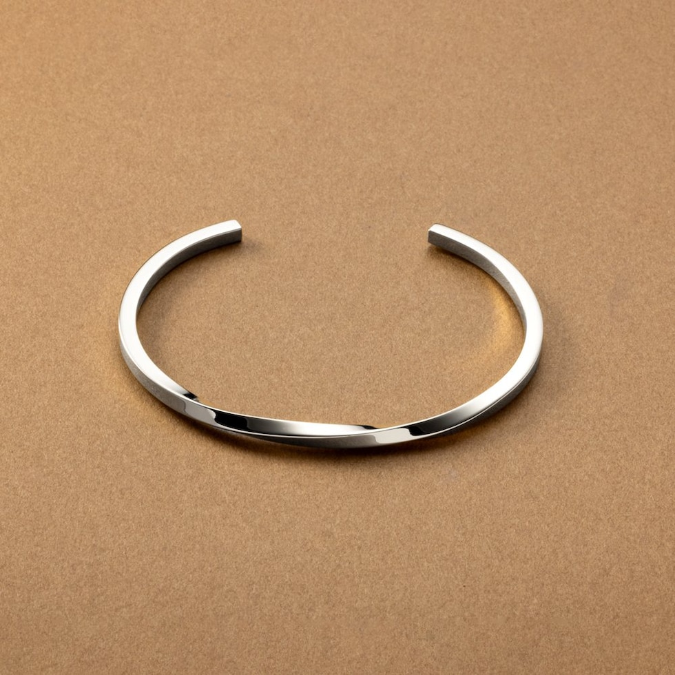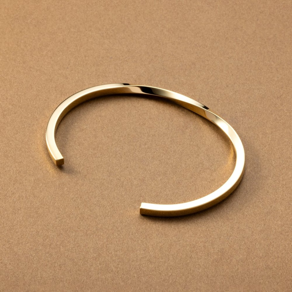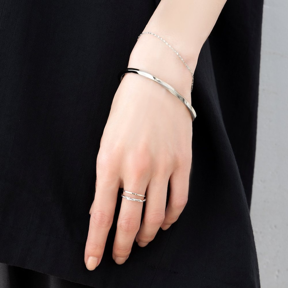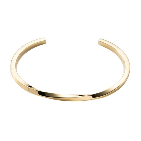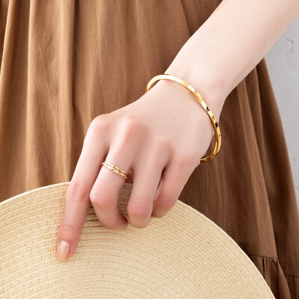 シンプルなツイストデザインのオープンバングル。高級感漂うさりげないデザインが手元にこなれ感をプラスし、洗練された印象を演出します。手元の程よいアクセントに活躍するオススメのひと品。