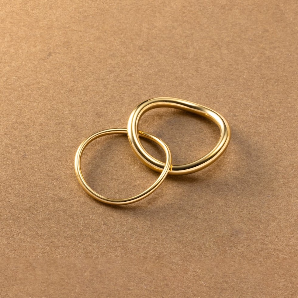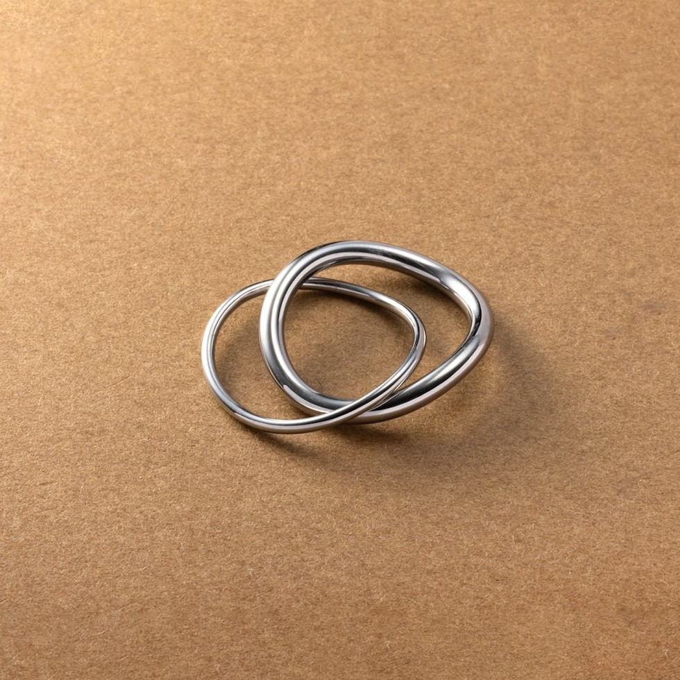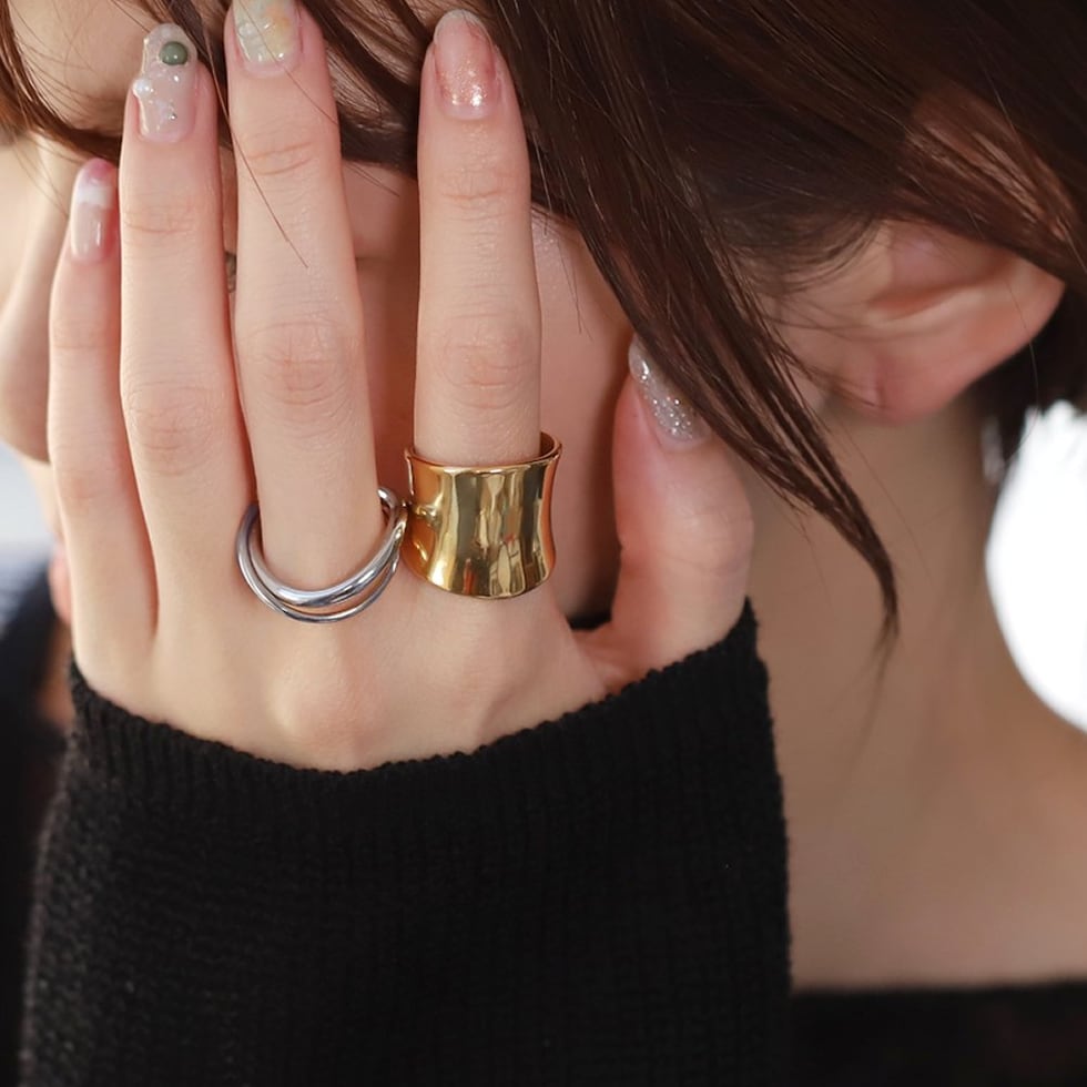 緩やかにカーブした太さの異なるリングを連ねたデザインリング。重ねての着用はもちろん、隣り合った指につけてダブルフィンガーリングとしても◎錆びにくく傷に強いステンレス製で、デイリーに活躍してくれます。長時間の着用も安心の低アレルギー素材です。