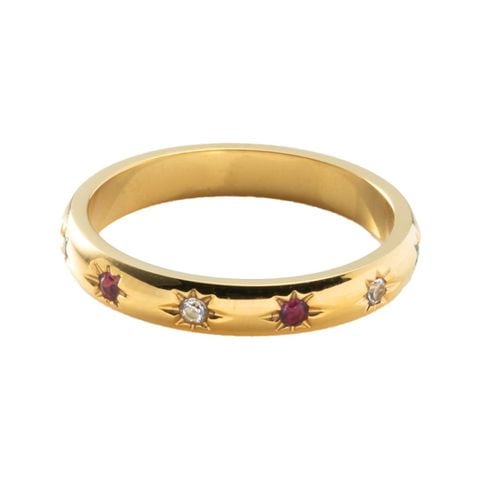 星のような掘りを入れたスターセッティングにビジューが輝くリング。アクセントの効いたマルチカラーで、手元コーデの主役にぴったり。絶妙な3mm幅で他のリングとも合わせやすい一品です。錆びにくく傷に強いステンレス製で、デイリーに活躍◎長時間の着用も安心の低アレルギー素材です。