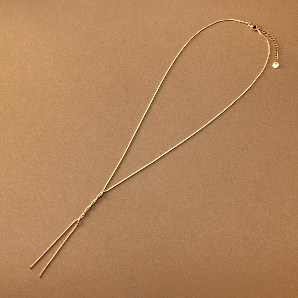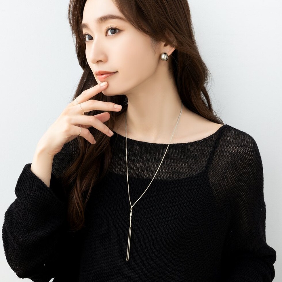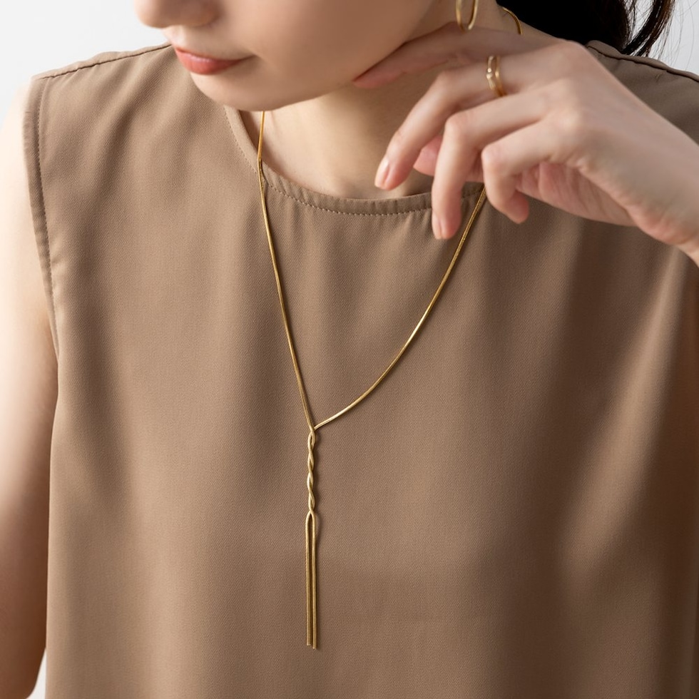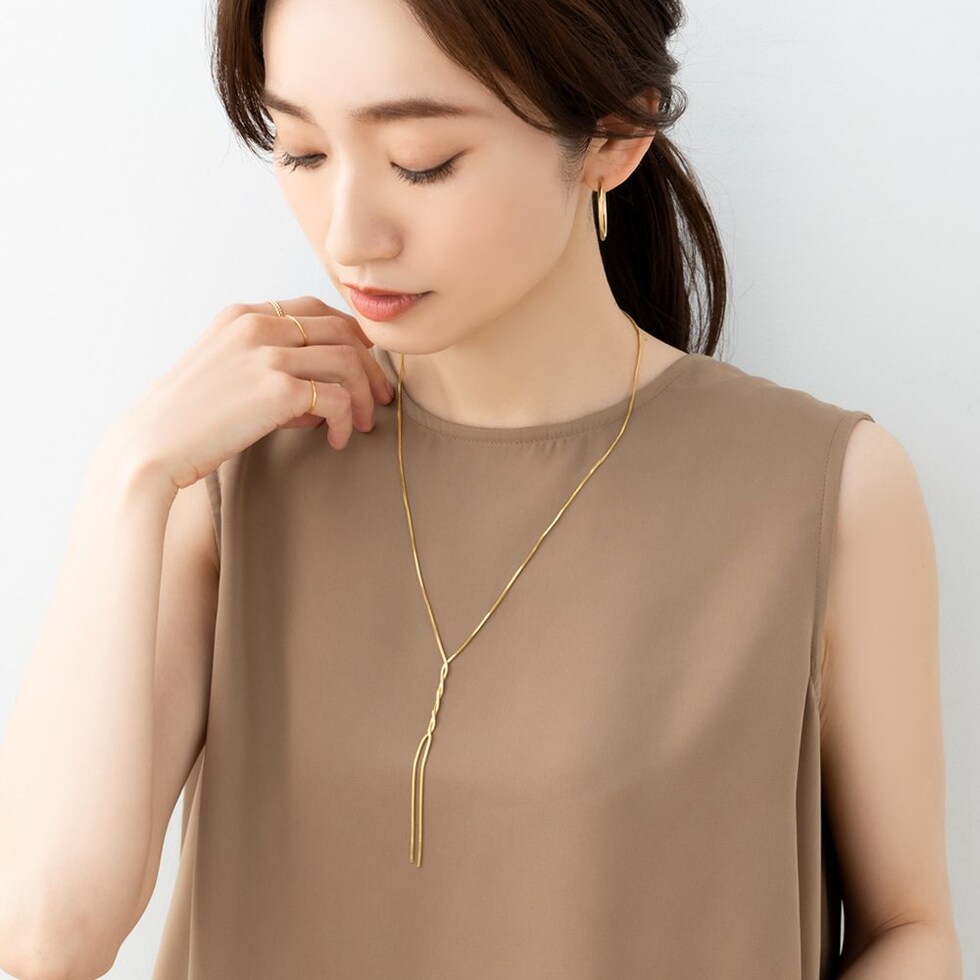 しなやかなスネークチェーンのロングネックレス。ツイストを加えたデザインが、スマートで大人な印象を演出します。無駄のない洗練されたラインで、スッキリとした品の良い艶めきをプラスしてくれるひと品。
