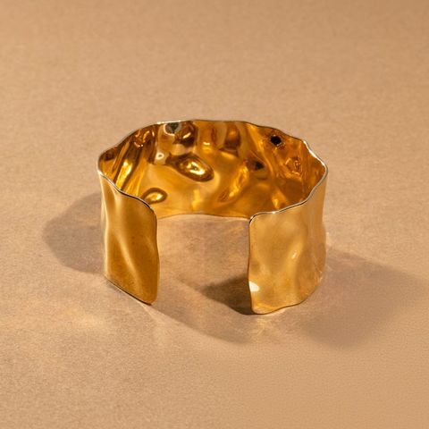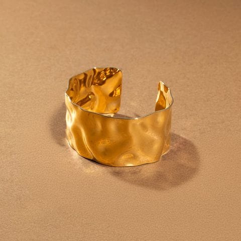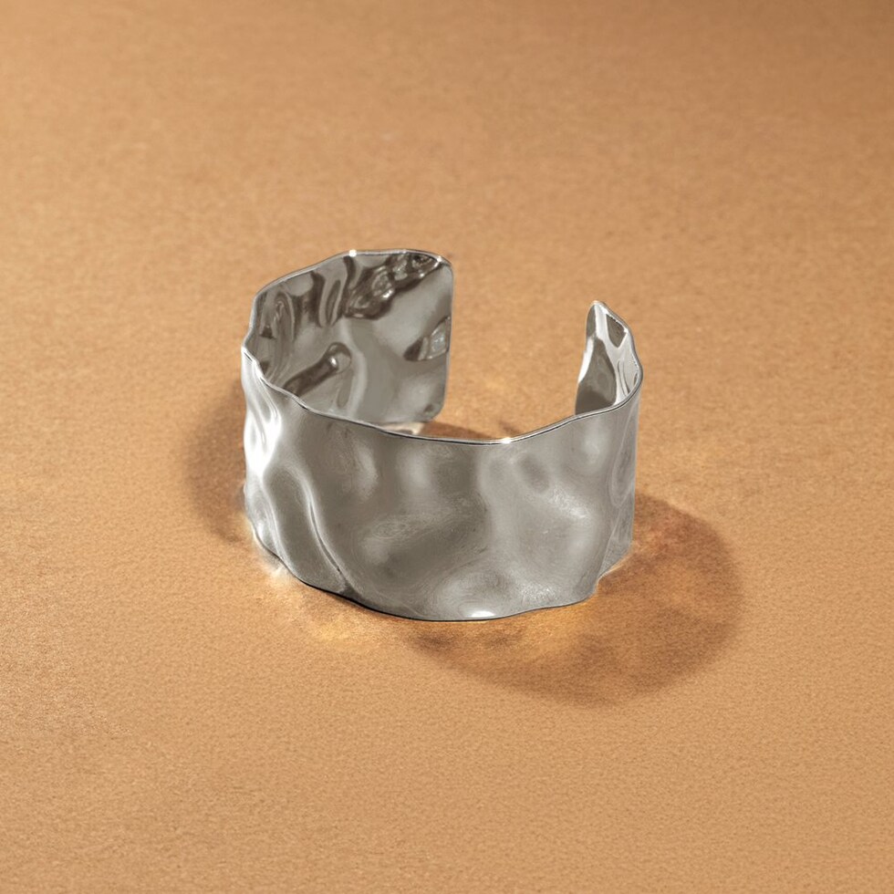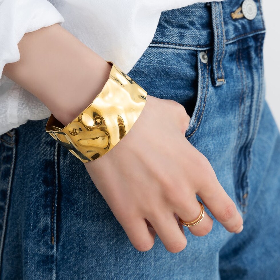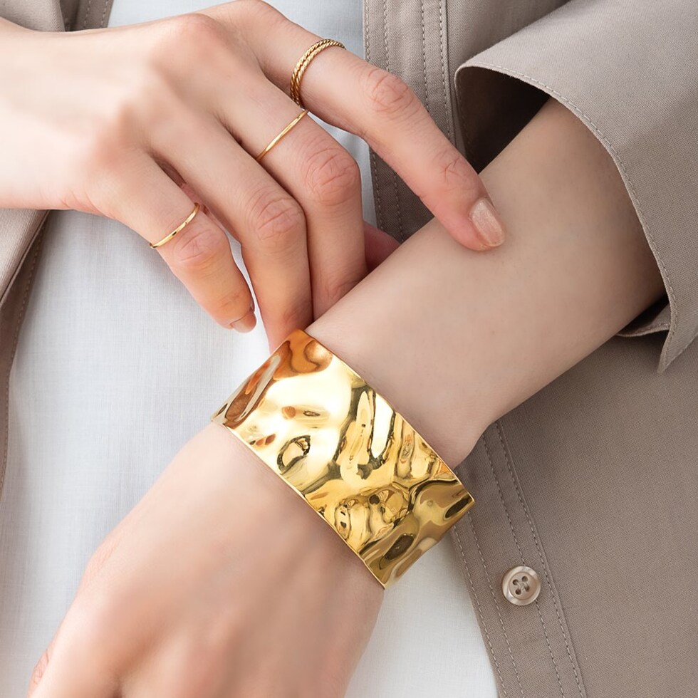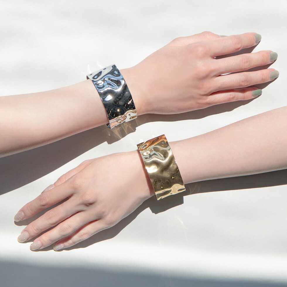 たたき加工を施したメタルワイドのバングル。艶感とボリュームあるサイズ感が視線を引き付ける。シンプルながらも存在感抜群のデザインが大人コーデのアクセントにぴったりな一品です。錆びにくく傷に強いステンレス製で、デイリーに活躍しそう。