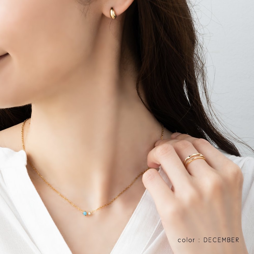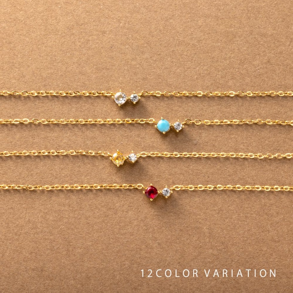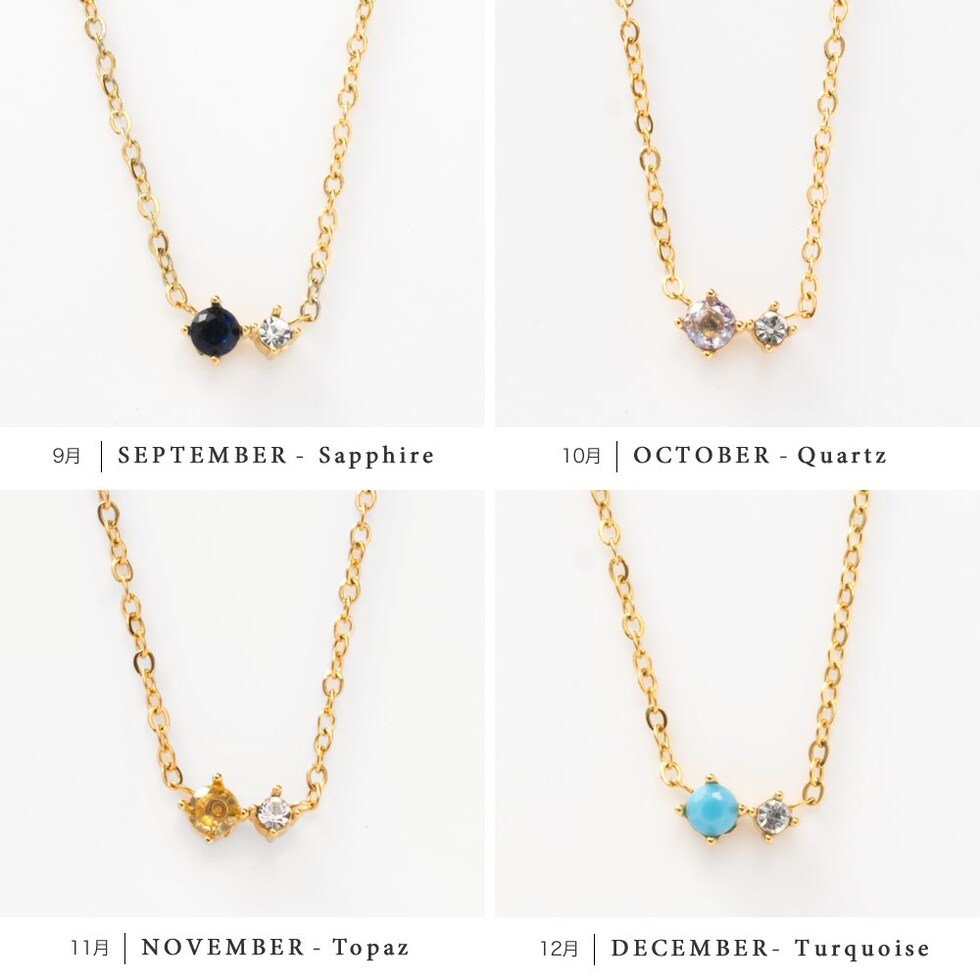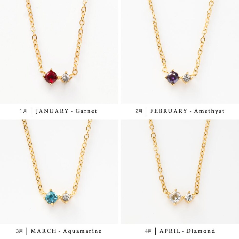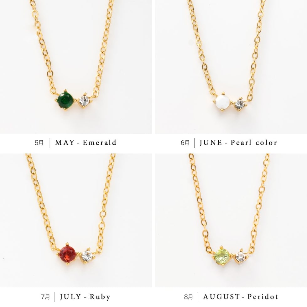 大小2色のビジューがキラキラと煌くネックレス。上品で使い勝手の良い小ぶりのモチーフはプレゼントにもオススメ◎誕生月をイメージしたビジューがコーデにさりげなくアクセントを添えてくれます。シンプルなデザインと錆びにくく傷に強いステンレス製でデイリーに活躍間違いナシ。長時間の着用も安心の低アレルギー素材です。