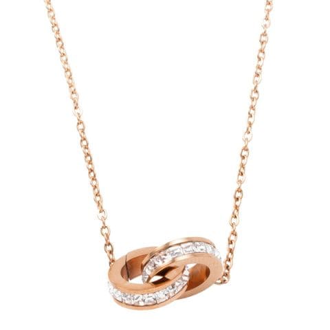 重なり合うリングが大人っぽくフェミニンなネックレス。デコルテを美しく引き立たせてくれるデザインで、流行に左右されず長くご愛用いただけます。長時間着用も安心の低アレルギーのステンレス製なので錆びにくく傷に強いからデイリー使いにぴったり◎
