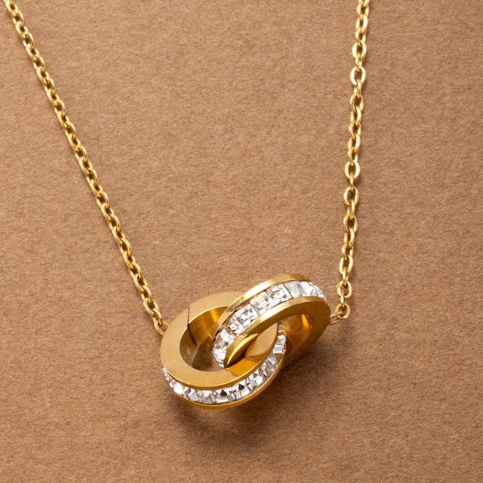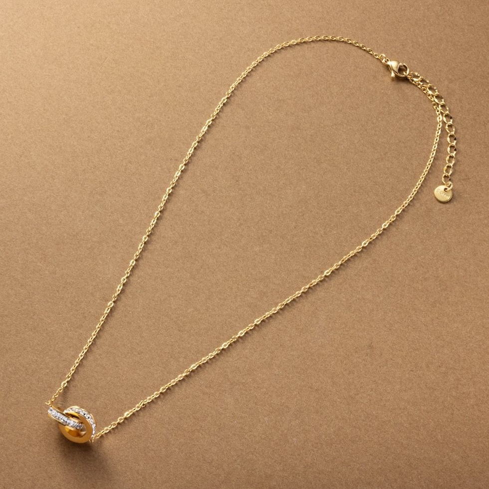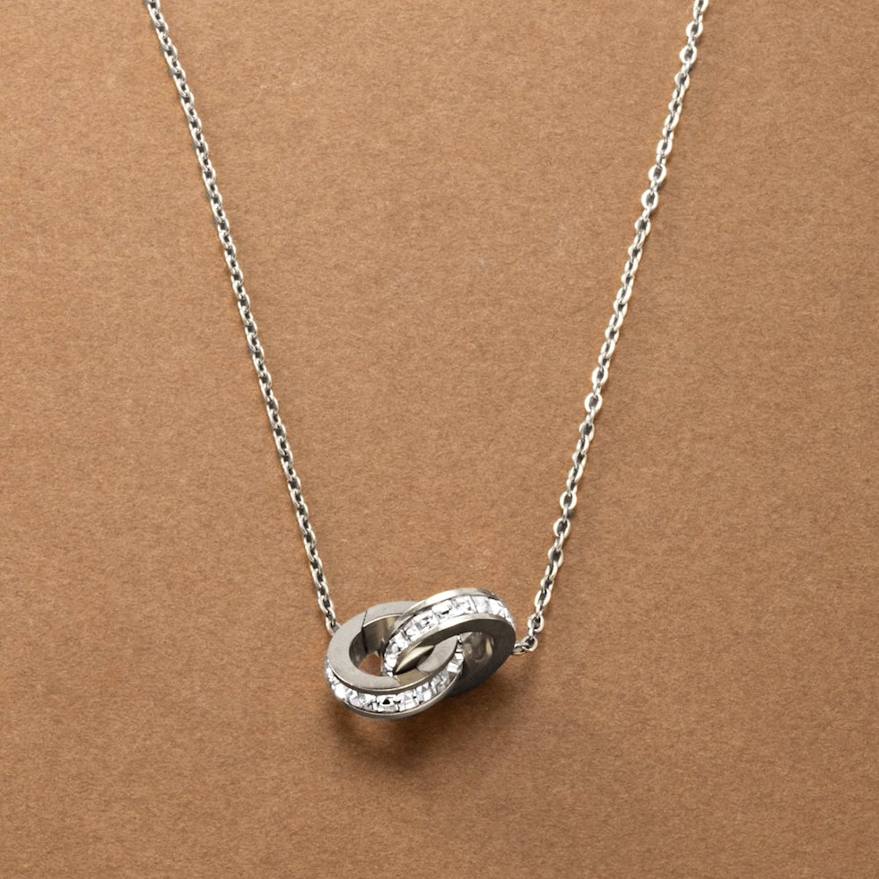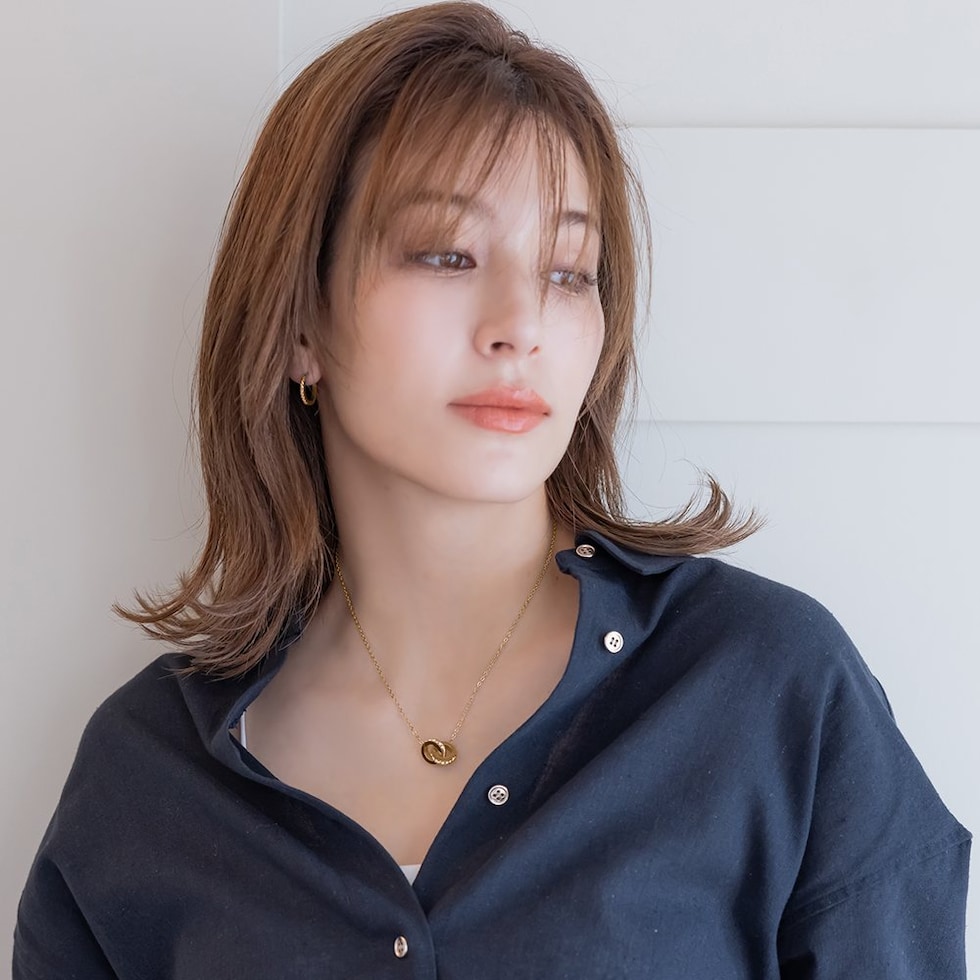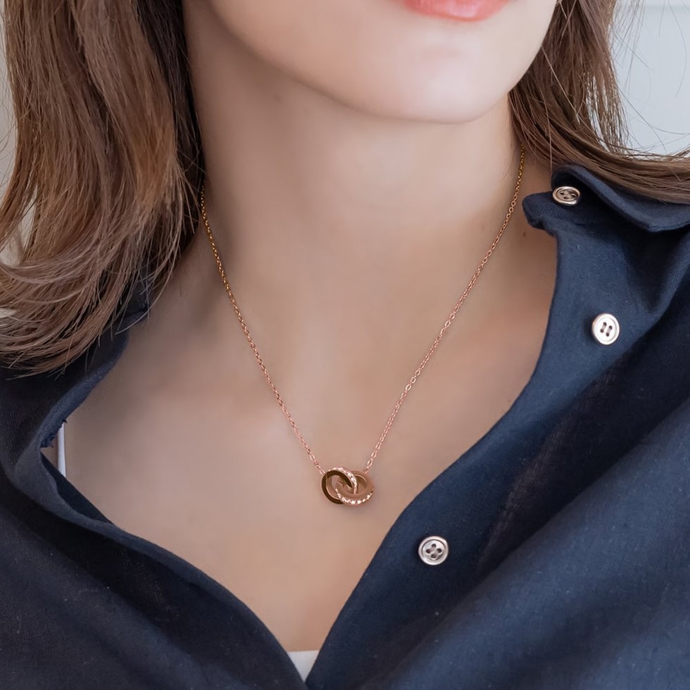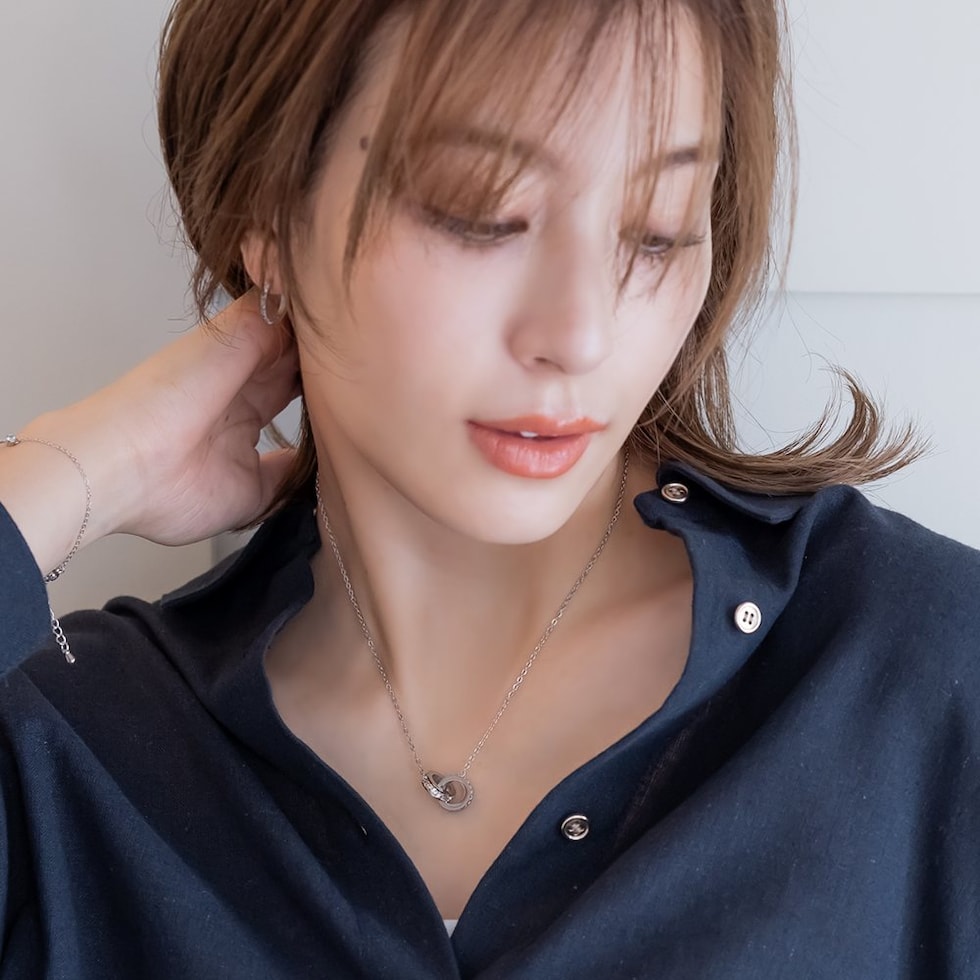 重なり合うリングが大人っぽくフェミニンなネックレス。デコルテを美しく引き立たせてくれるデザインで、流行に左右されず長くご愛用いただけます。長時間着用も安心の低アレルギーのステンレス製なので錆びにくく傷に強いからデイリー使いにぴったり◎