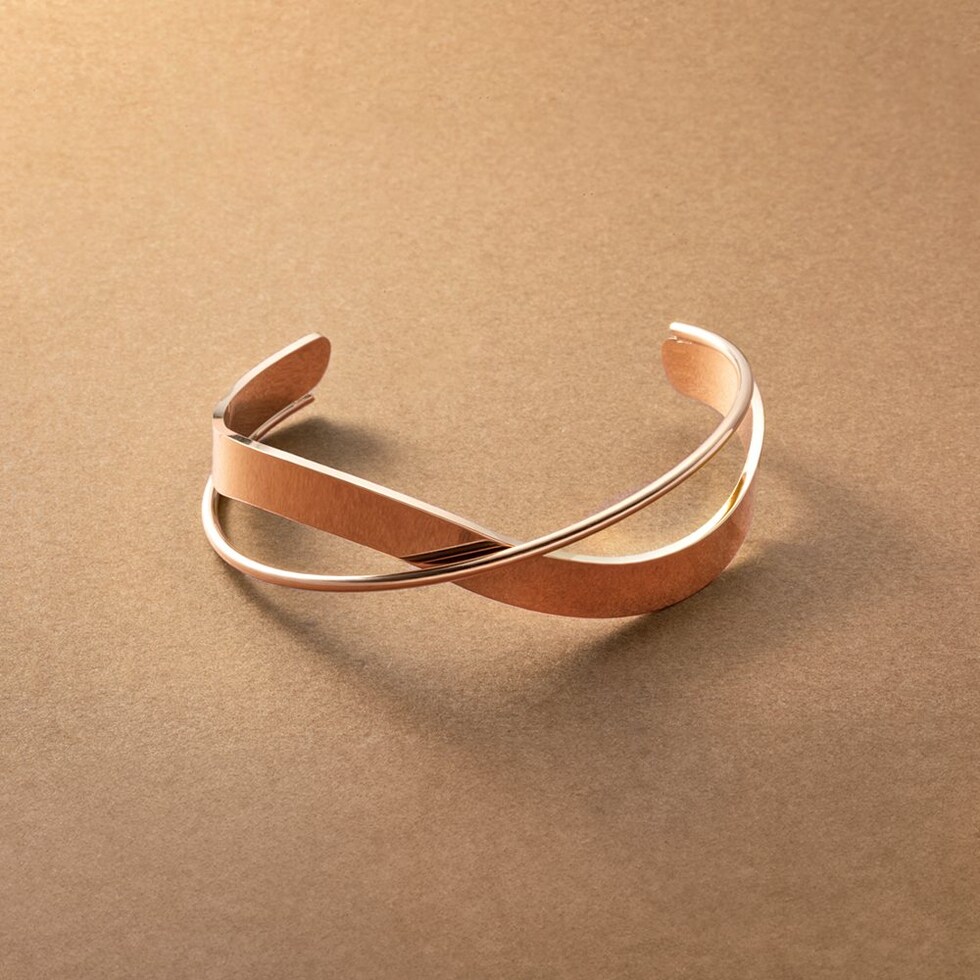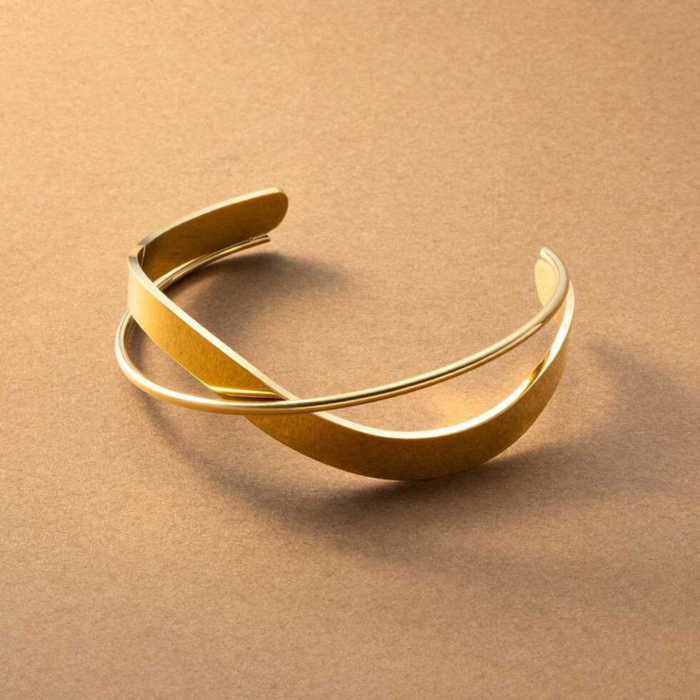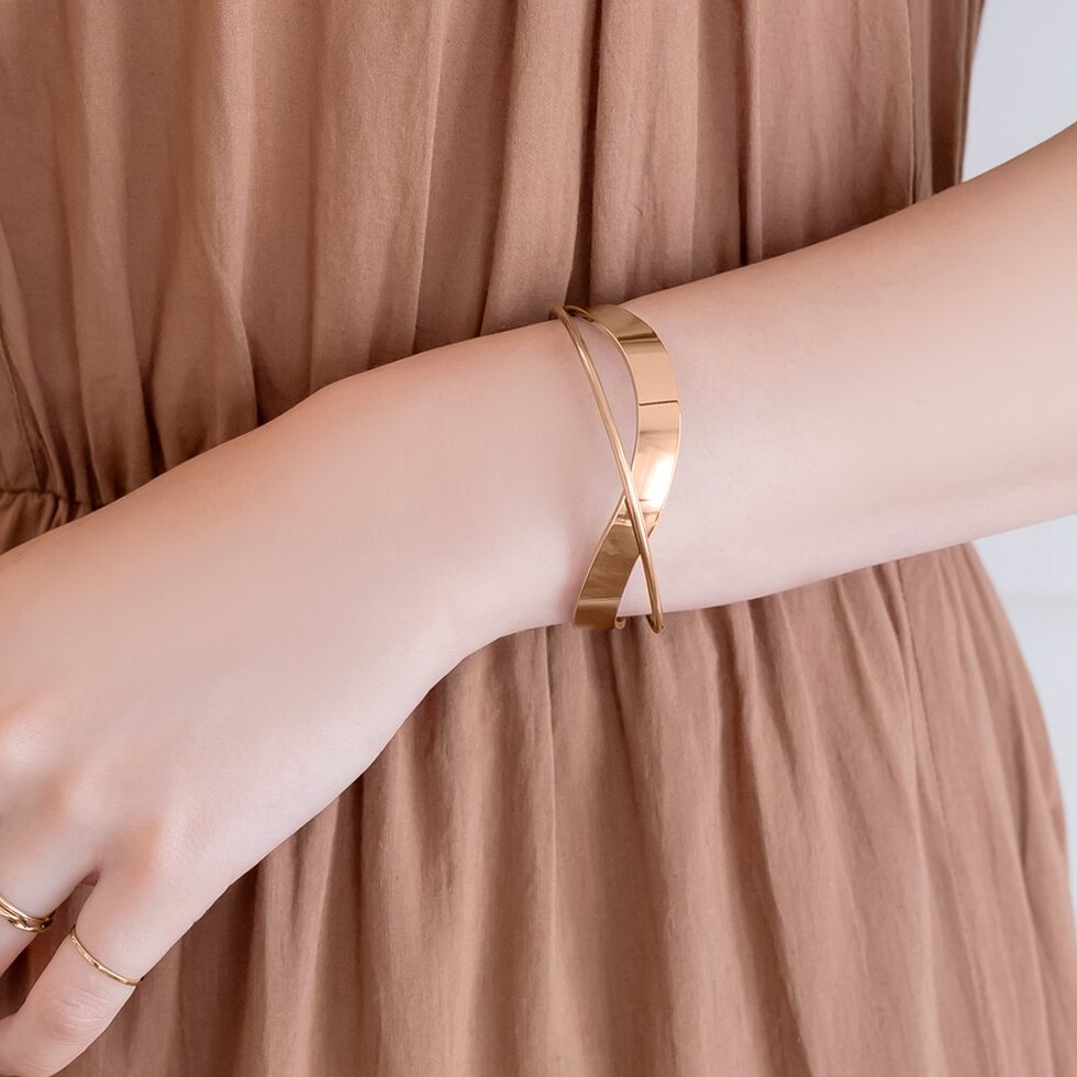 緩やかなウェーブとクロスデザインで存在感を放つメタルバングル。太さの異なるメタルが表情豊かな艶めきを放ち、手元を印象的に仕上げます。サッと着けるだけでこなれた雰囲気を演出するひと品。