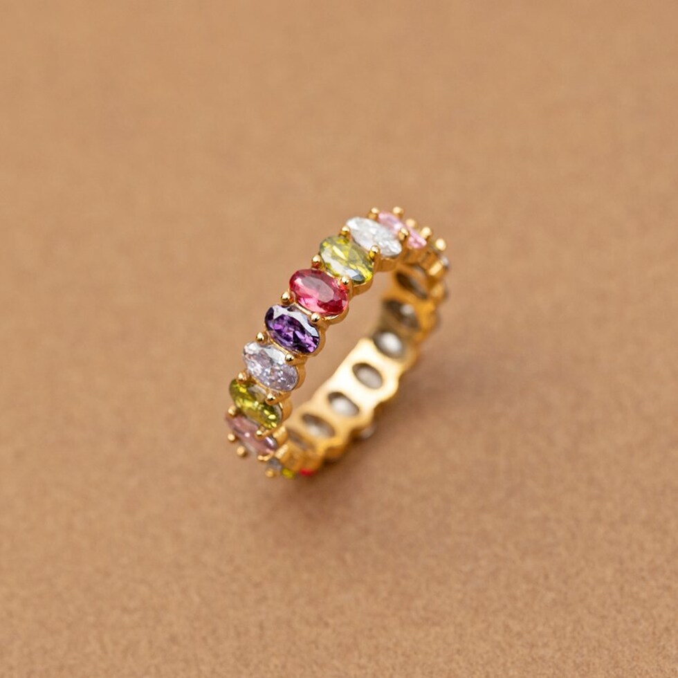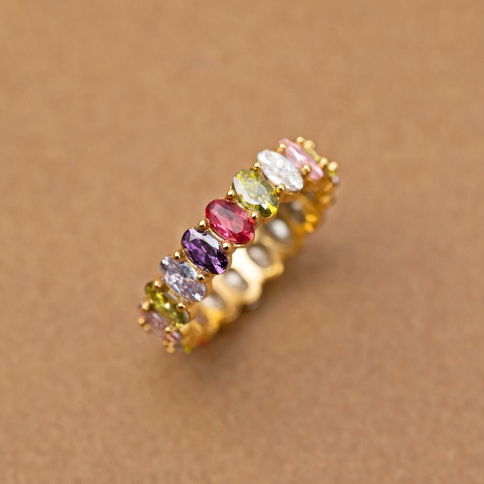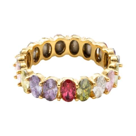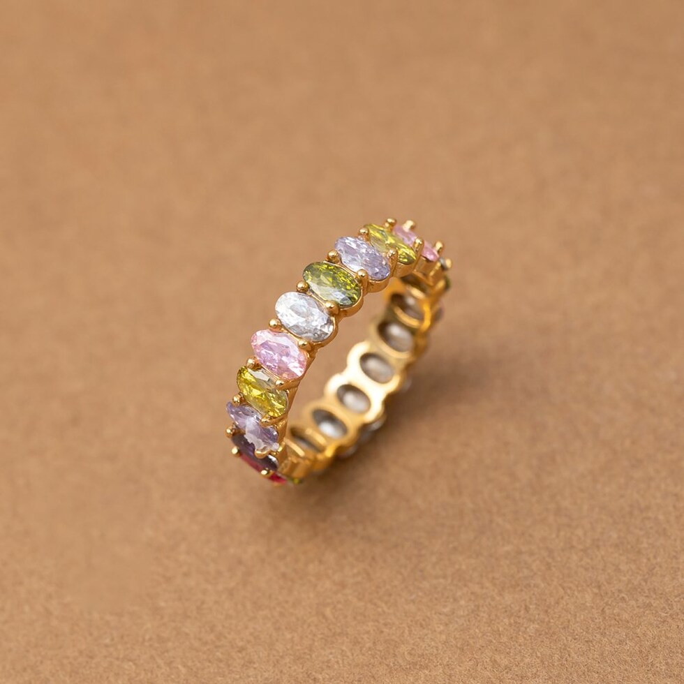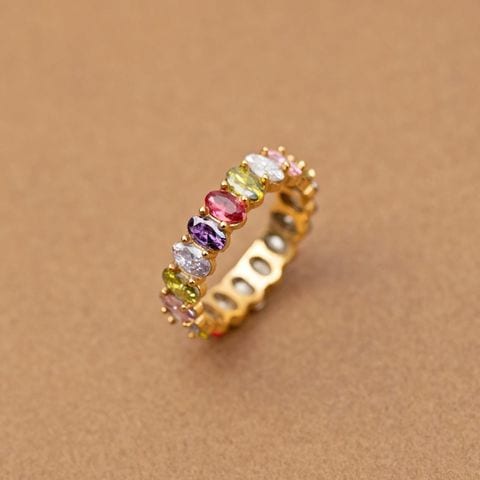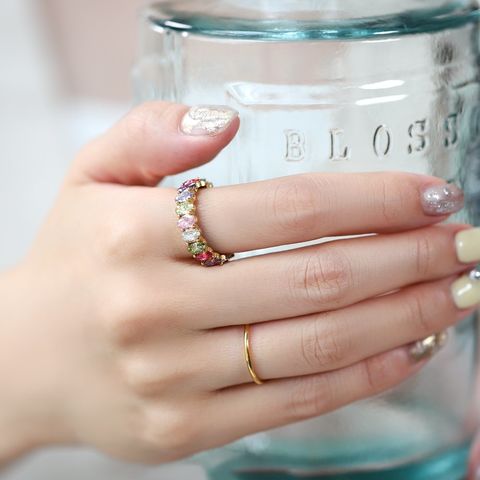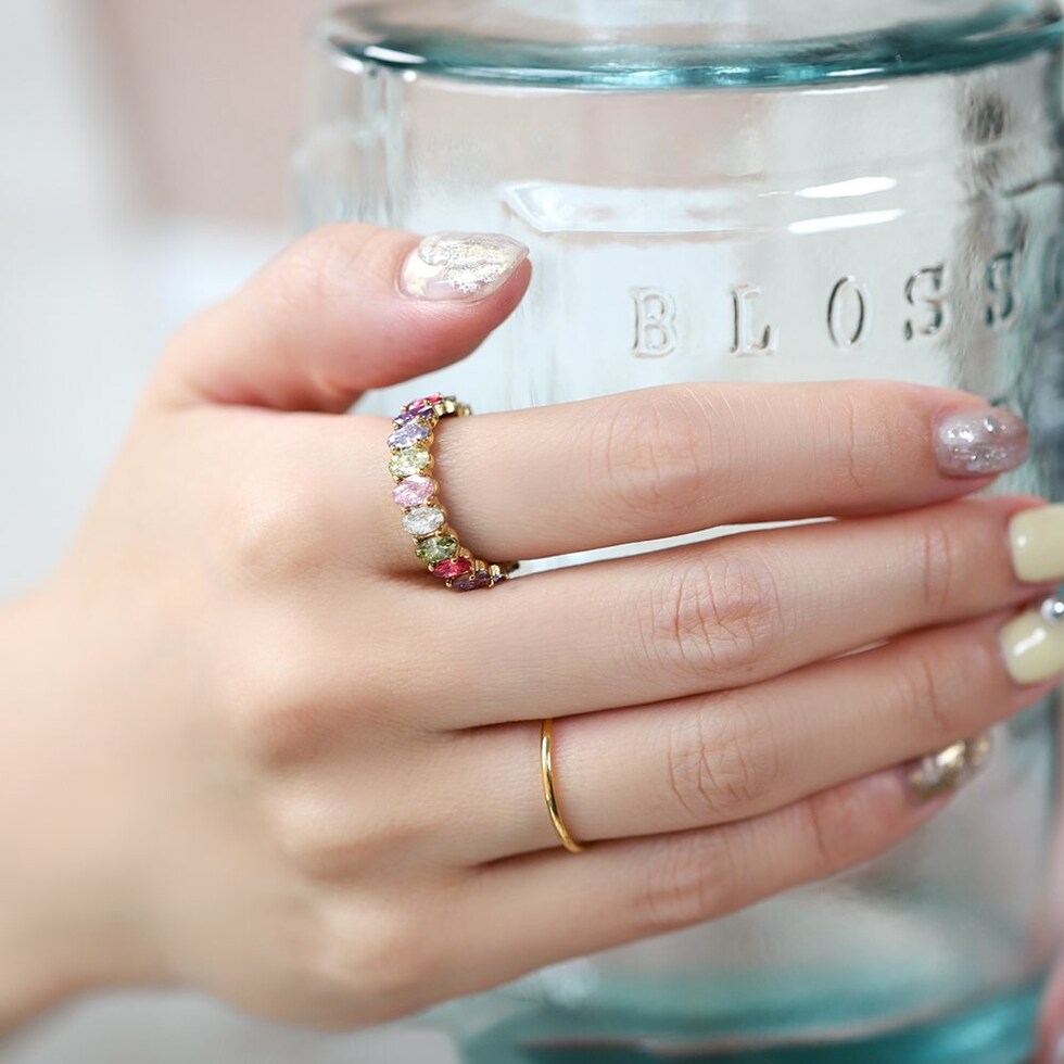 心くすぐるマルチカラーが煌めくリング。色鮮やかでカラーパレットのようなビジューが一周したデザインで手元を華やかに彩ります。サッと着けるだけでシーズンライクなオシャレを楽しめるひと品。