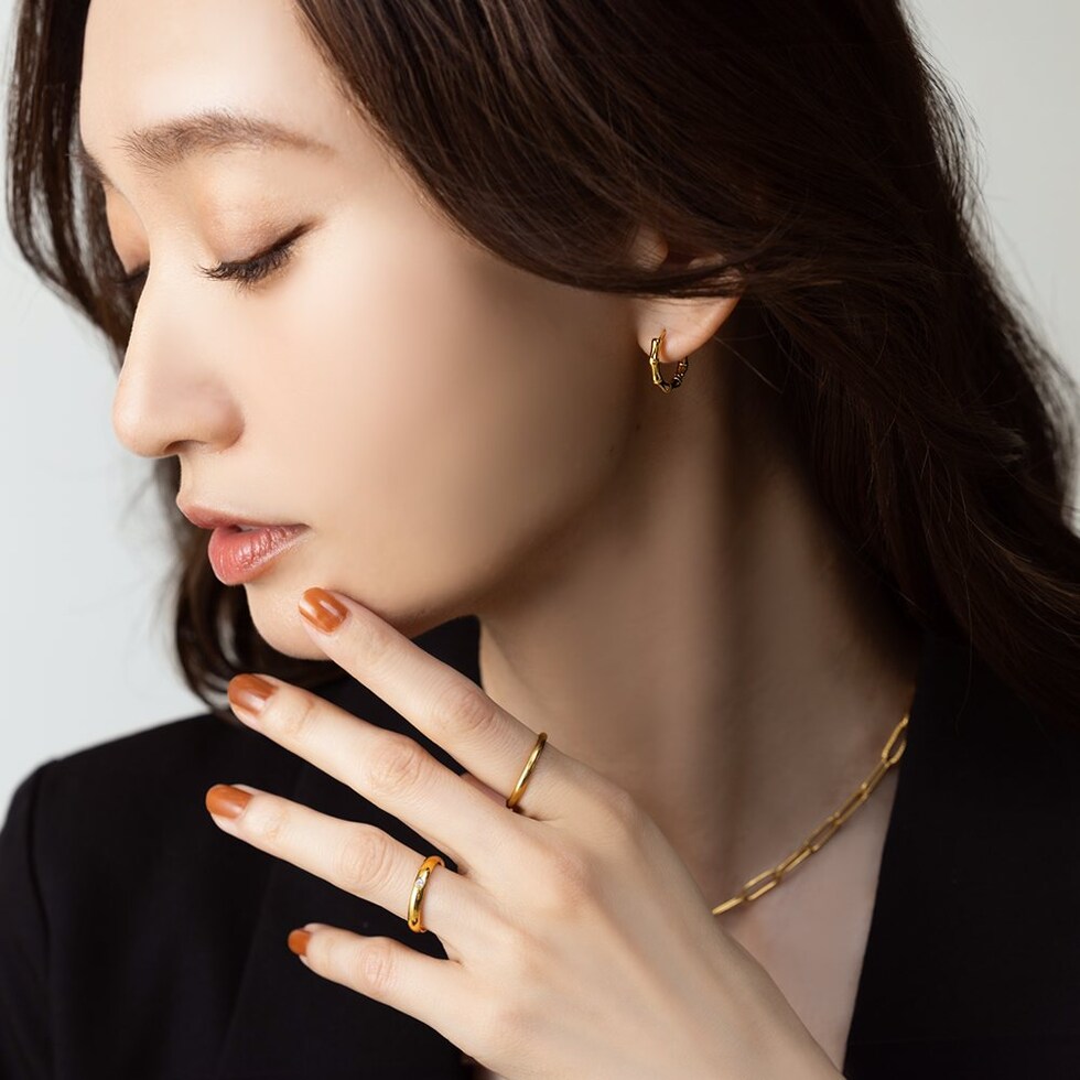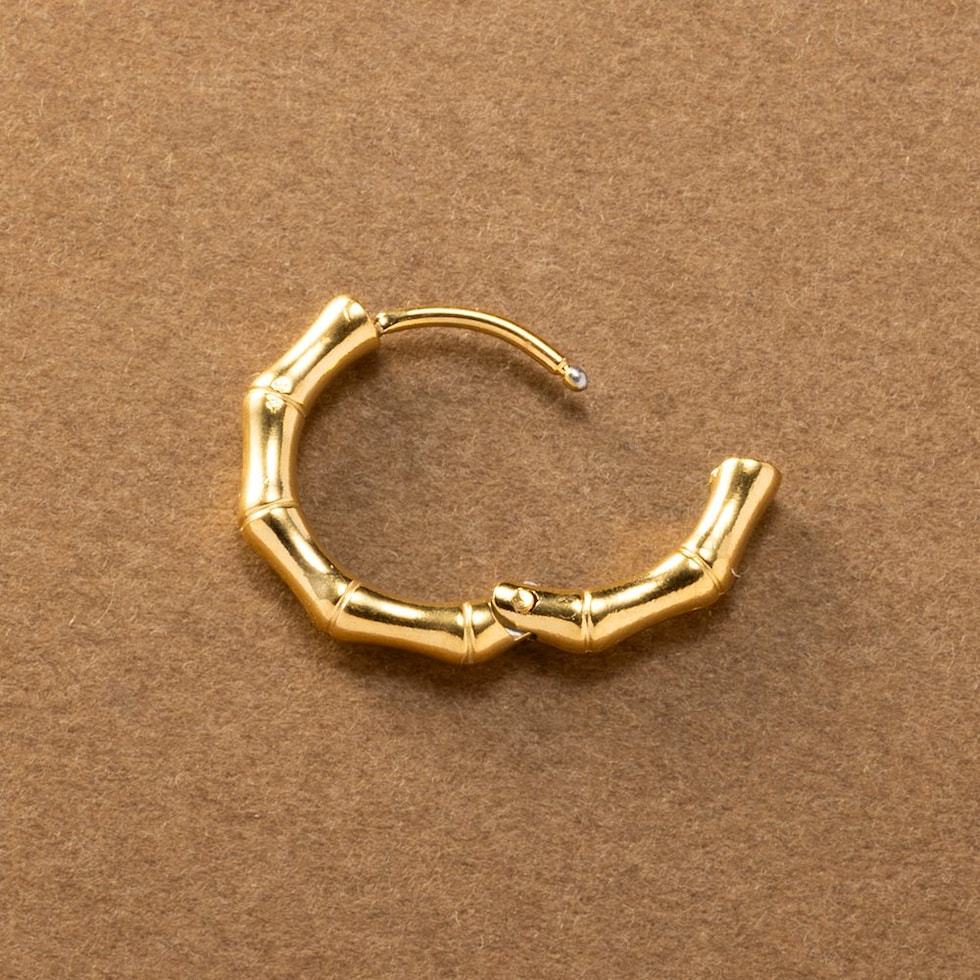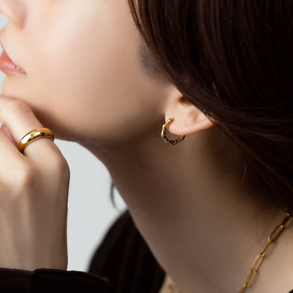 品良く艶めくバンブーデザインのステンレス製フープピアス。開閉式のキャッチレスタイプで簡単に装着できるのも嬉しいひと品◎ちょっぴり個性をプラスしたデザインと、程よいサイズ感でオンオフ問わず活躍してくれるアイテムです。