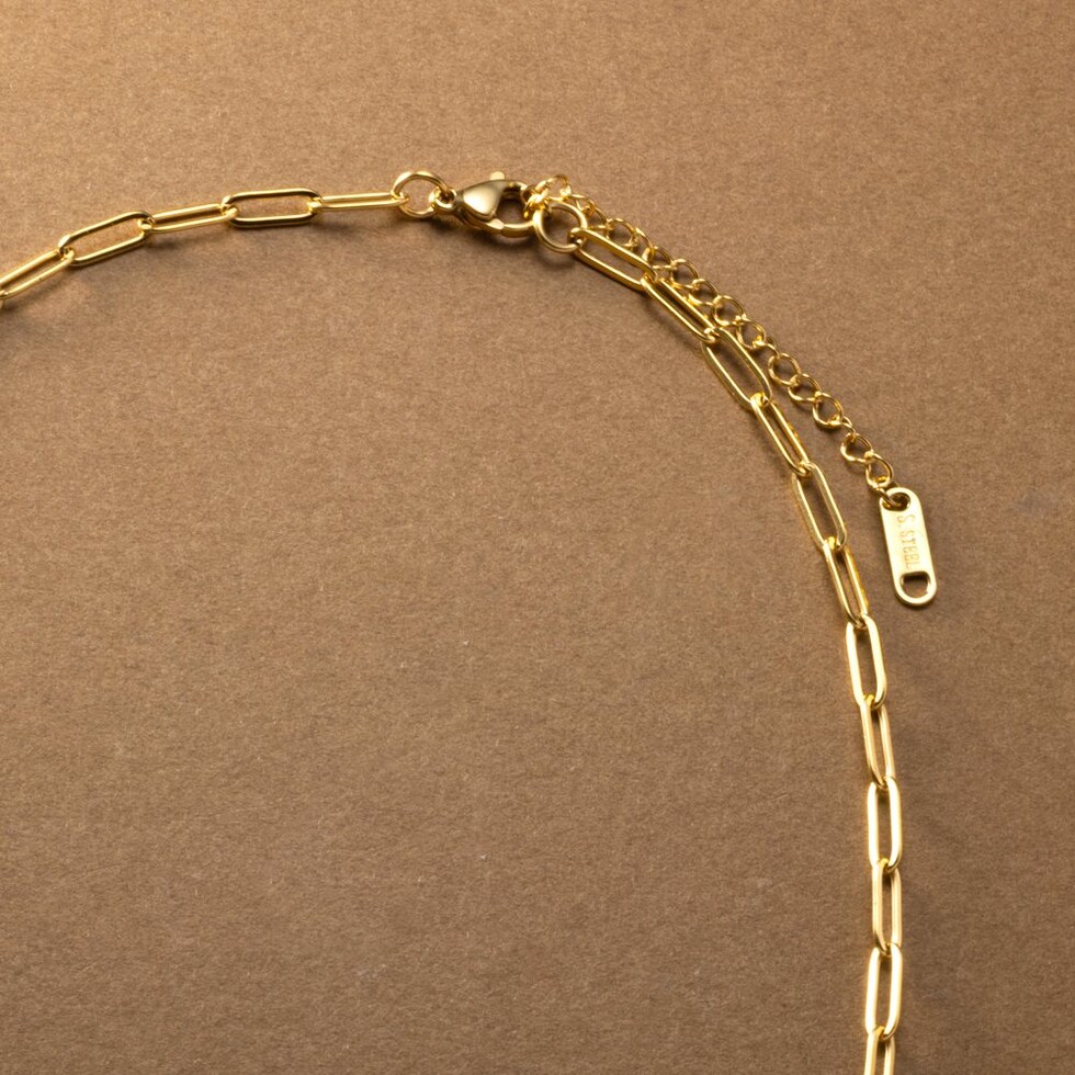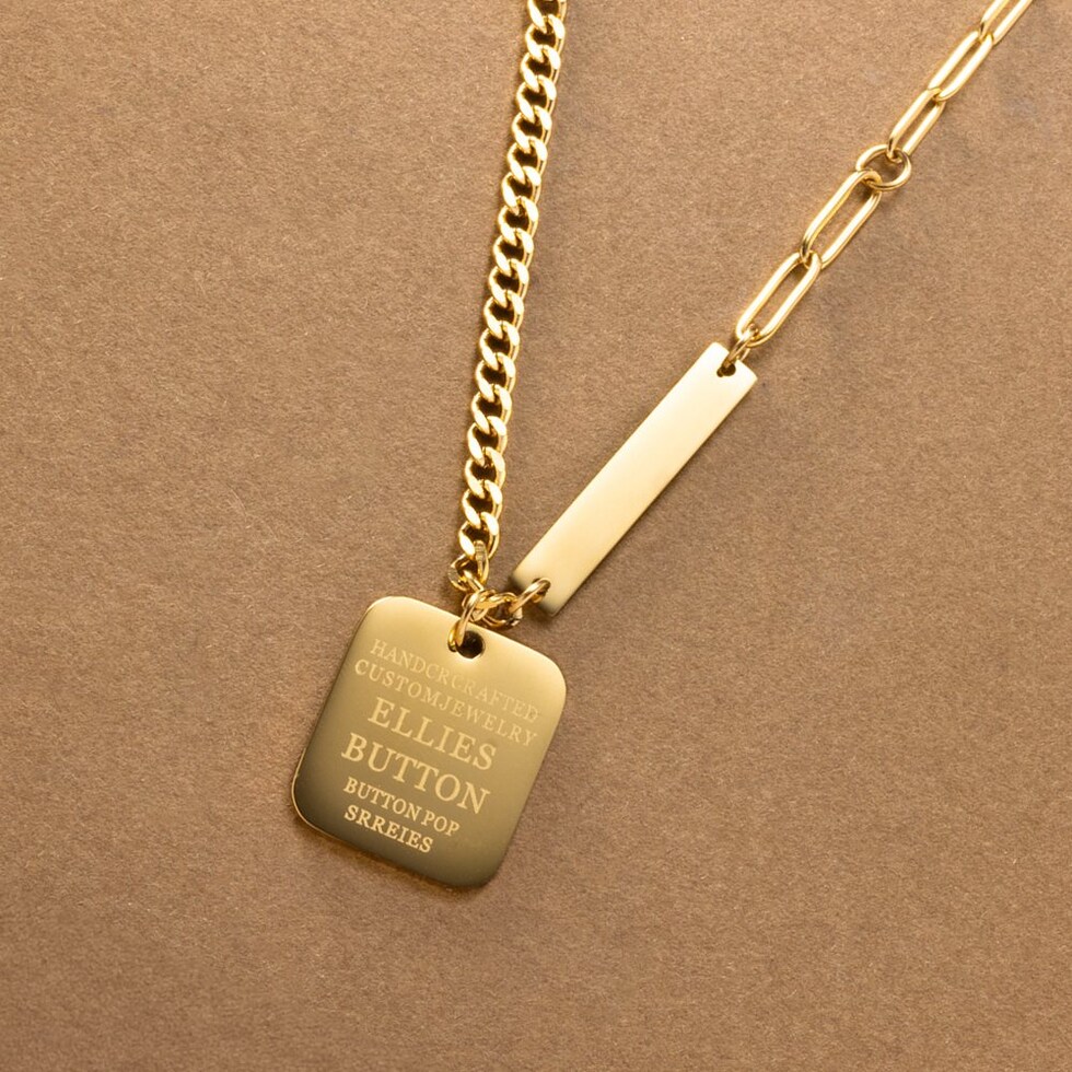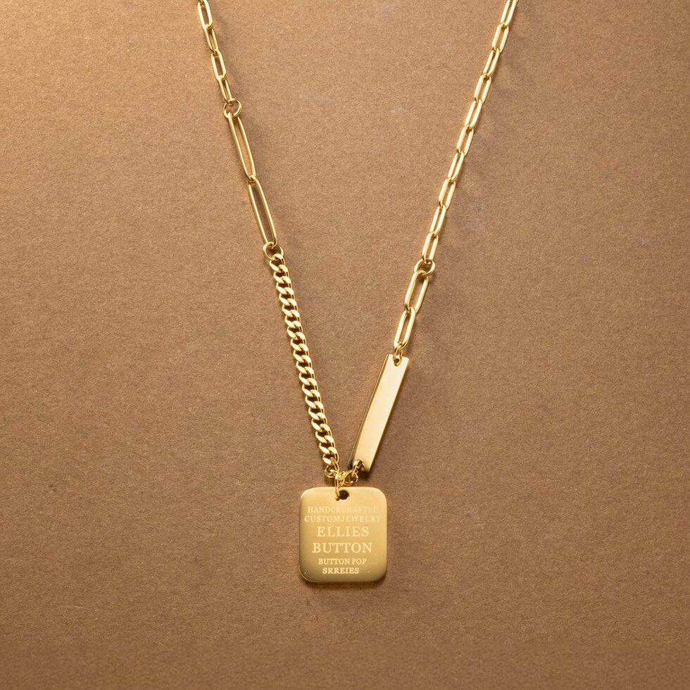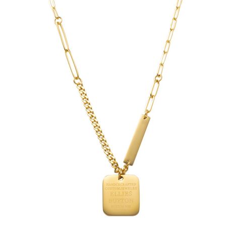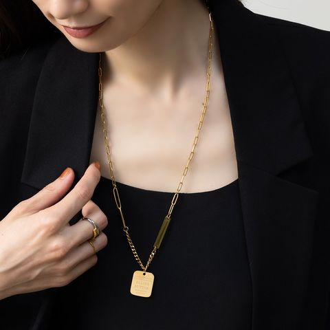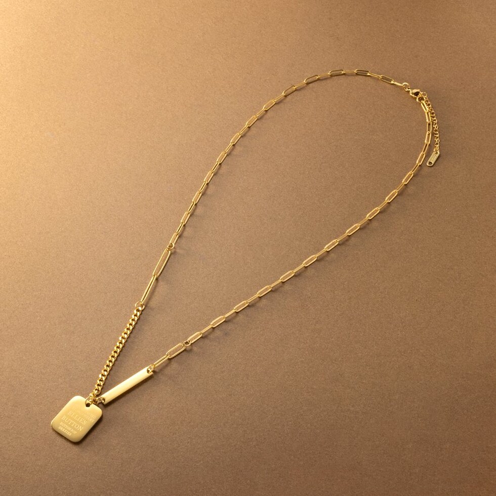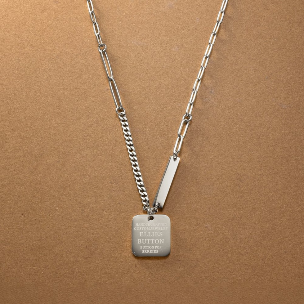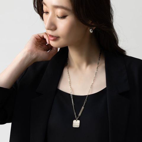 切り替えデザインチェーンとメッセージプレートを組み合わせたネックレス。太さや形の異なる数種のチェーンを組み合わせたエッジの効いたデザインが、スタイリングのアクセントに◎肌馴染みもよく錆びにくいステンレス製だからデイリー使いにぴったりの一品です。