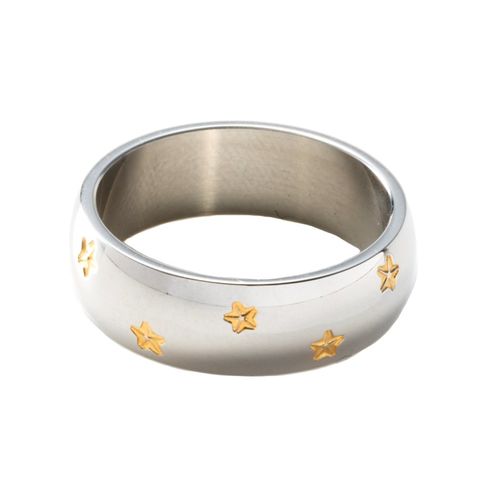 スター刻印がさりげないステンレス製ワイドリング。ゴールドカラーの小さな星を散りばめたデザインと、ぷっくり艶めくメタルフォルムが遊び心をくすぐられるひと品。今っぽいこなれた印象に仕上がるオススメのアイテムです