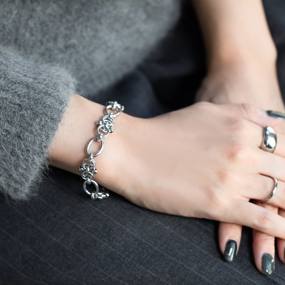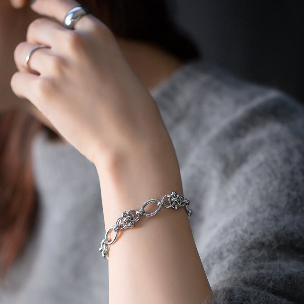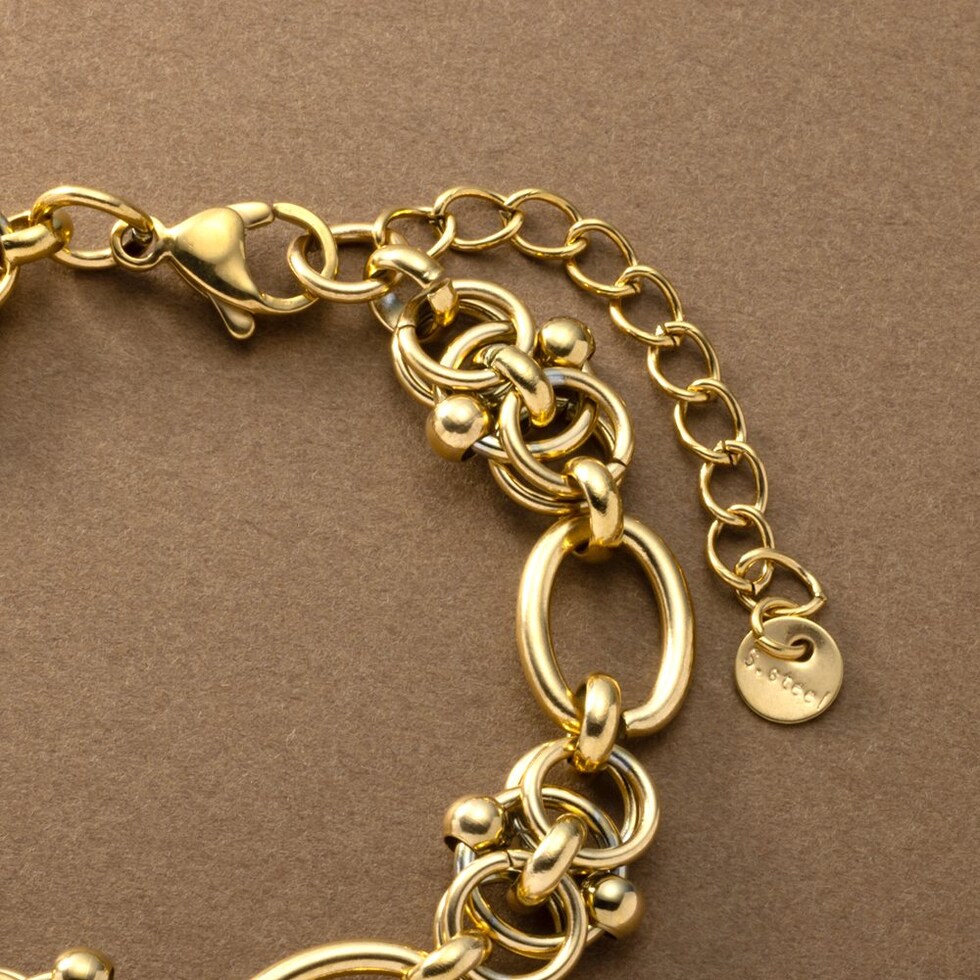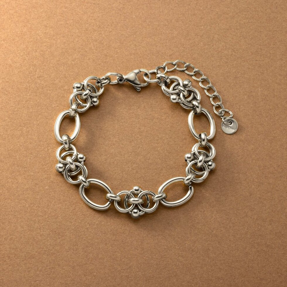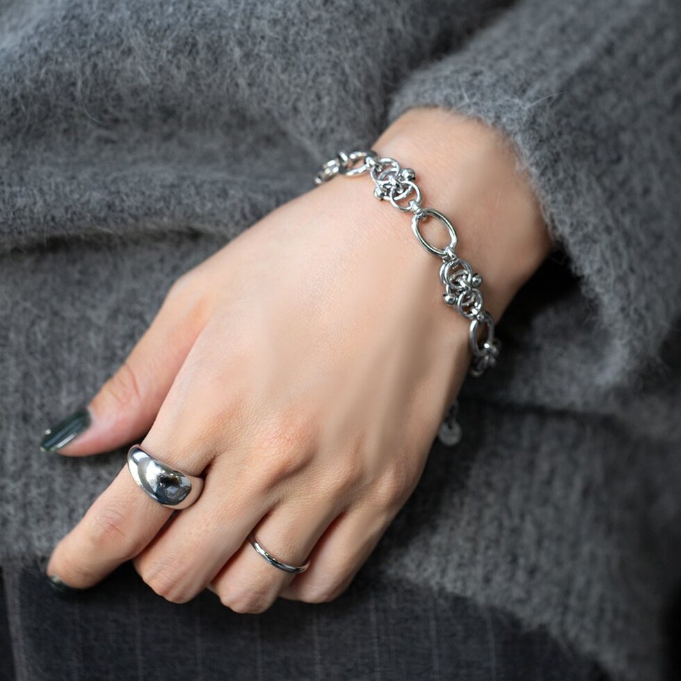 オーバルチェーンや小粒のメタルボールをMIXしたブレスレット。重厚感たっぷりなワイドデザインで他とはひと味違った洗練された手元に導きます。シンプルやカジュアルコーデに映える存在感抜群なアイテム◎錆びにくいステンレス製でデイリーに活躍しそう。