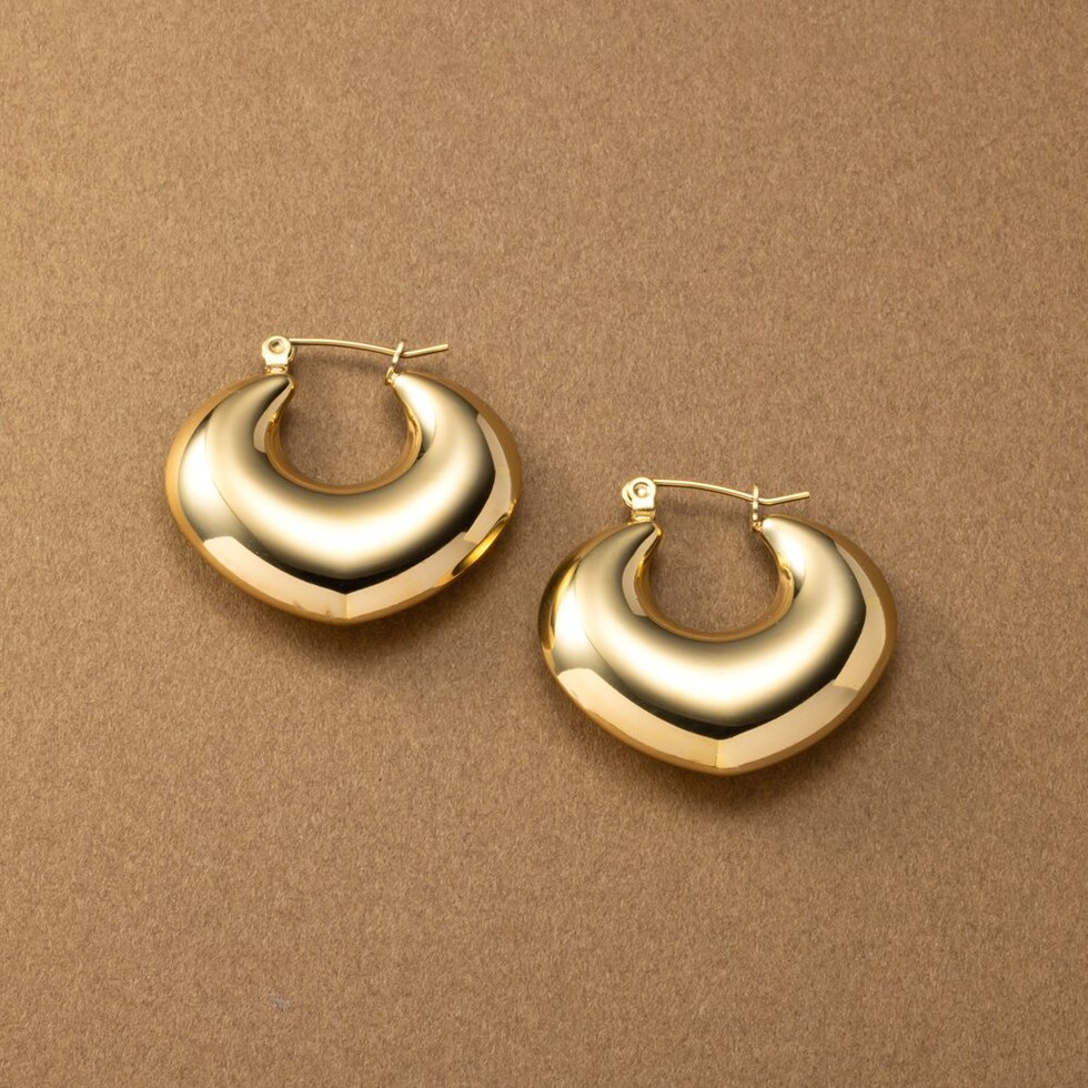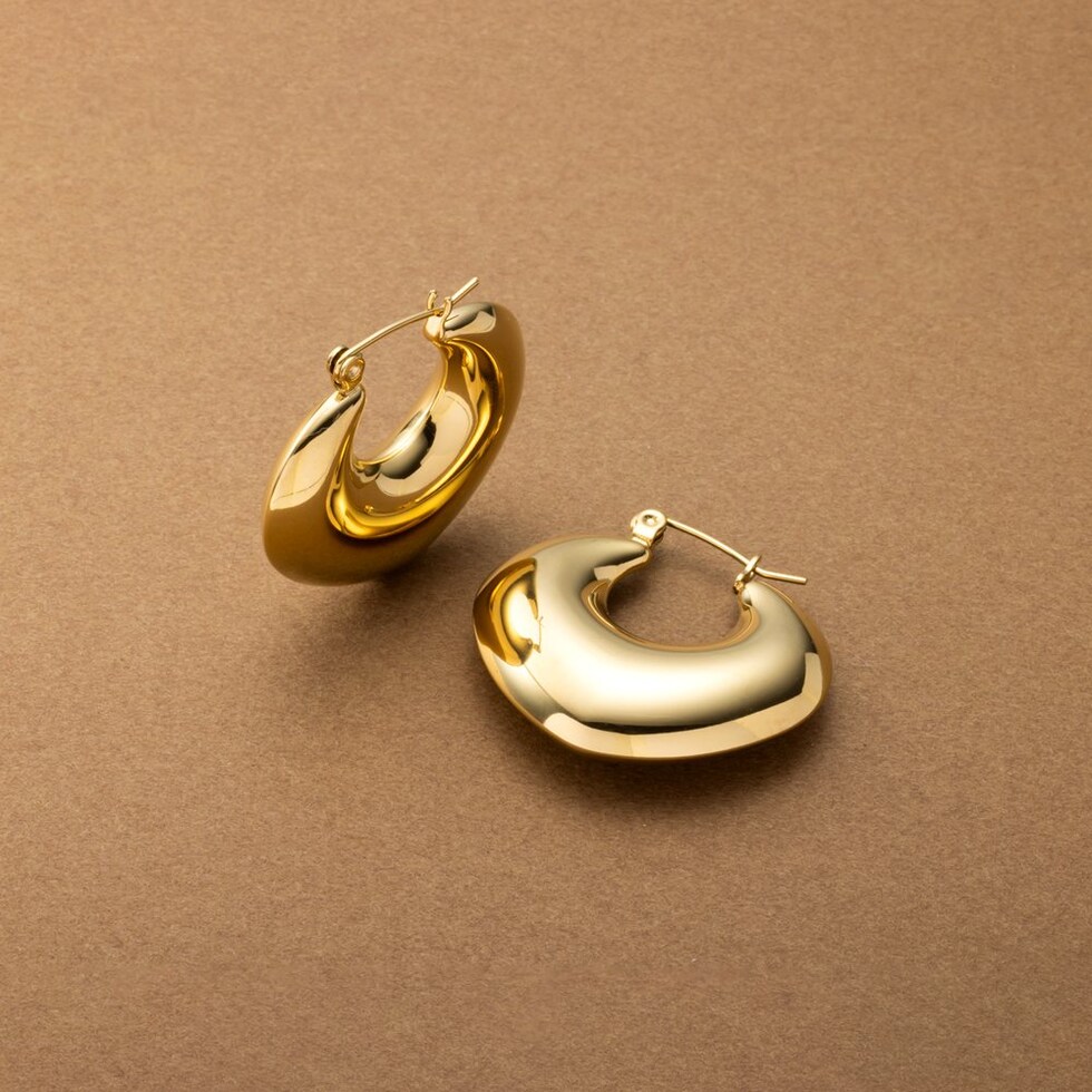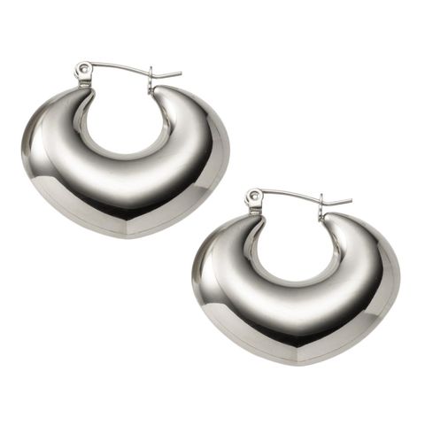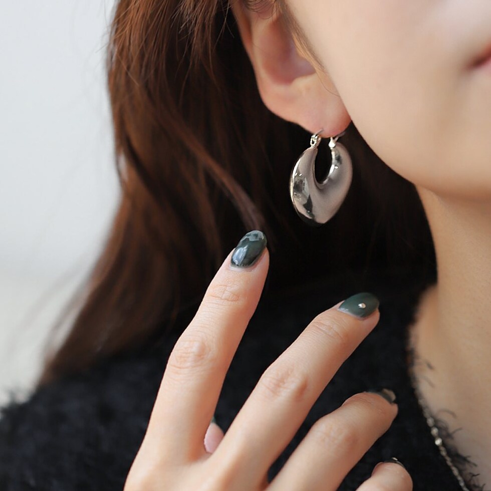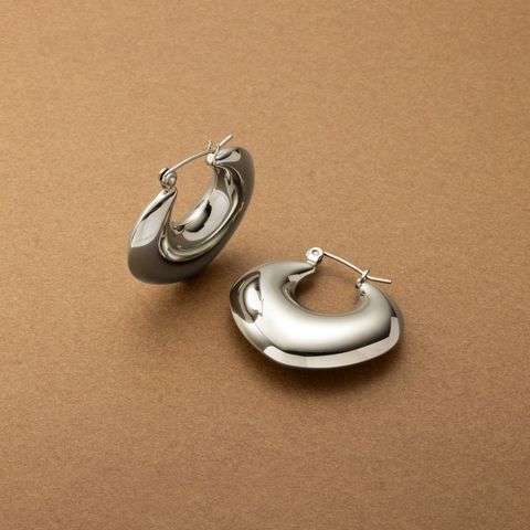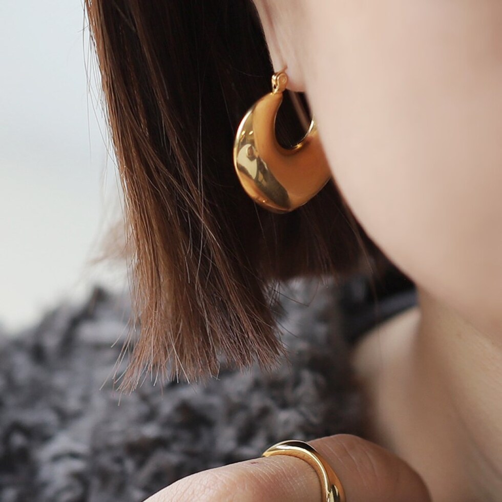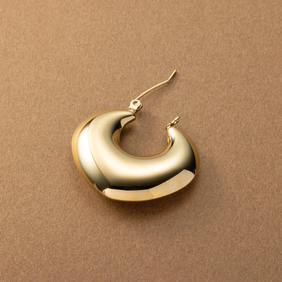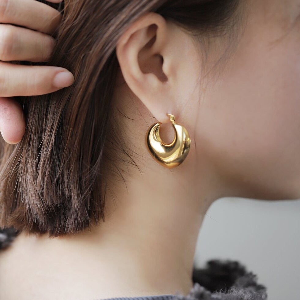 ぷっくりサークルのステンレス製フープピアス。下に向かって広がるぷっくりフォルムとメタルの艶感が大人っぽさ際立てる定番デザイン。見た目よりも軽いから痛くなりにくいのもgood。錆びにくいステンレス製でデイリーに活躍しそう◎