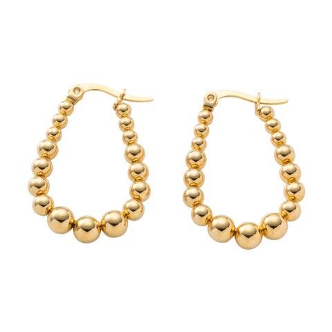 大きさの異なるメタルボールを連ねたようなキャッチレスフープピアス。メタルの艶めきと個性的な形が目を惹くデザインで、横顔をグッと印象づけてくれます。キレイめはもちろんカジュアルスタイルにもおすすめです。錆びにくく傷に強いステンレス製で、長時間の着用も安心の低アレルギー素材です。
