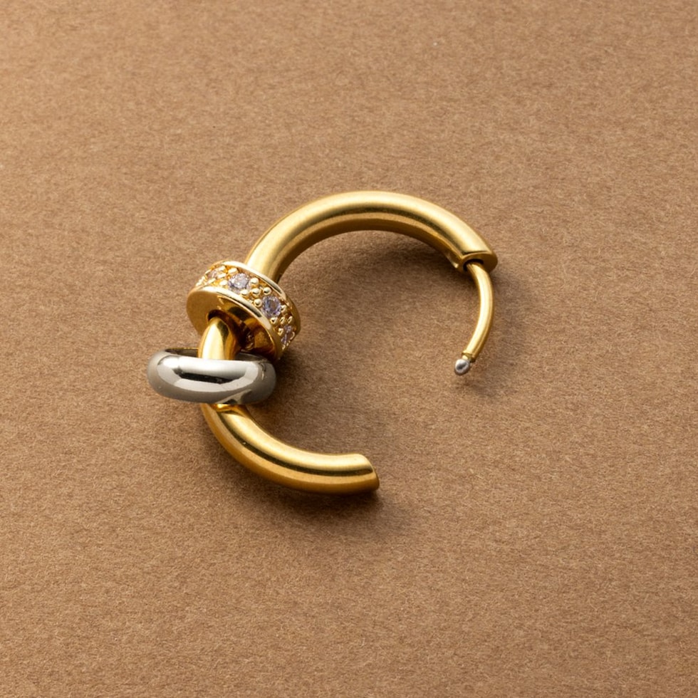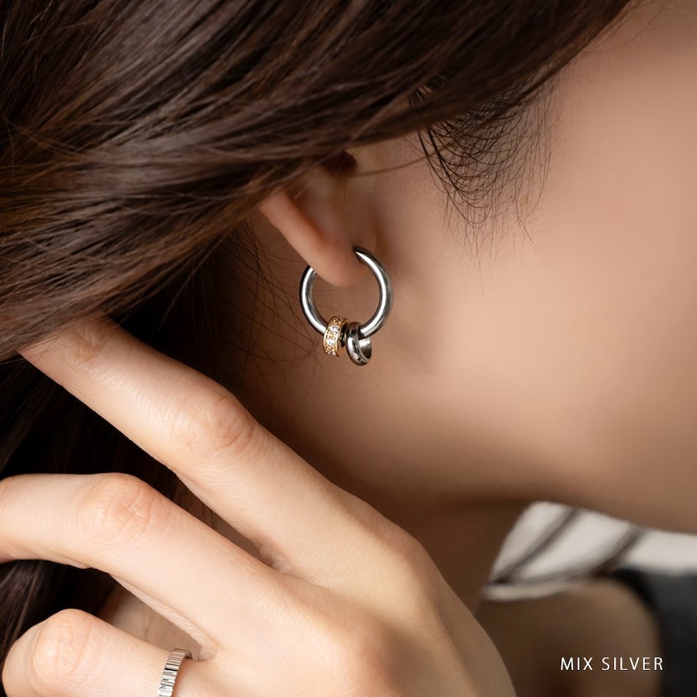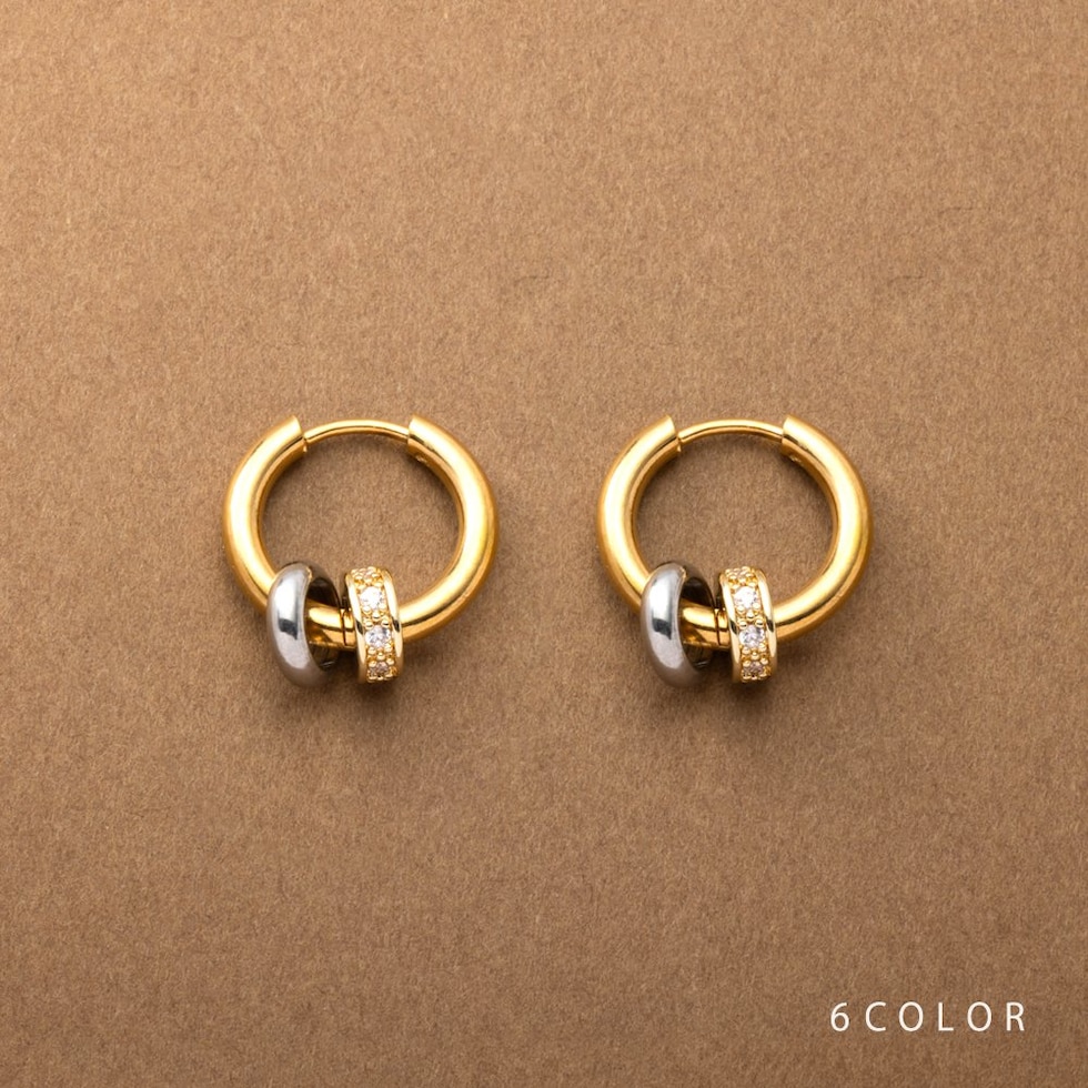 3WAYで“使える”バイカラーリングのステンレス製キャッチレスフープピアス。2つのリングは取り外し可能でアレンジ自由自在。流行りに流されないオトナ上品なシンプルデザインで長い期間重宝しそう。錆びにくいステンレス製でデイリーに使えちゃいます◎