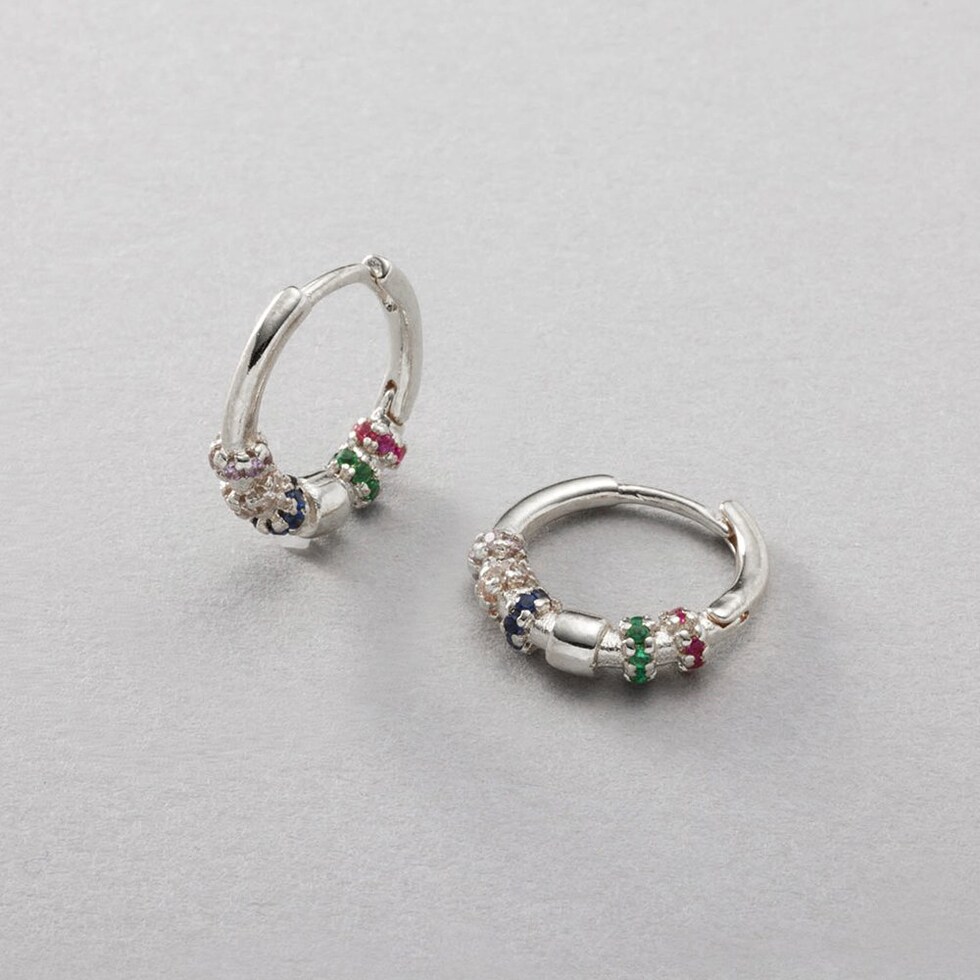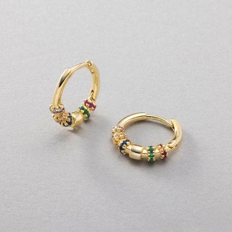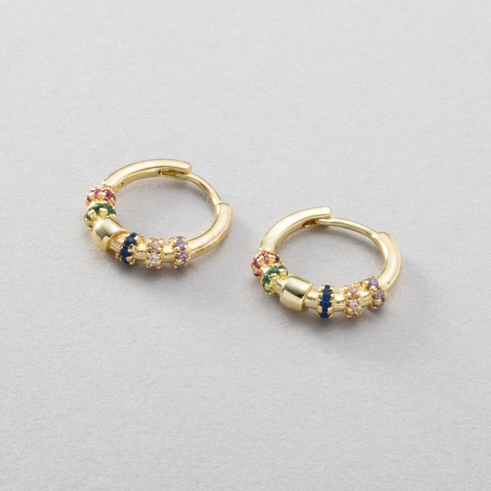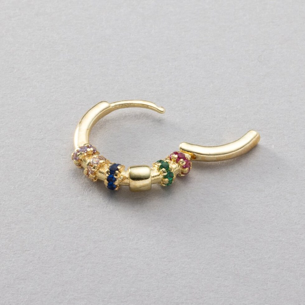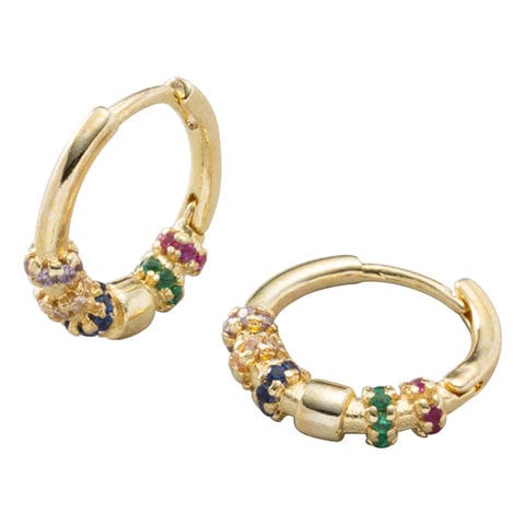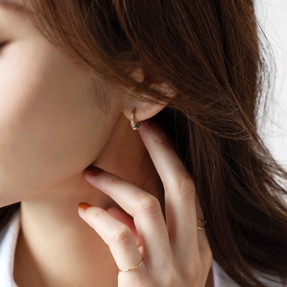 マルチカラービジューが輝くキャッチレスフープピアス。華奢フープラインに埋め込んだ5色の極小ジルコニアが耳元からお顔周りをさりげなく華やかに魅せてくれます。ちょっとした贈り物にもオススメ◎