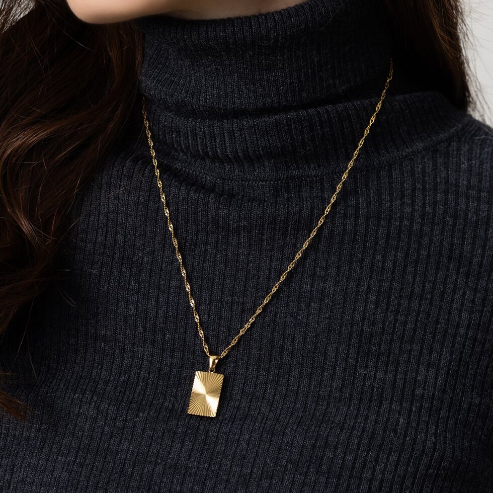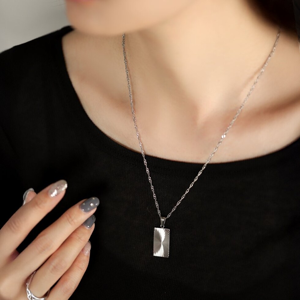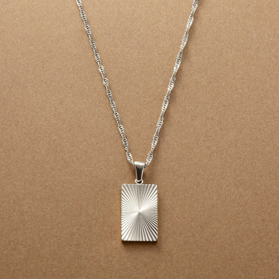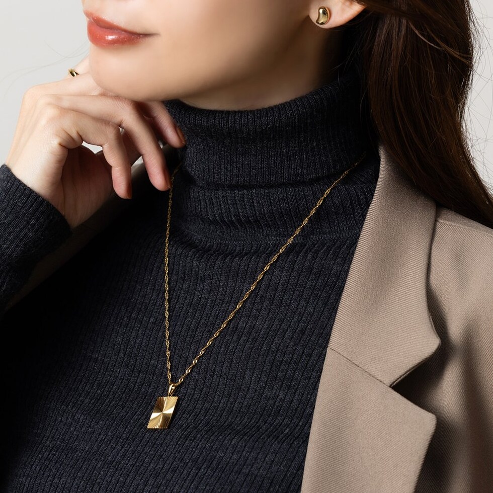 放射状にテクスチャーが入ったレクタングルプレートのステンレス製ネックレス。細やかな凹凸が胸元で表情豊かに艶めきます。存在感を放つエッジの効いたデザインが、大人モードな雰囲気をプラスしてコーデを格上げしてくれるひと品。