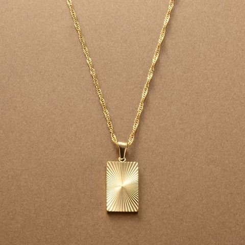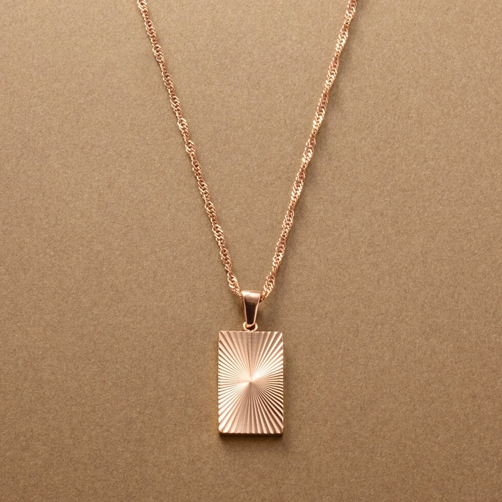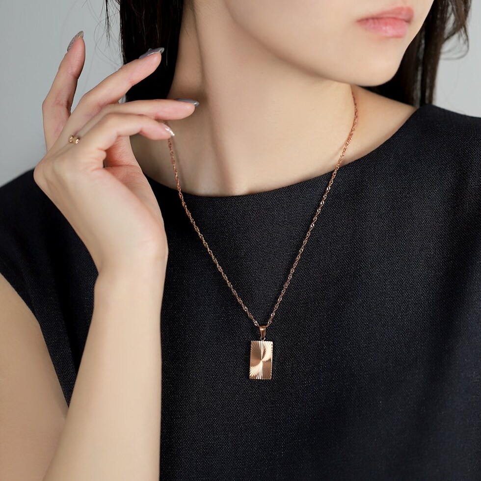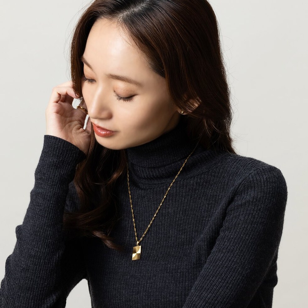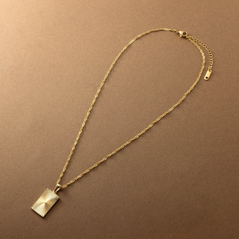 放射状にテクスチャーが入ったレクタングルプレートのステンレス製ネックレス。細やかな凹凸が胸元で表情豊かに艶めきます。存在感を放つエッジの効いたデザインが、大人モードな雰囲気をプラスしてコーデを格上げしてくれるひと品。