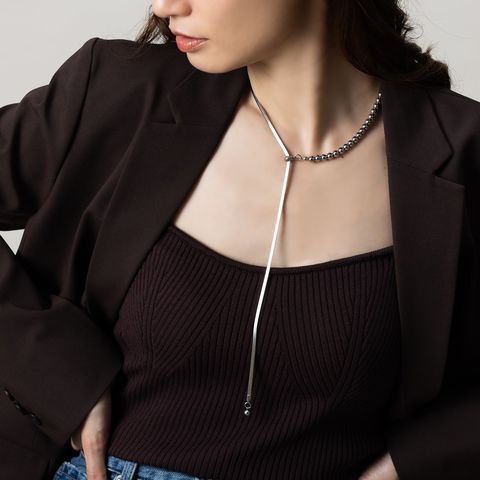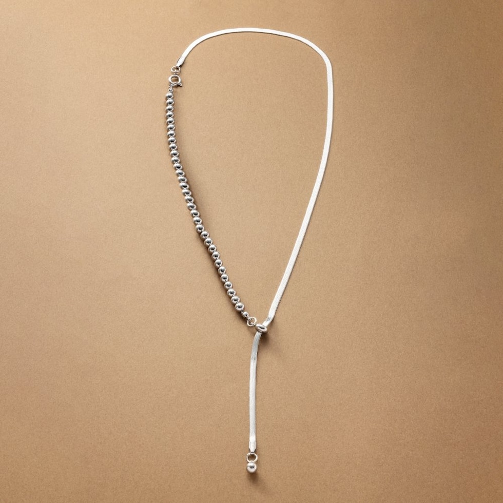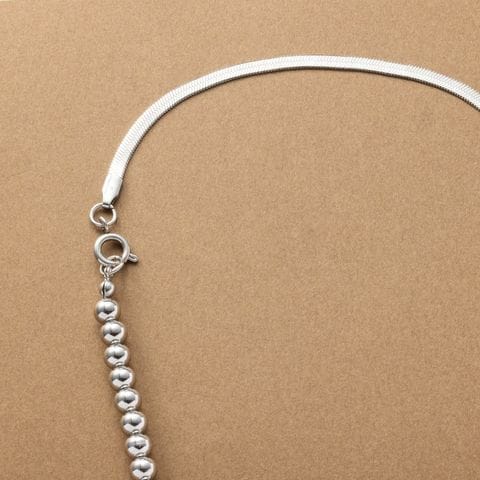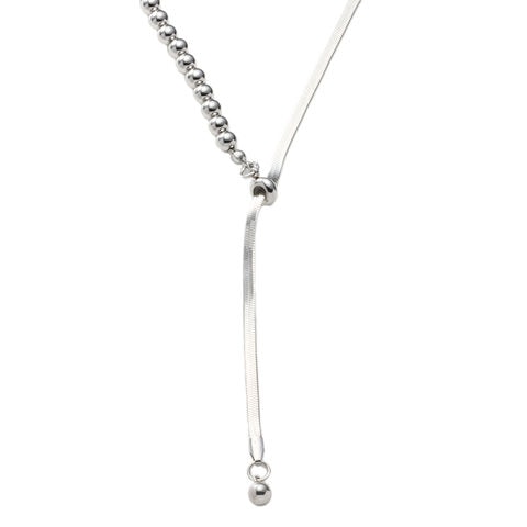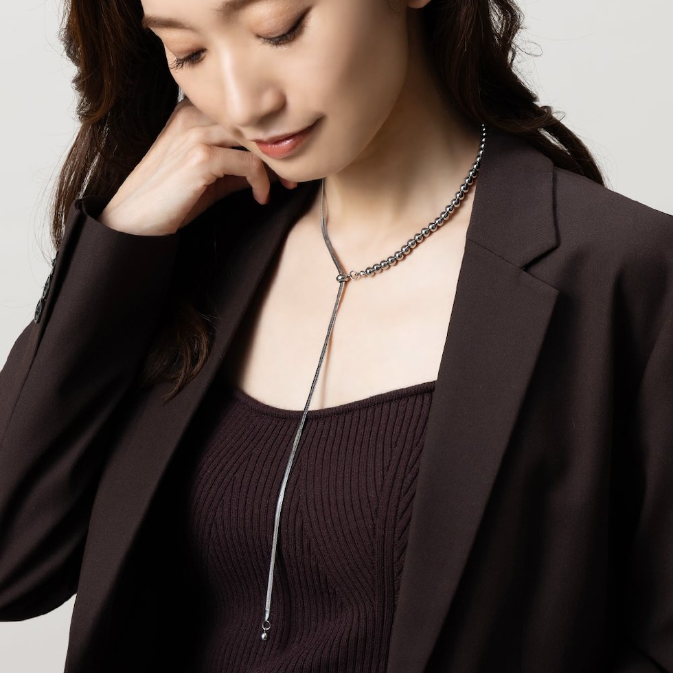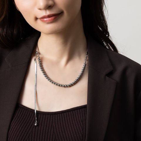 しなやかに艶めくスネークチェーンとボールチェーンを組み合わせたラリエットネックレス。中央のスライドパーツでY字部分を自分好みの長さに無段階で調整が可能。長さを変えるだけで印象も変わるので、様々なスタイルでおしゃれが楽しめます♪スライドパーツの位置を変えて、シンプルなネックレスとして使用しても◎肌馴染みもよく錆びにくいステンレス製だからデイリー使いにぴったりの一品です。