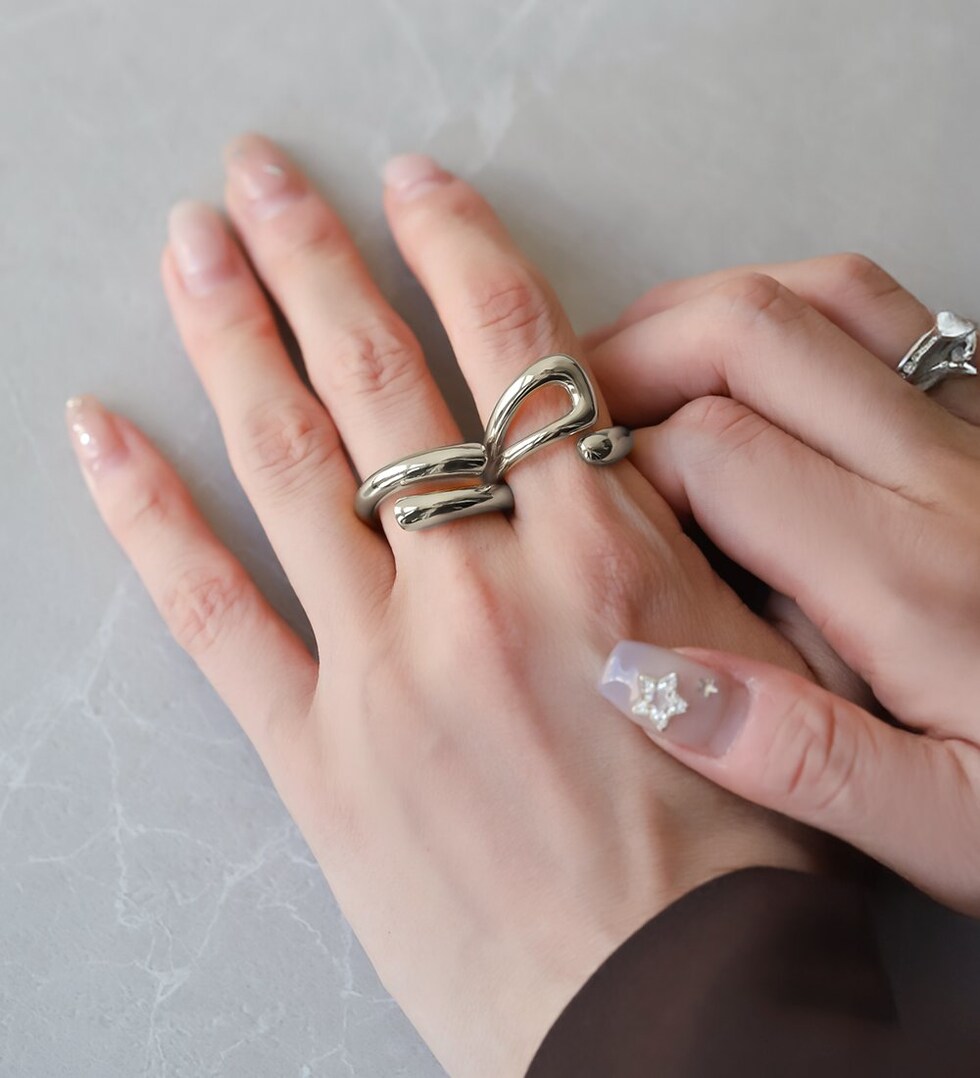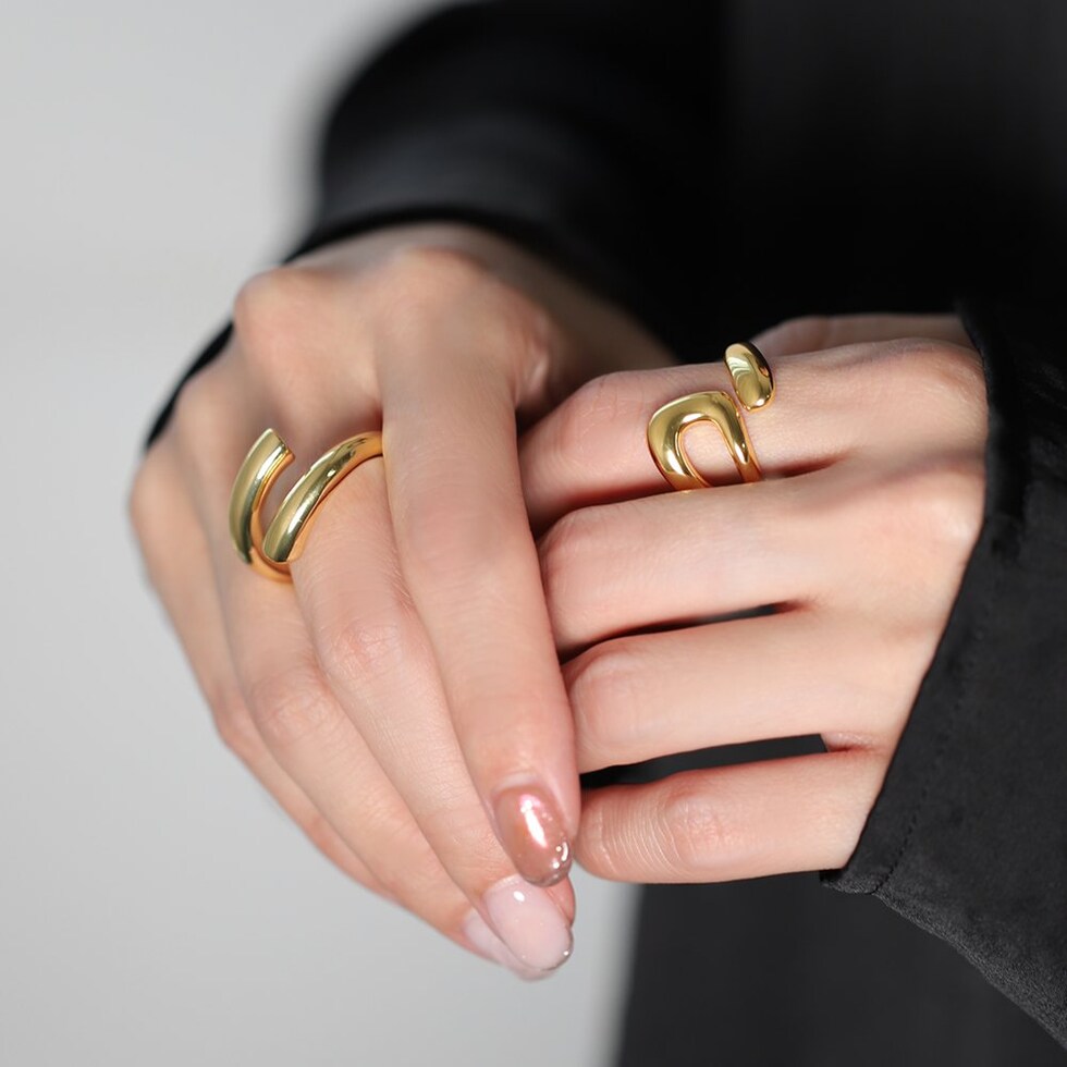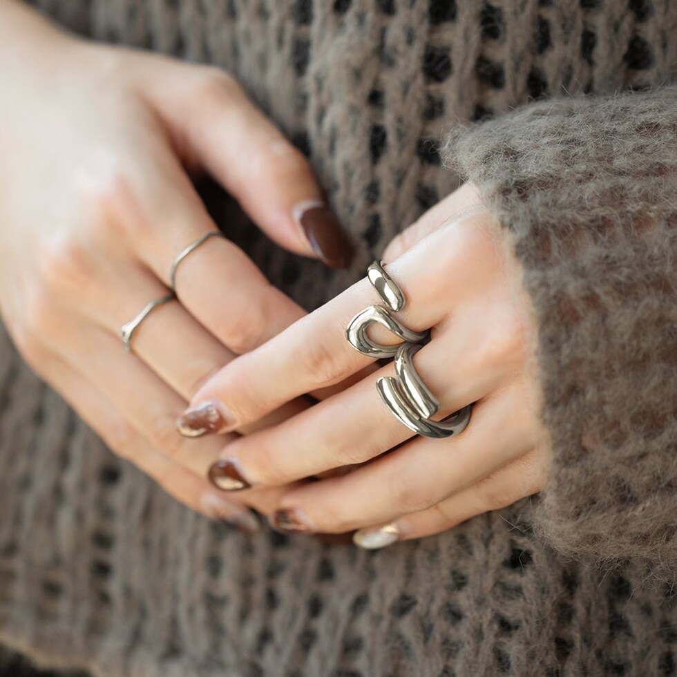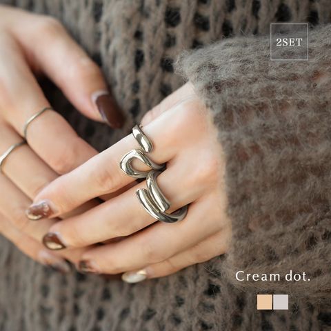 ニュアンス感たっぷりな2点セットのオープンリング。艶めくメタルラインとレイヤード風デザインが他とはひと味違った洗練された手元を演出してくれます。今っぽいこなれた印象に仕上がるオススメのアイテムです。