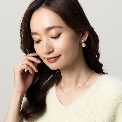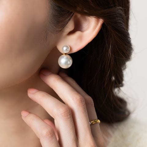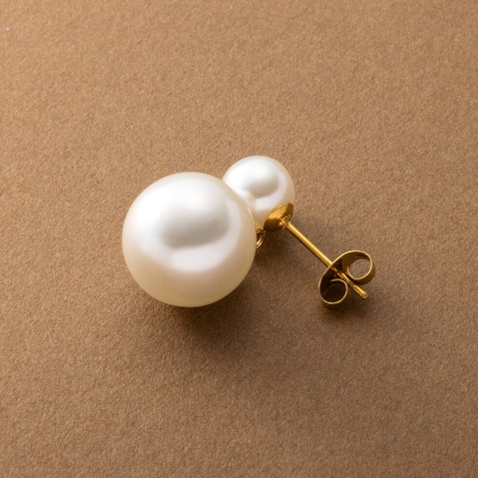 大きさの異なるダブルパールが動くたびに揺らめくピアス。存在感がありながらも上品な艶めきが、印象的な横顔に仕上げてくれます。デイリーはもちろん華やかな日の装いにもピッタリなアイテム◎錆びにくく傷に強いステンレス製で、長時間の着用も安心の低アレルギー素材です。