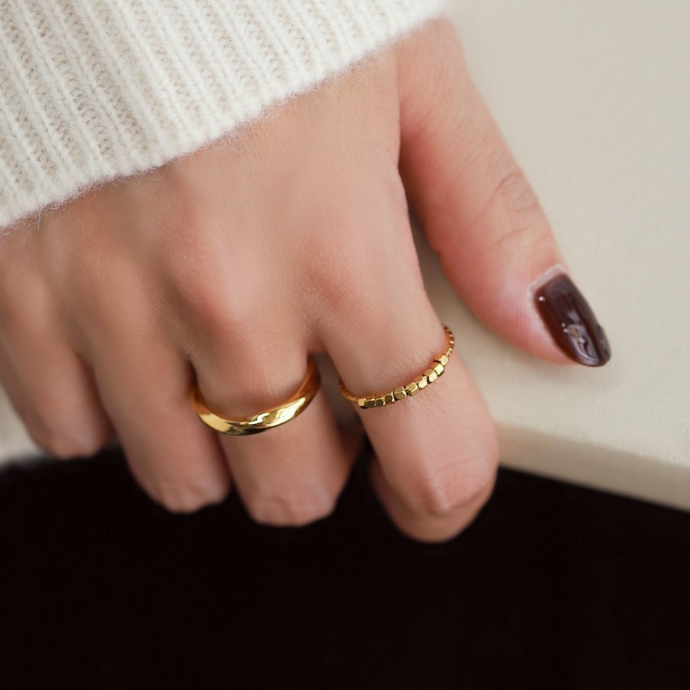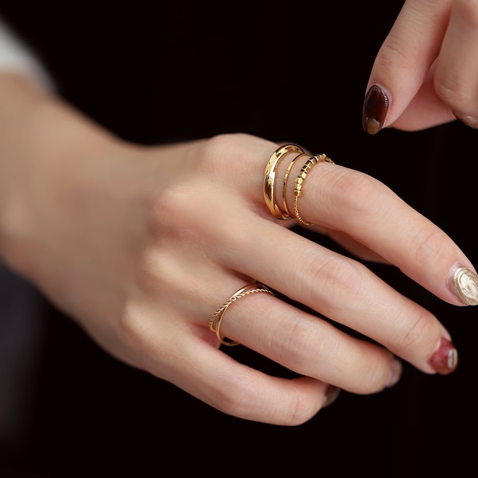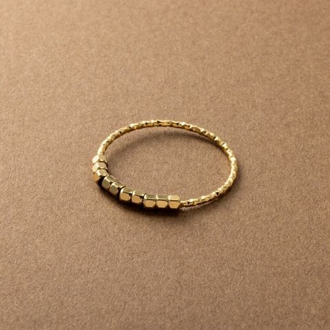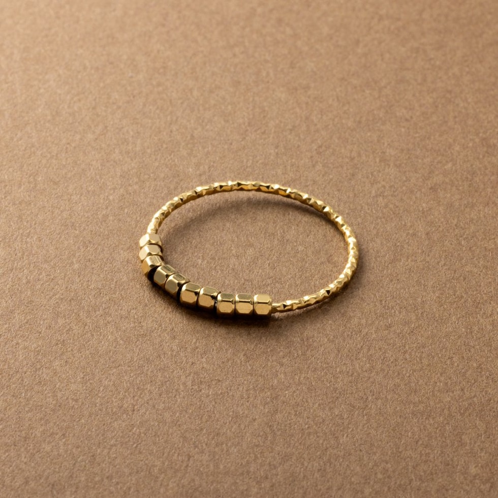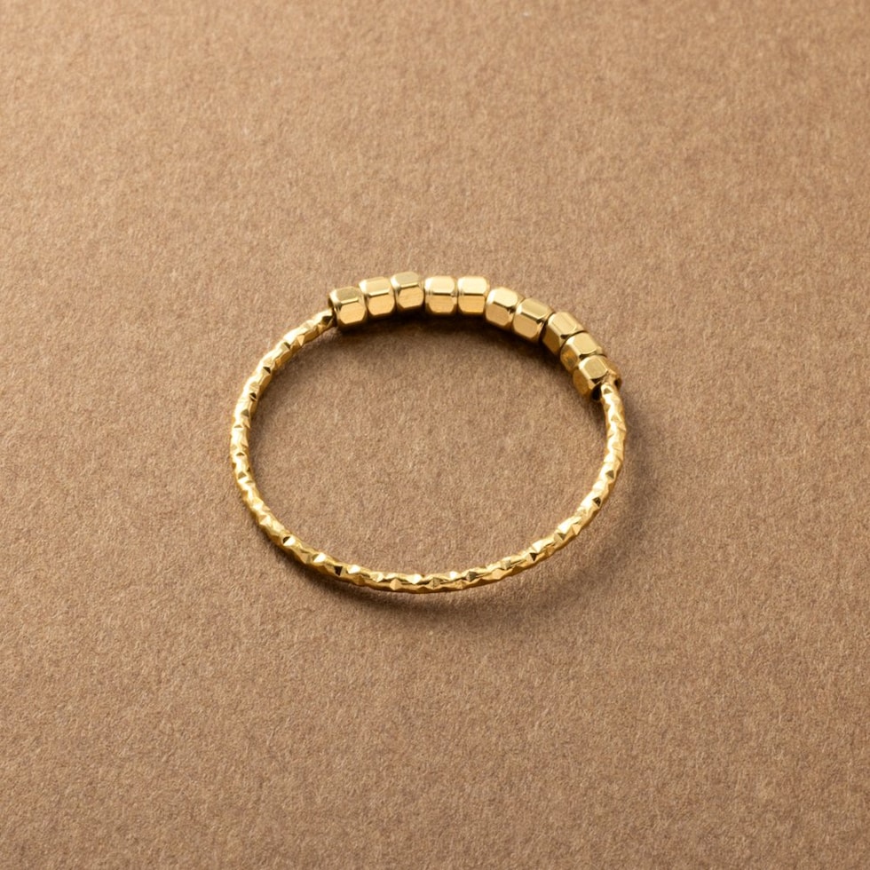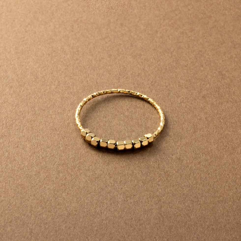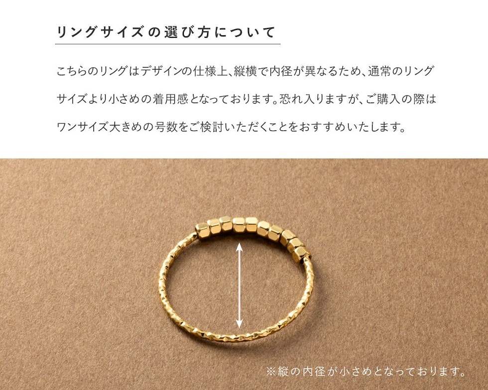 メタルビーズの連なりと凹凸テクスチャーが光を受けて煌めく華奢リング。細身シルエットと繊細なデザインが手元をさりげなく演出します。お手持ちのリングとのコーディネートにもオススメなひと品◎