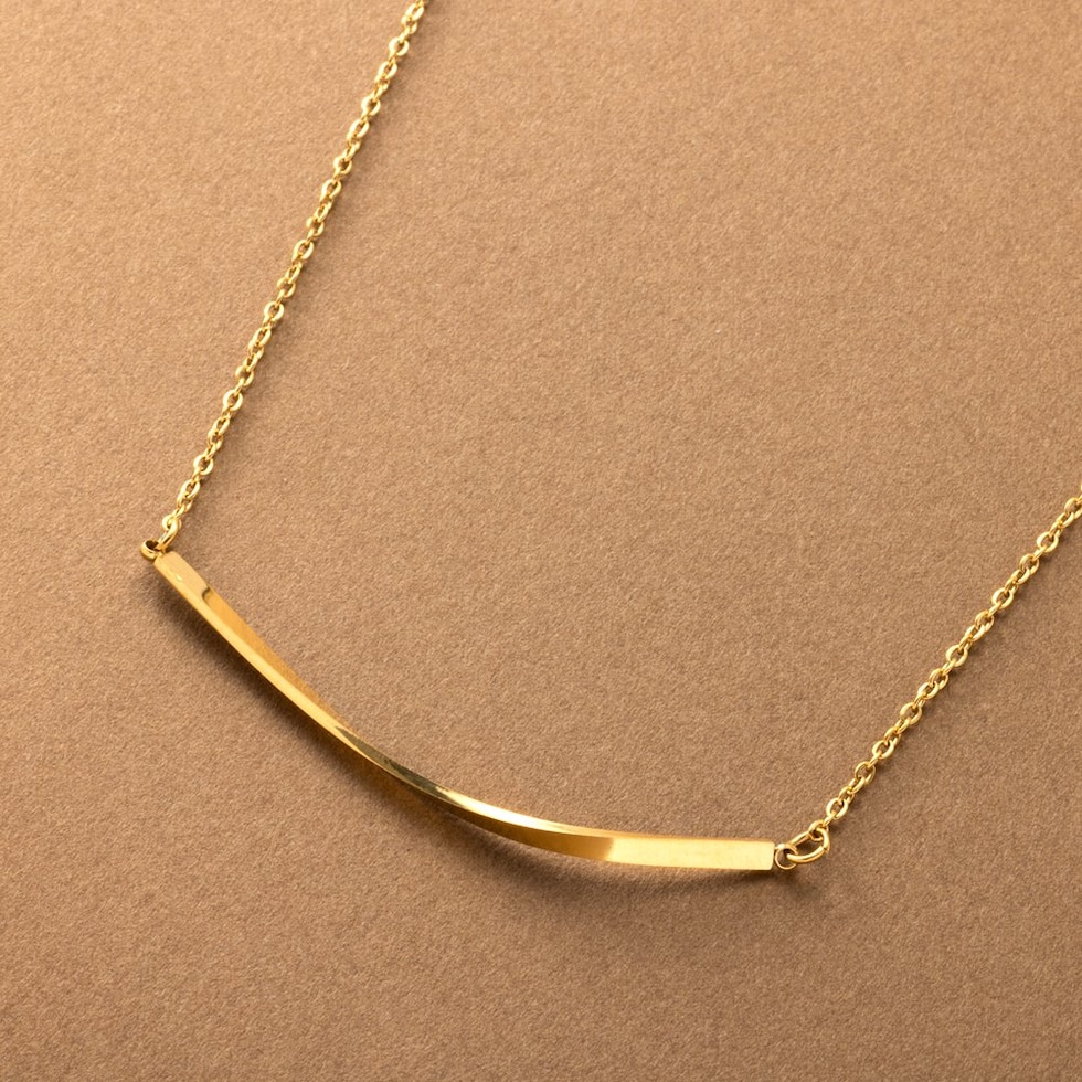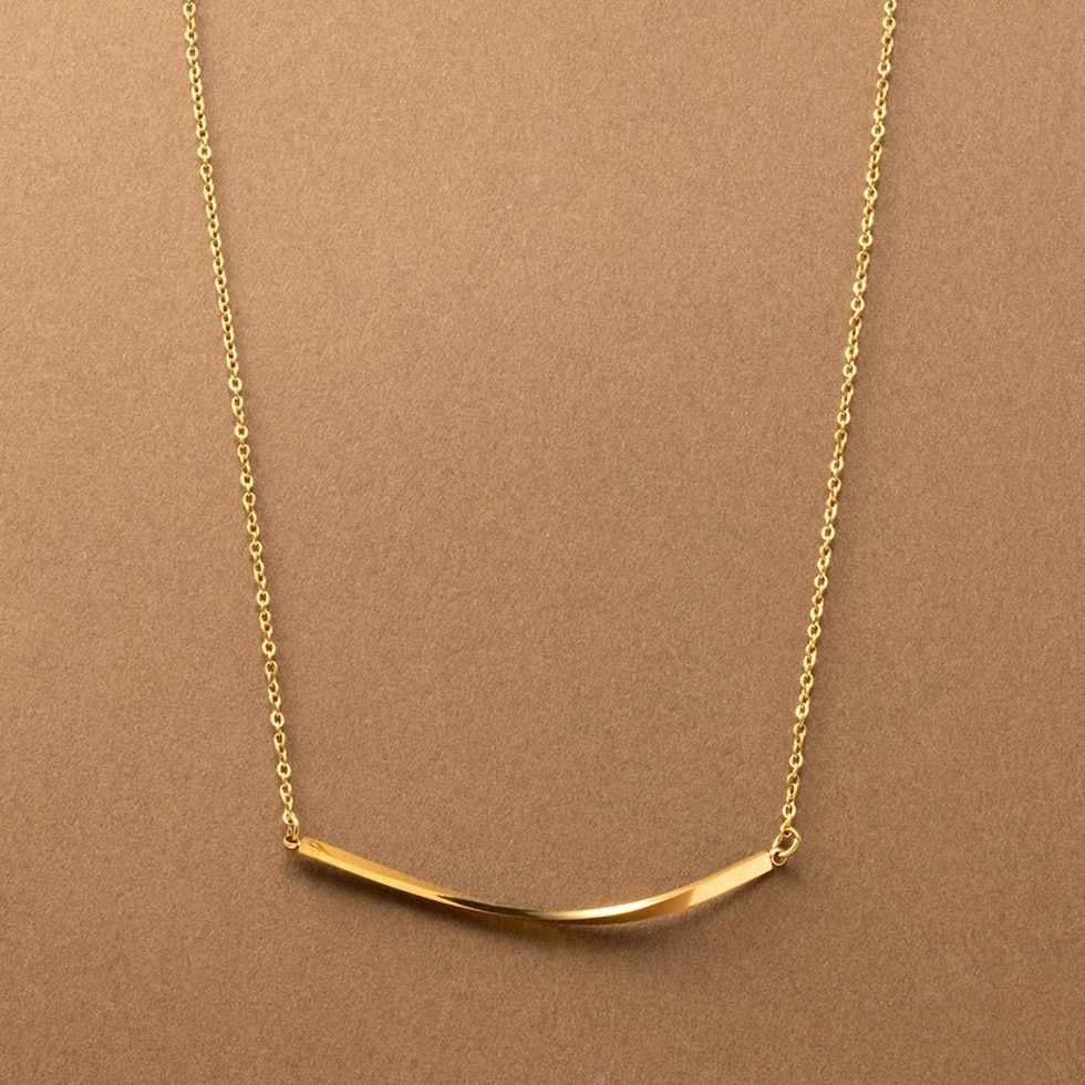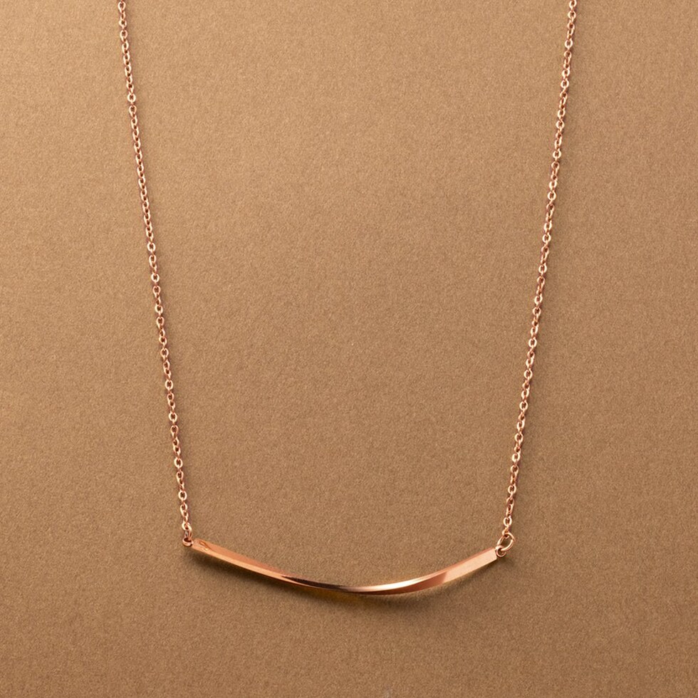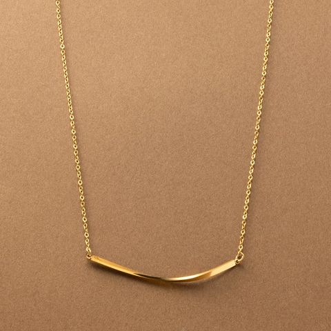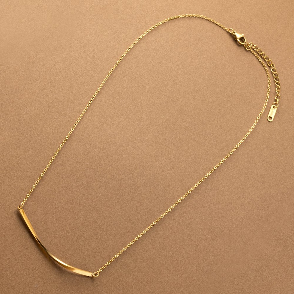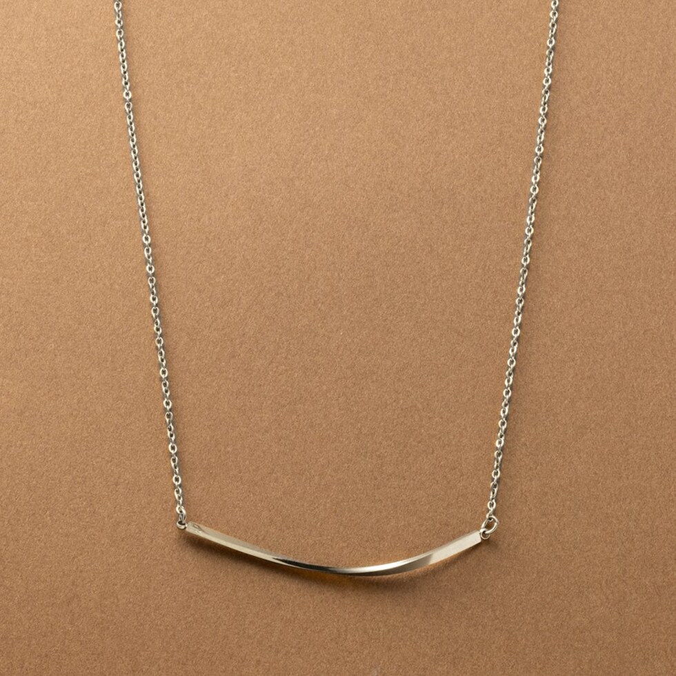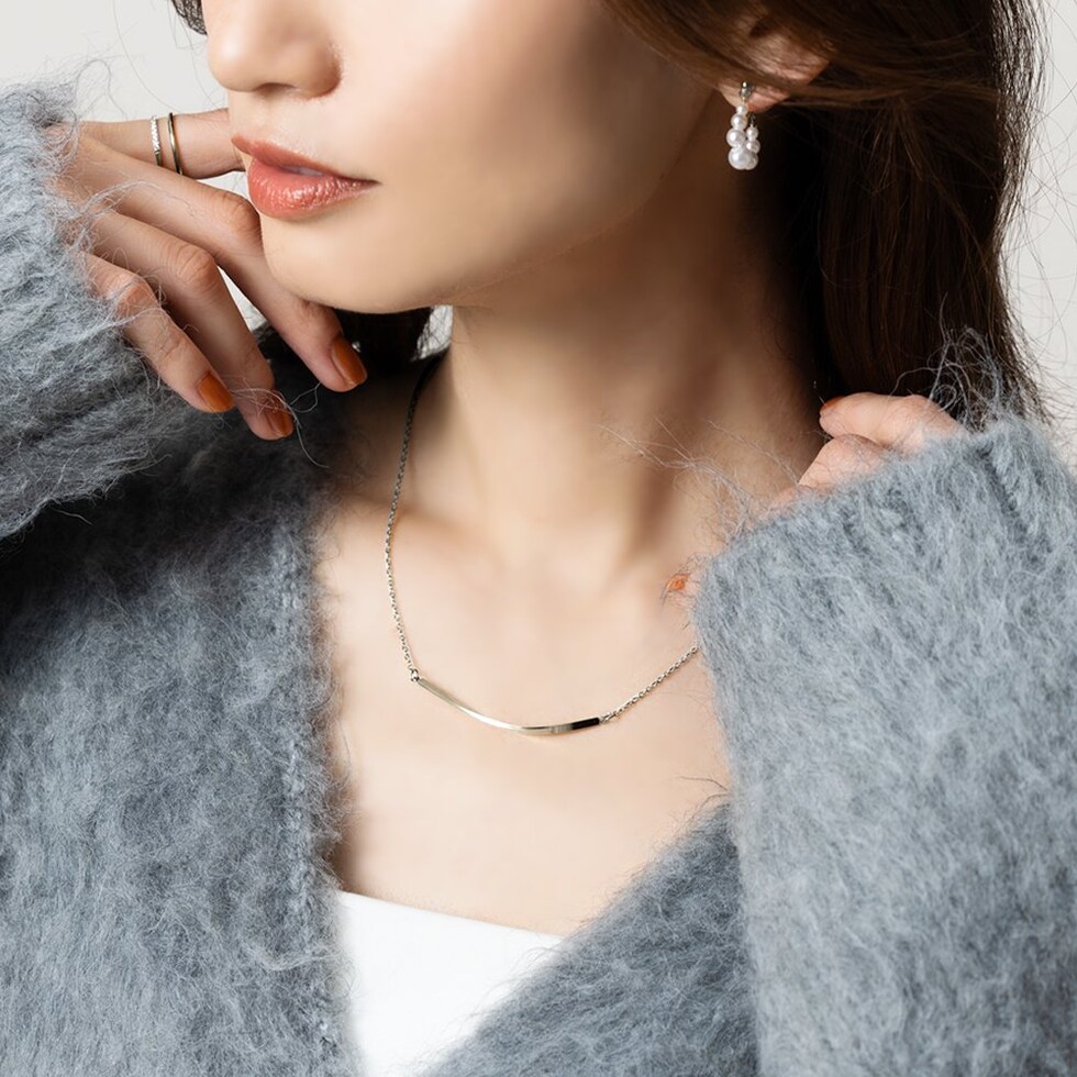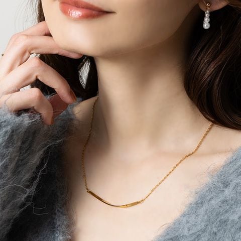 ツイストカーブバーのステンレス製ネックレス。ひねりを加えたアシンメトリーなカーブバーが洗練された輝きを放つスキンジュエリー。大人スタイルにひとつ加えてコーデを格上げ◎錆びにくいステンレス製でデイリーに活躍しそう。