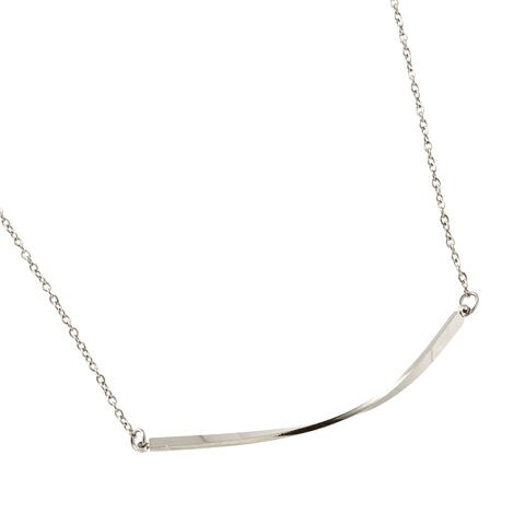 ツイストカーブバーのステンレス製ネックレス。ひねりを加えたアシンメトリーなカーブバーが洗練された輝きを放つスキンジュエリー。大人スタイルにひとつ加えてコーデを格上げ◎錆びにくいステンレス製でデイリーに活躍しそう。