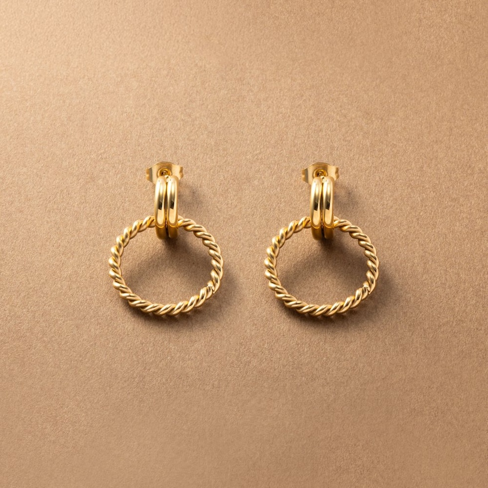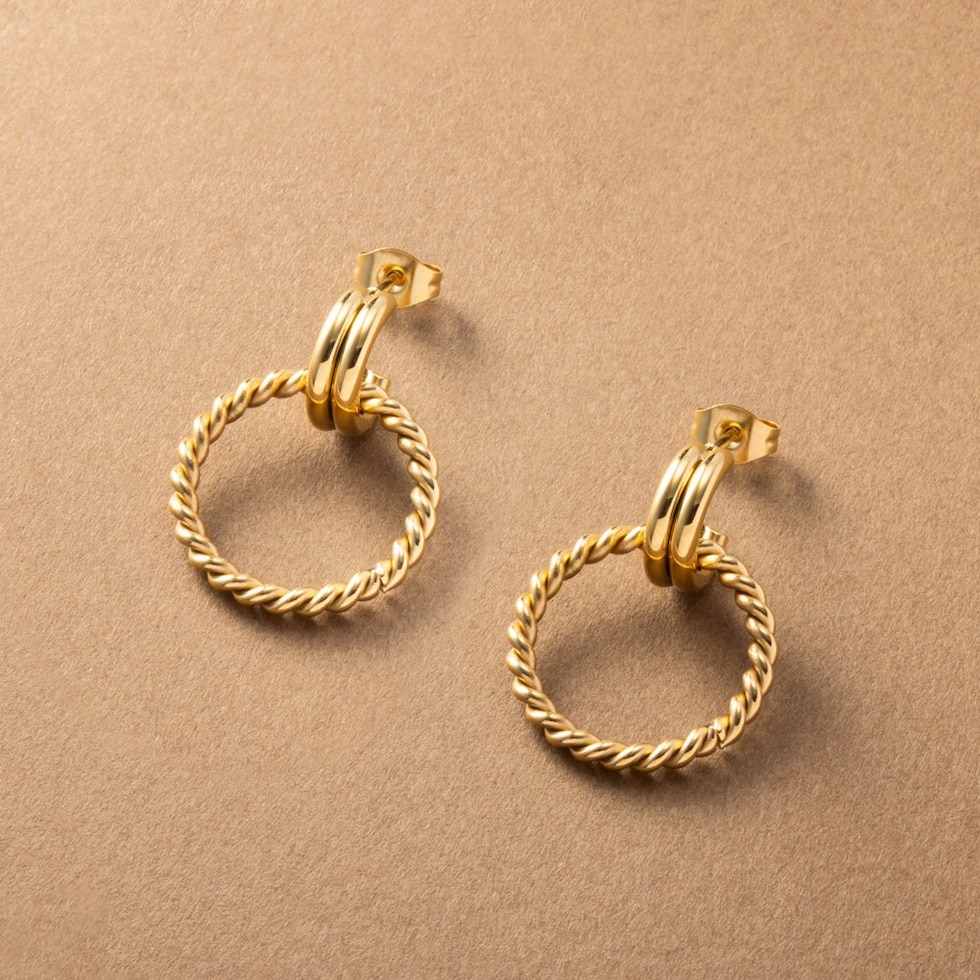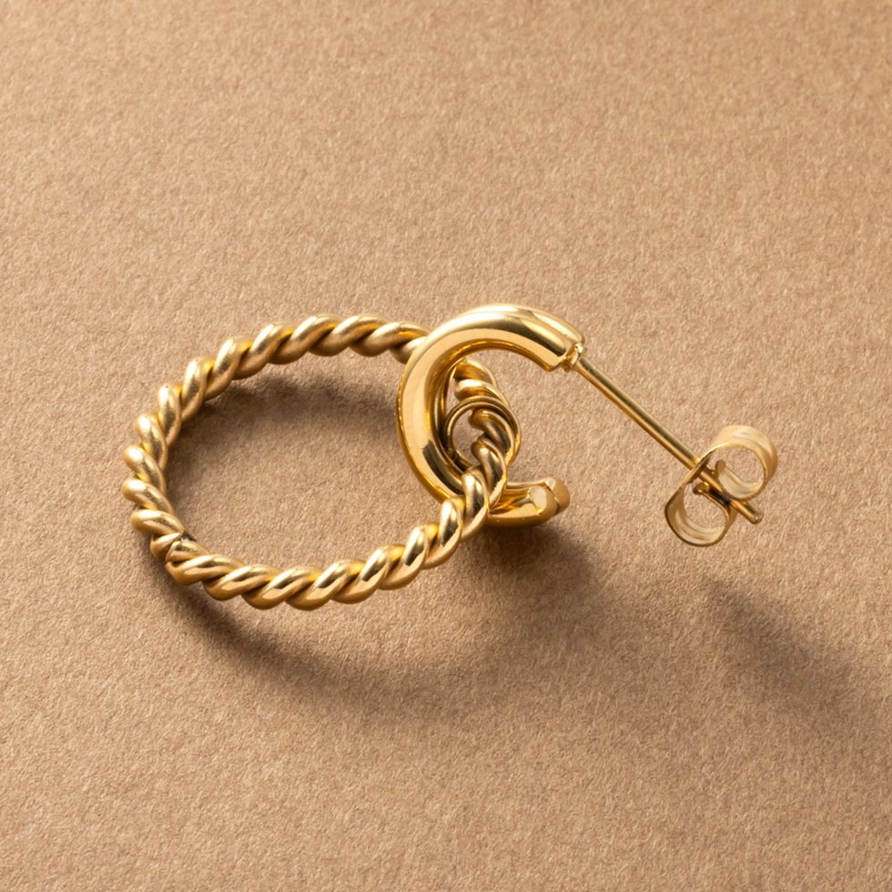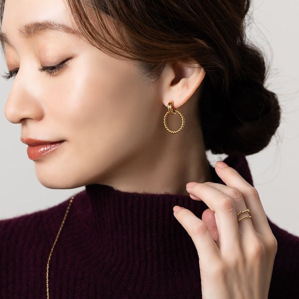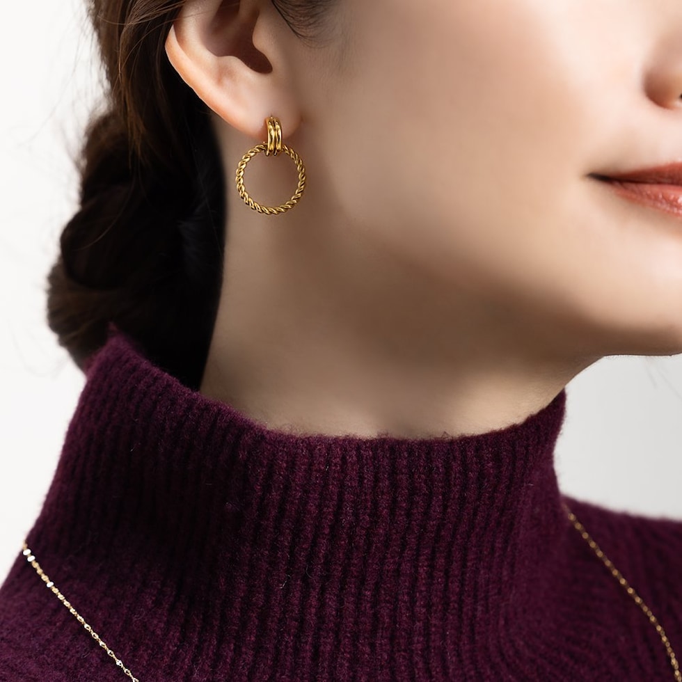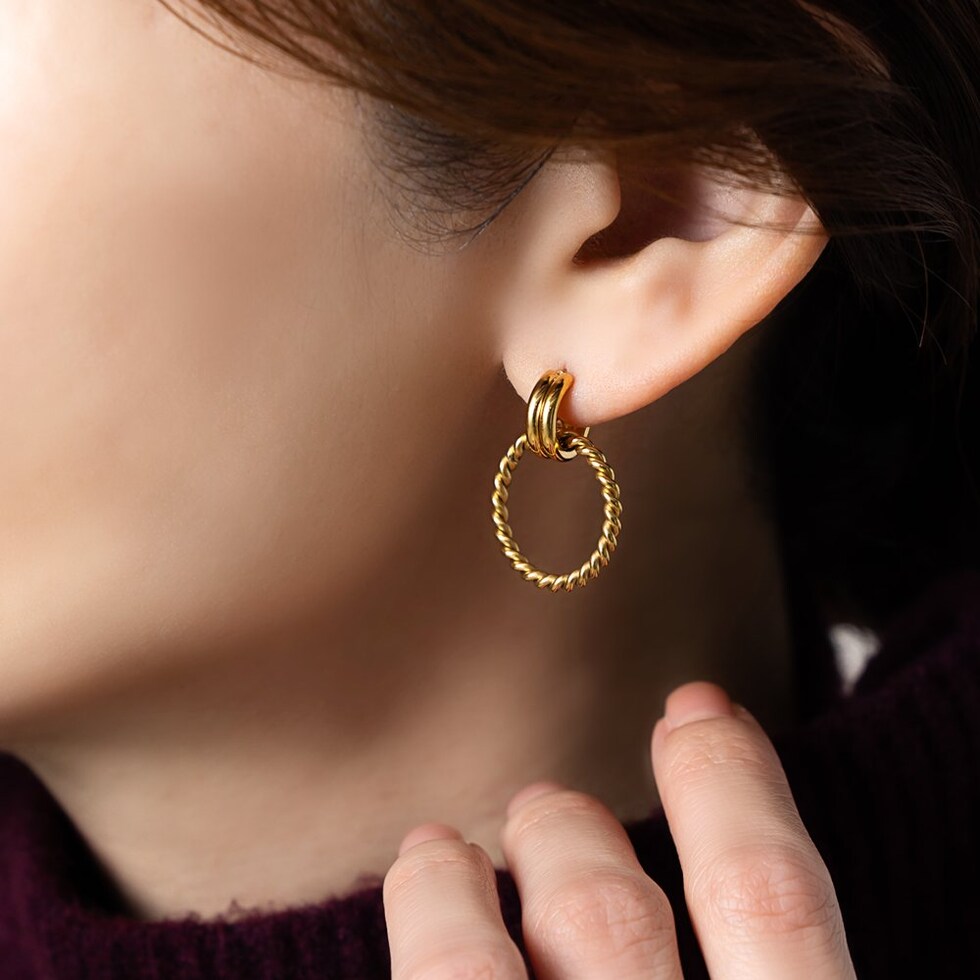 ダブルラインにツイストリングを重ねた大ぶりピアス。モードな雰囲気とさりげなく揺れるデザインが大人コーデと相性◎程よいサイズ感と錆びにくいステンレス製でデイリーやお出かけにオススメです。