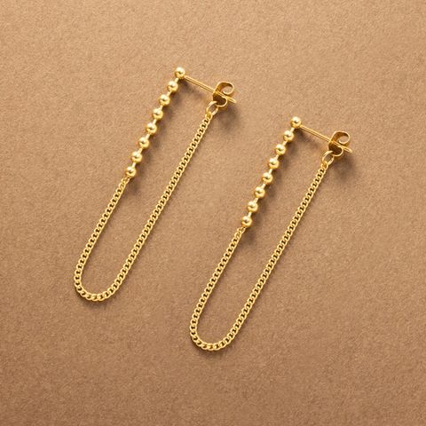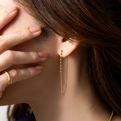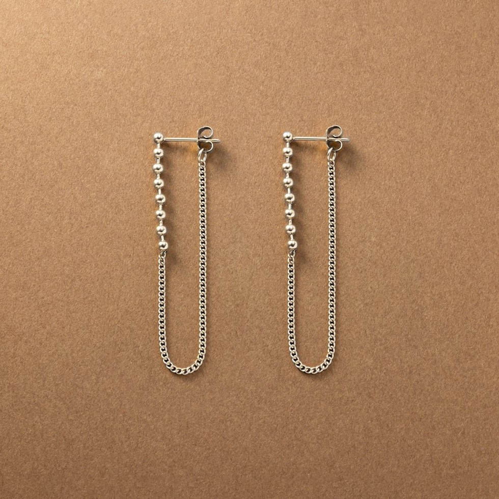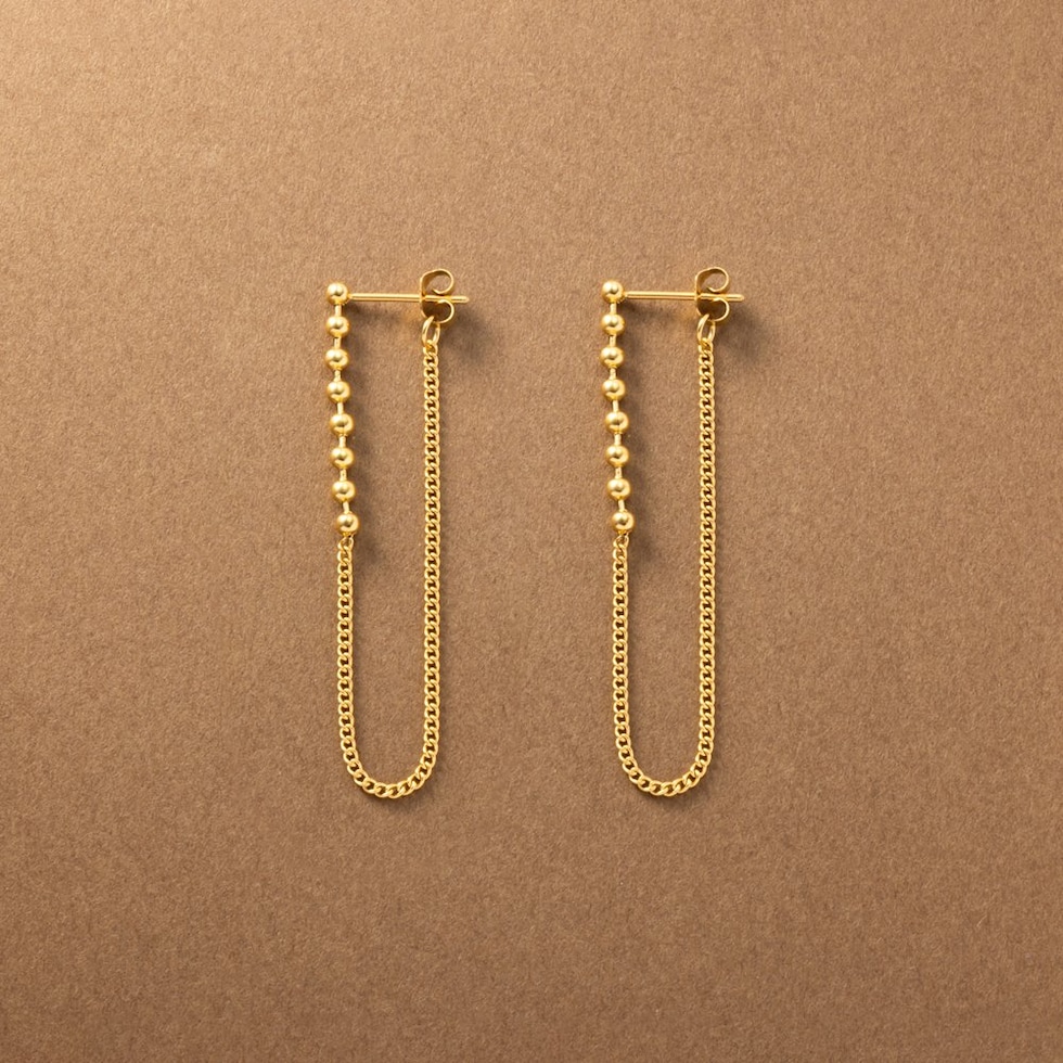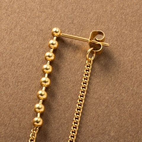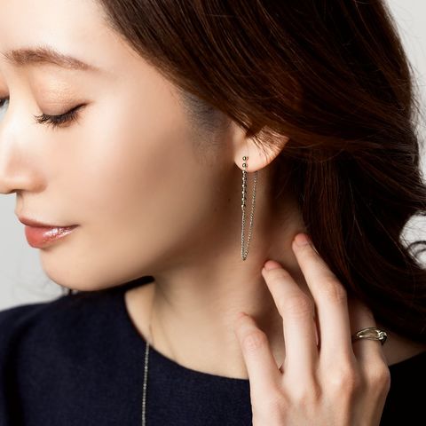 小粒なメタルボールに華奢チェーンを組み合わせたバックキャッチピアス。細身でさりげなく揺れるデザインとバックキャッチで横顔も抜け目のない仕上がりに◎錆びにくいステンレス製でデイリーに活躍するひと品です。