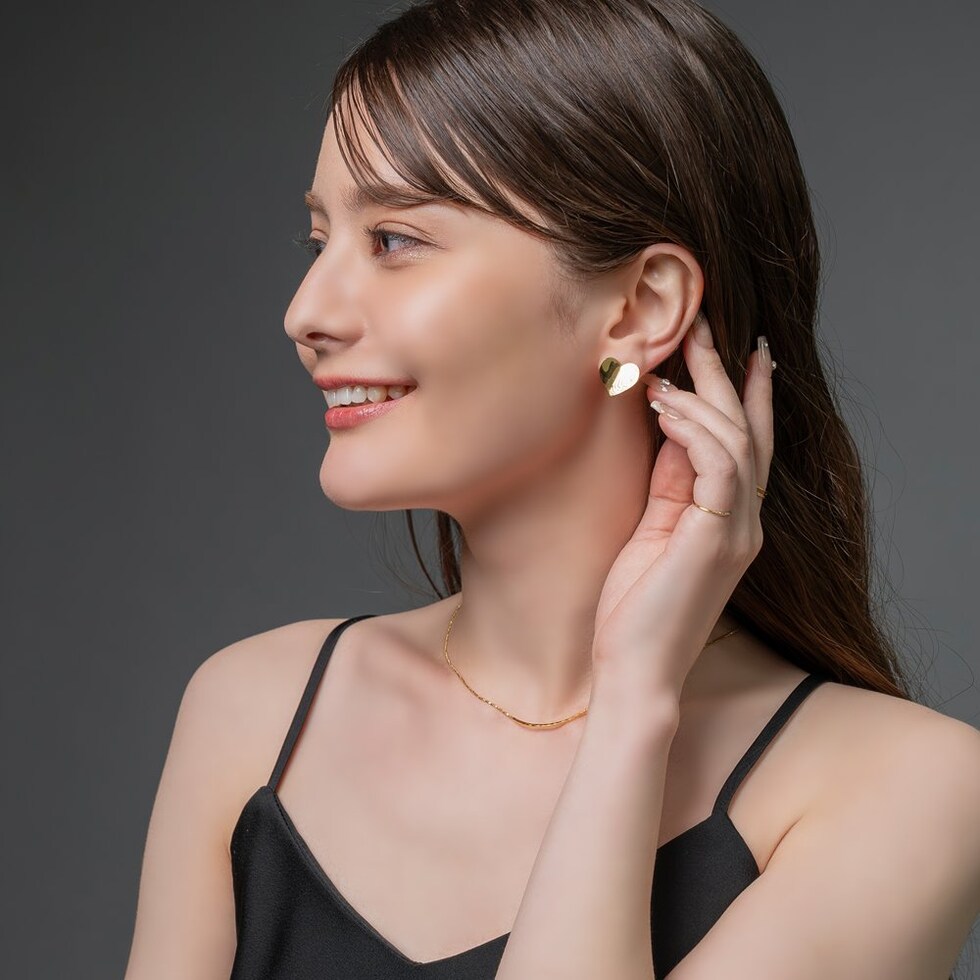 緩やかにカーブを描いて反り返ったデザインのハートモチーフピアス。湾曲したデザインはシャープな輝きを放ち、耳元に光のニュアンスをプラスしてくれます。錆びにくく傷に強いステンレス製で、長時間の着用も安心の低アレルギー素材です。
