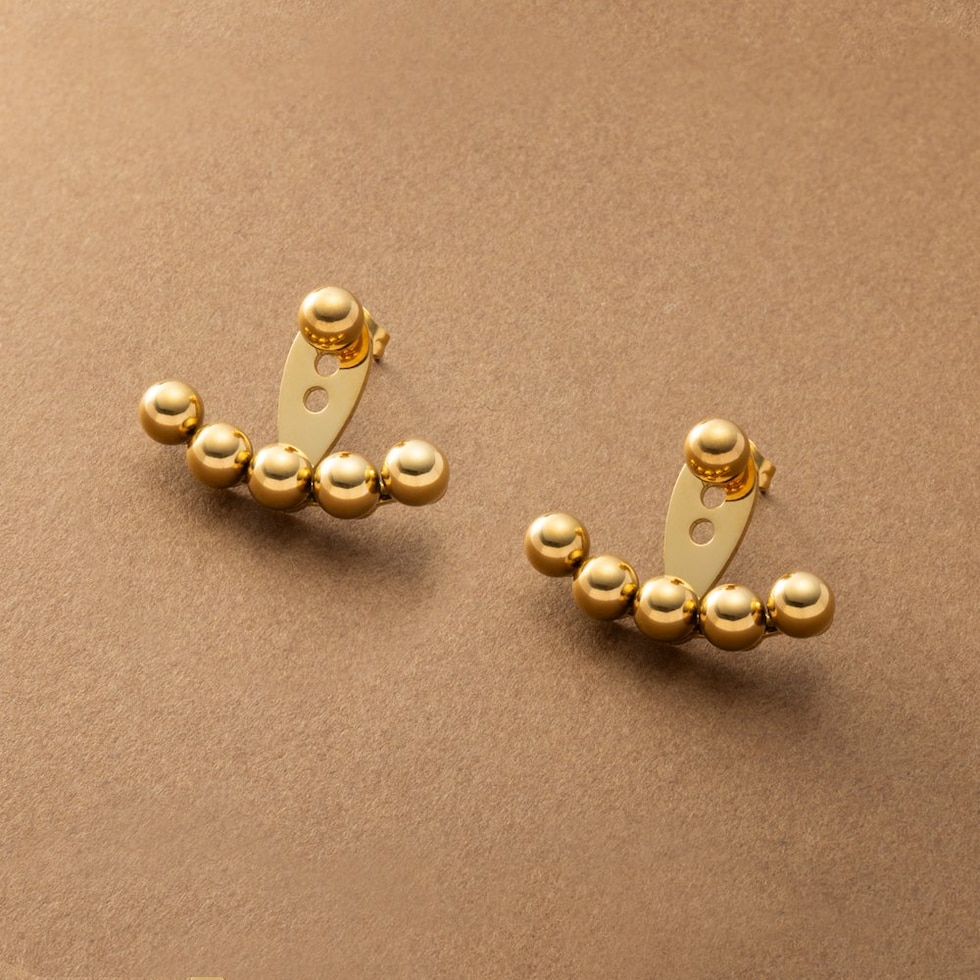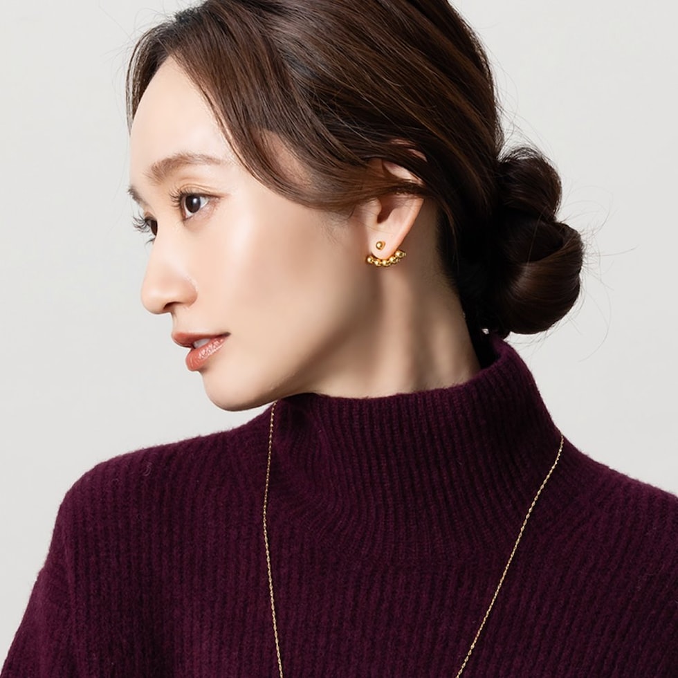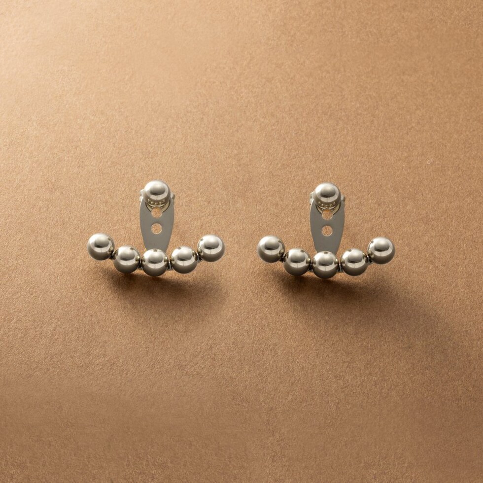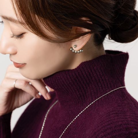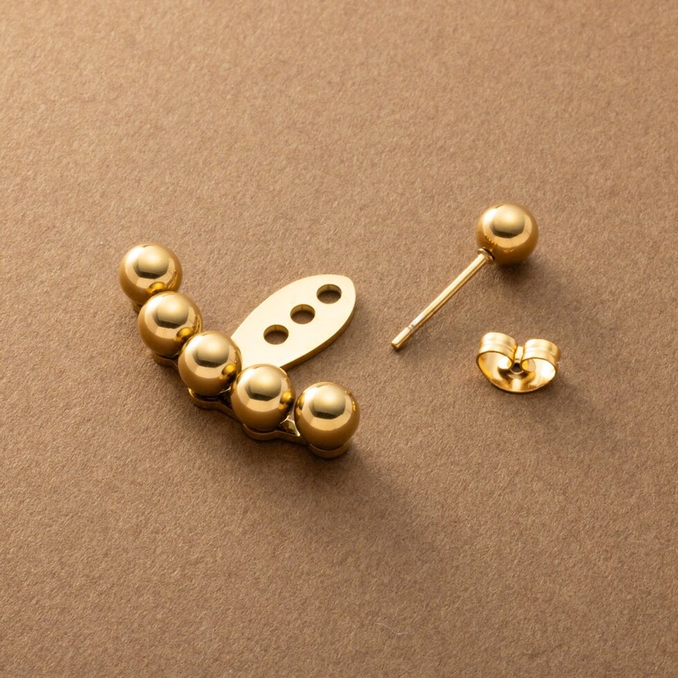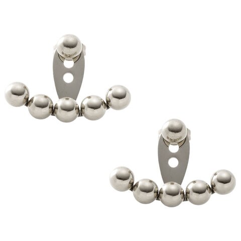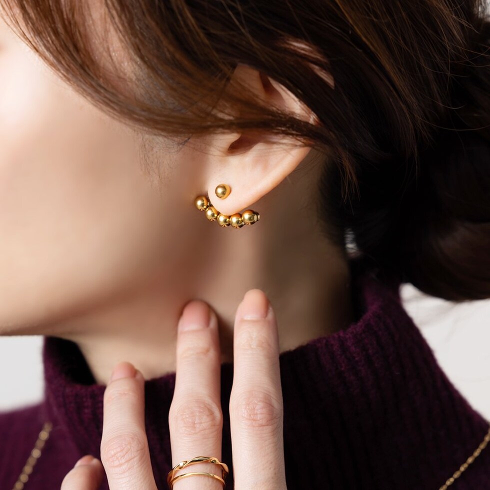 バックキャッチデザインのステンレス製スフィアピアス。5粒のメタルボールが耳たぶに沿うバックキャッチモチーフで洗練されたフォルムを完成させるモダンなアイテム。錆びにくいステンレス製でデイリーに活躍しそう◎