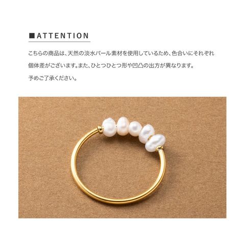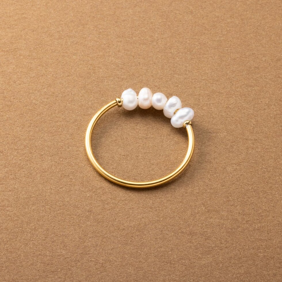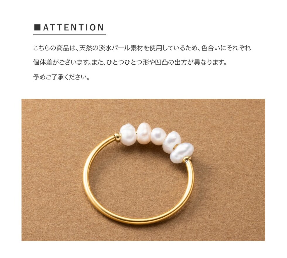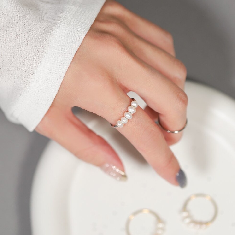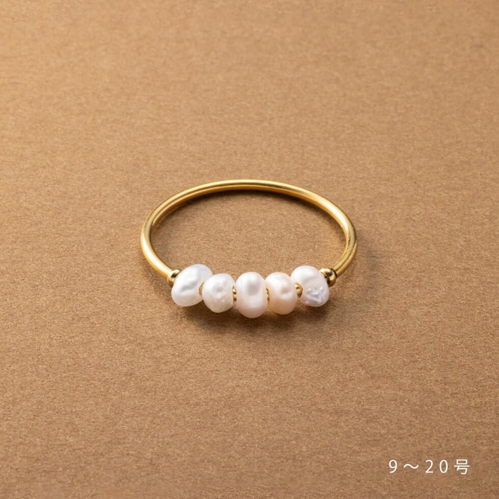 ナチュラルな輝きを放つ淡水パールを連ねたリング。女性らしいシンプルなデザインが指先を上品に演出します。錆びにくく傷に強いステンレス製で、デイリーに活躍してくれます。長時間の着用も安心の低アレルギー素材です。