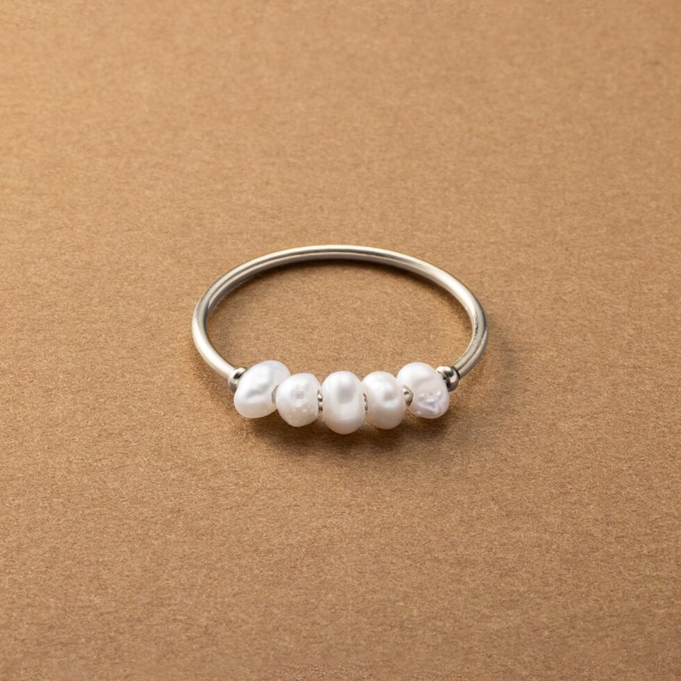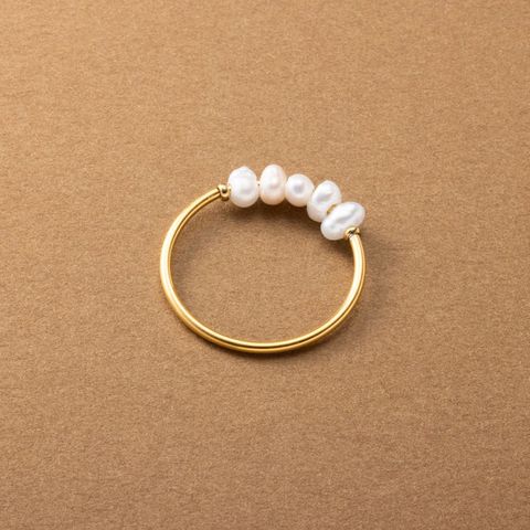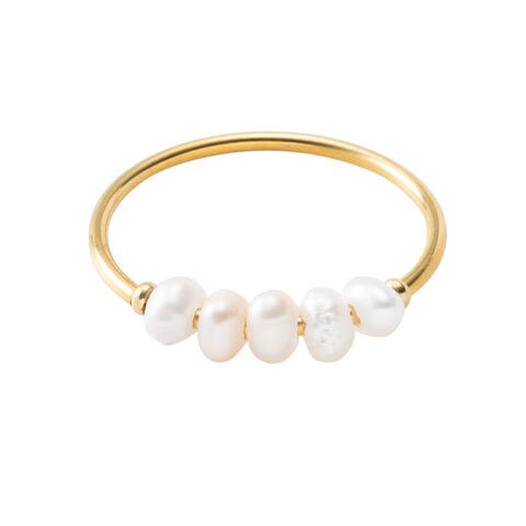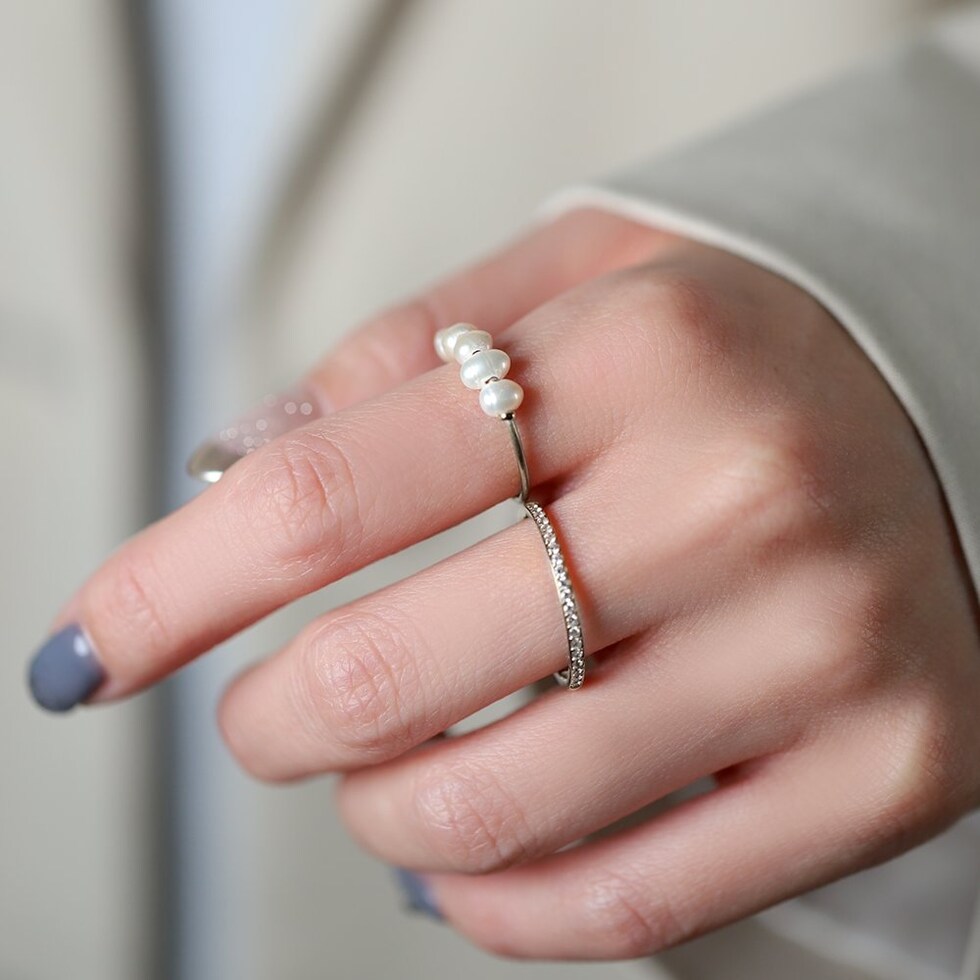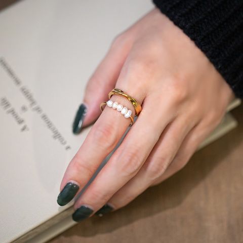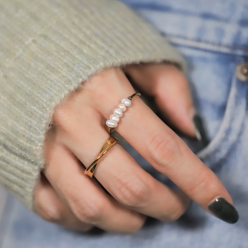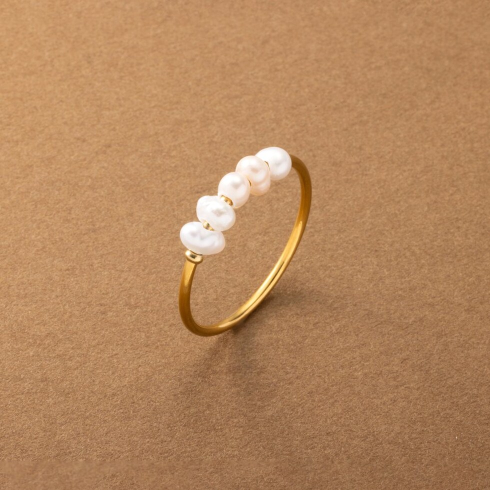 ナチュラルな輝きを放つ淡水パールを連ねたリング。女性らしいシンプルなデザインが指先を上品に演出します。錆びにくく傷に強いステンレス製で、デイリーに活躍してくれます。長時間の着用も安心の低アレルギー素材です。