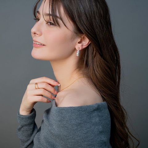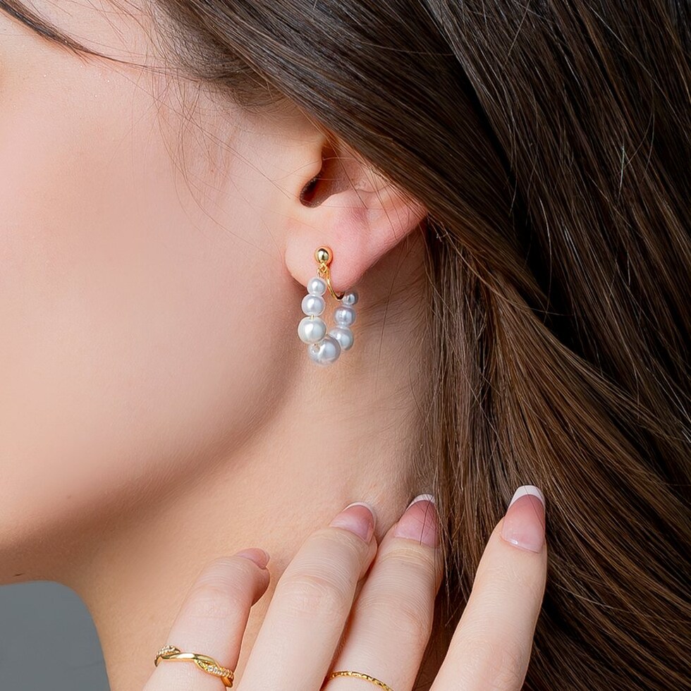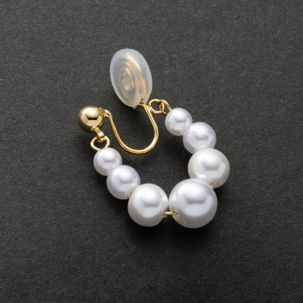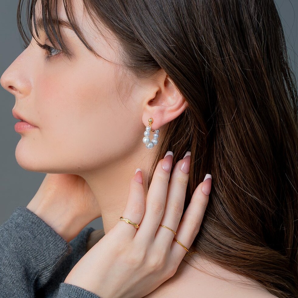 大きさの異なるパールを連ねたフープイヤリング。耳元で揺らめき存在感を放ちつつ、上品に艶めくデザインが大人っぽい華やかさを添えてくれます。シリコンカバー付きの耳にフィットするデザインで、落ちにくいのも嬉しいポイント。普段使いはもちろんセレモニーなどのオケージョンにも◎