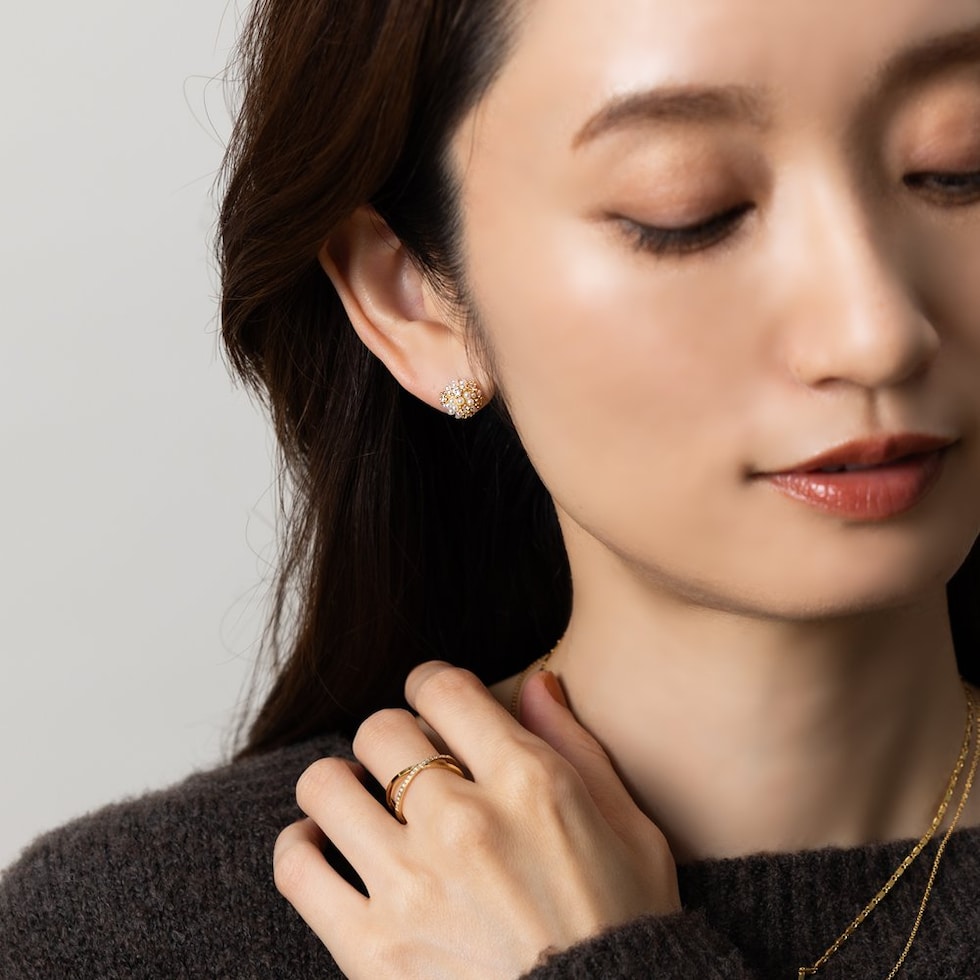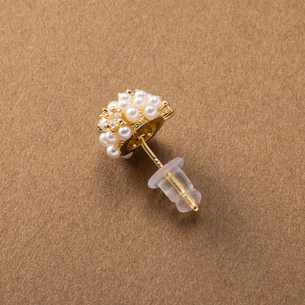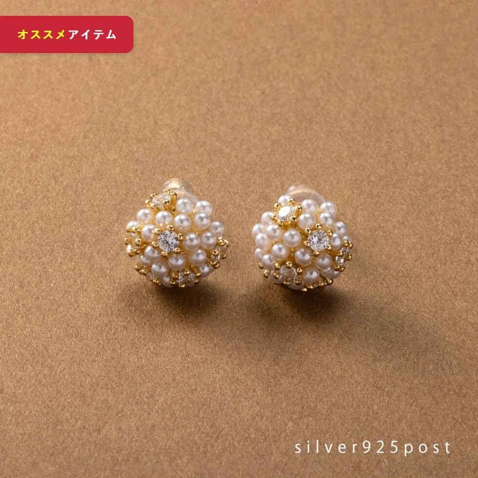 ミル打ちビジューをランダムに配したパヴェパールのピアス。ビジュー&パールをふんだんに使用した華やかなデザインが高級感バツグン◎お出かけはもちろんセレモニーやパーティースタイルにもマッチするアイテムです。低アレルギー素材のSILVER925ポストを使用しているので、長時間の着用も安心です。