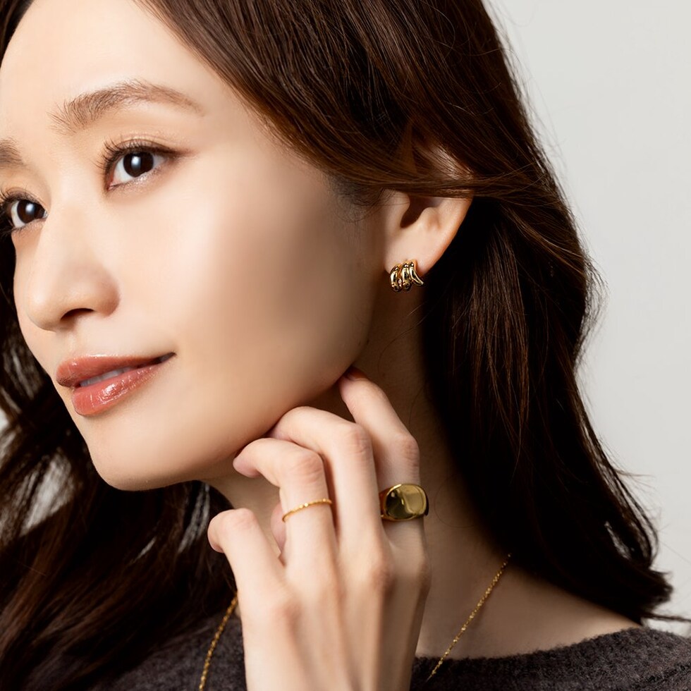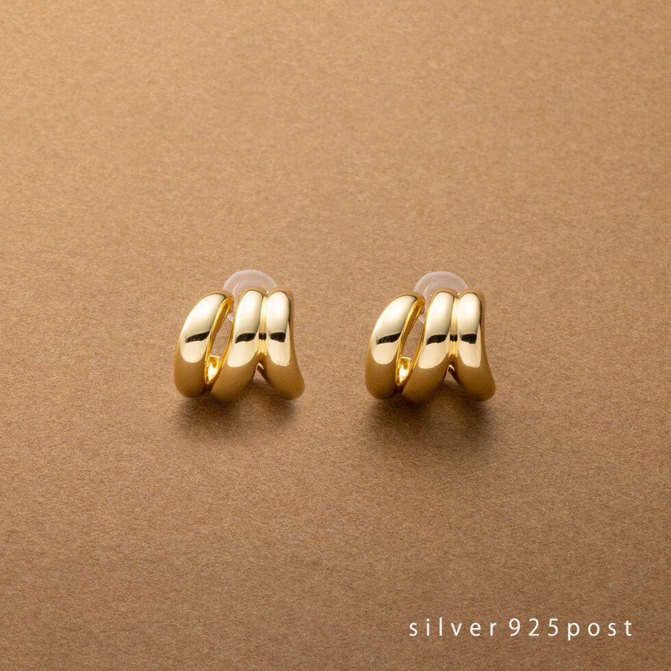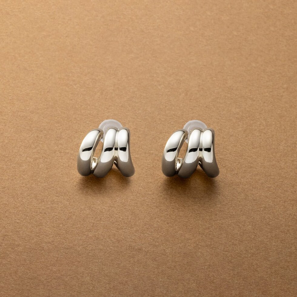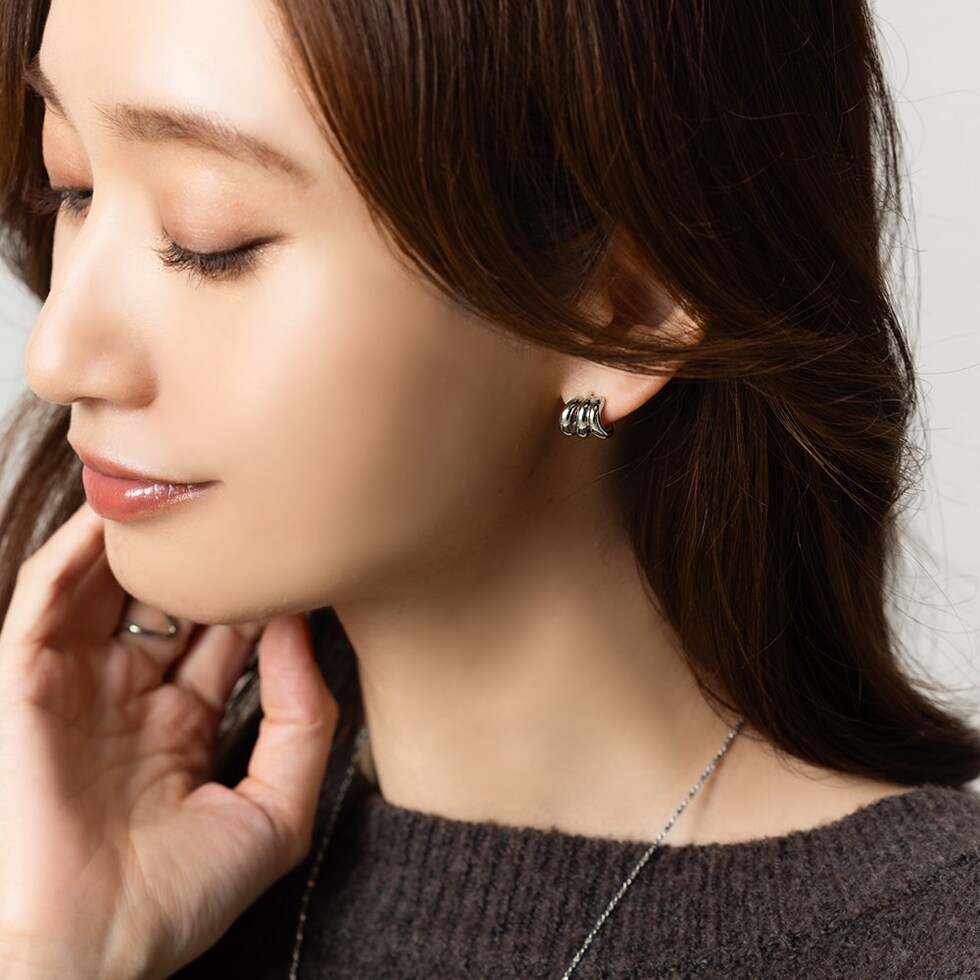 小ぶりながらも印象的な3連メタルフィットピアス。耳たぶに沿うぷっくりとしたメタルデザインが、ニュアンスのある上品な艶感を演出します。使いやすいサイジングで幅広いスタイルと相性抜群なアイテムです。