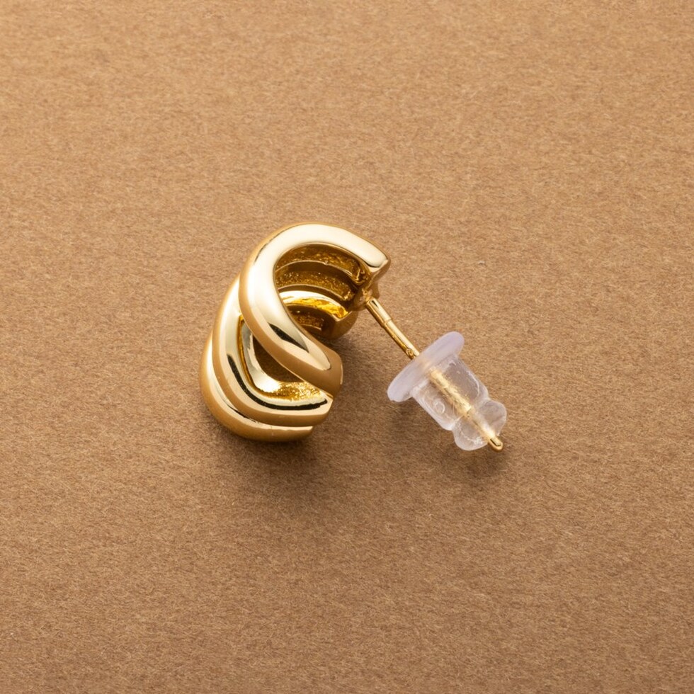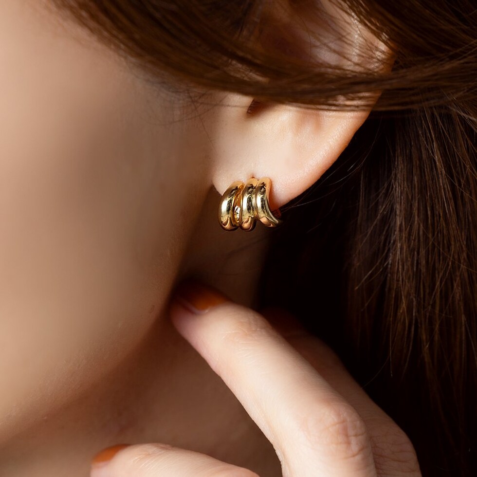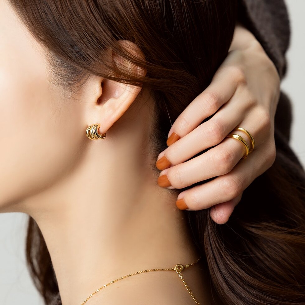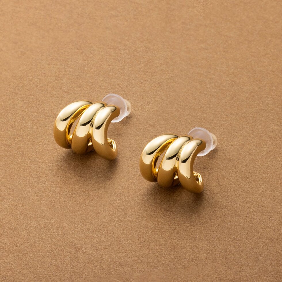 小ぶりながらも印象的な3連メタルフィットピアス。耳たぶに沿うぷっくりとしたメタルデザインが、ニュアンスのある上品な艶感を演出します。使いやすいサイジングで幅広いスタイルと相性抜群なアイテムです。