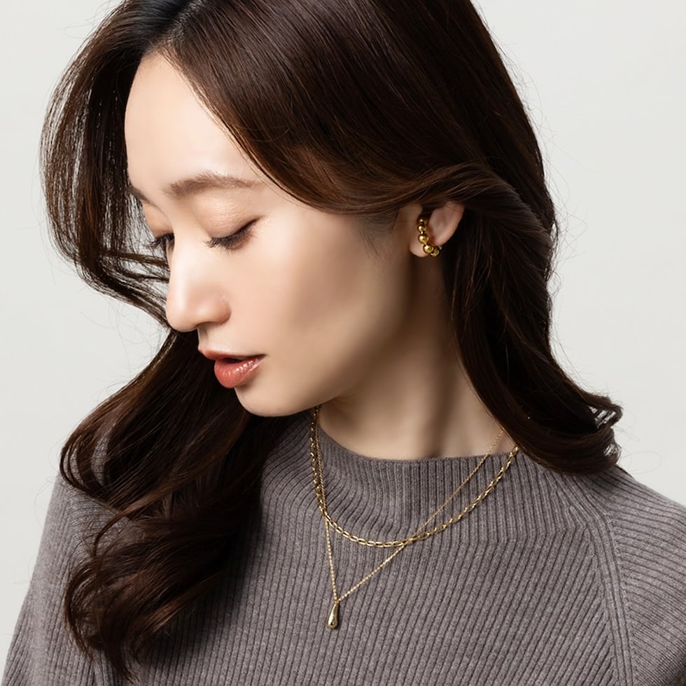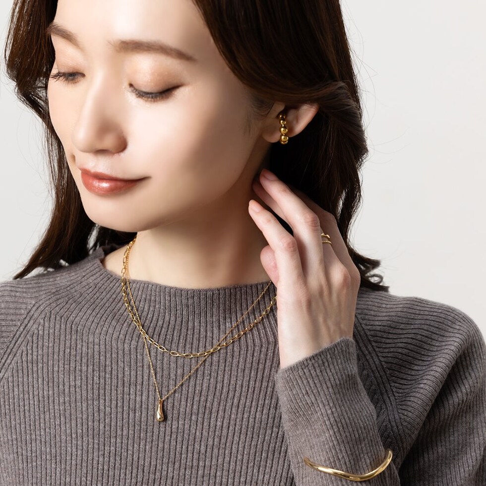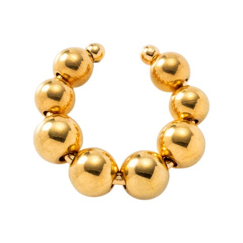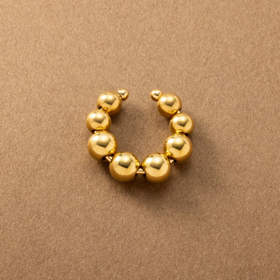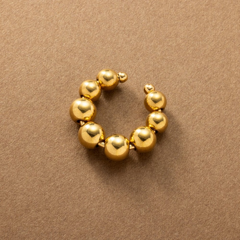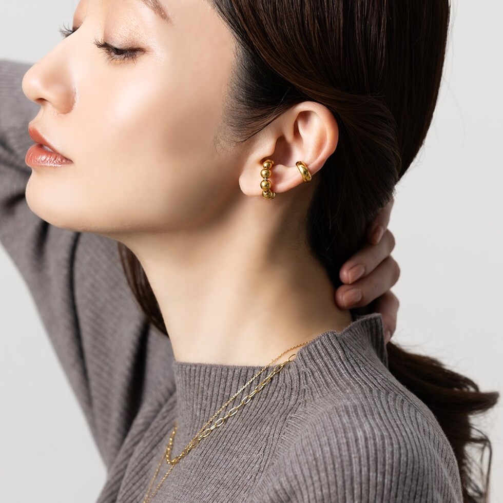 粒々メタルボールのステンレス製イヤーカフ。下に向かって幅を広げるぷっくり粒々メタルボールフープがシンプルながらも耳元を大人モダンにアピール◎錆びにくいステンレス製でデイリーに活躍しそう。