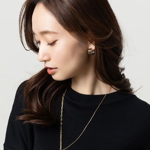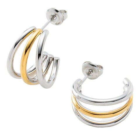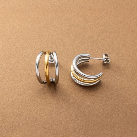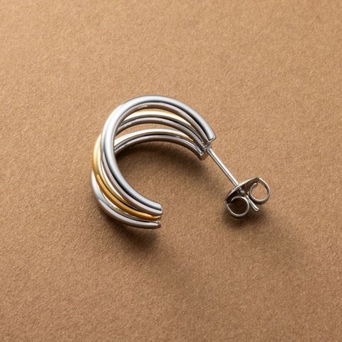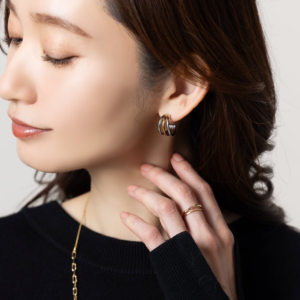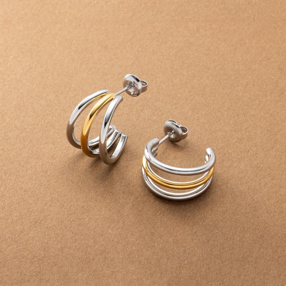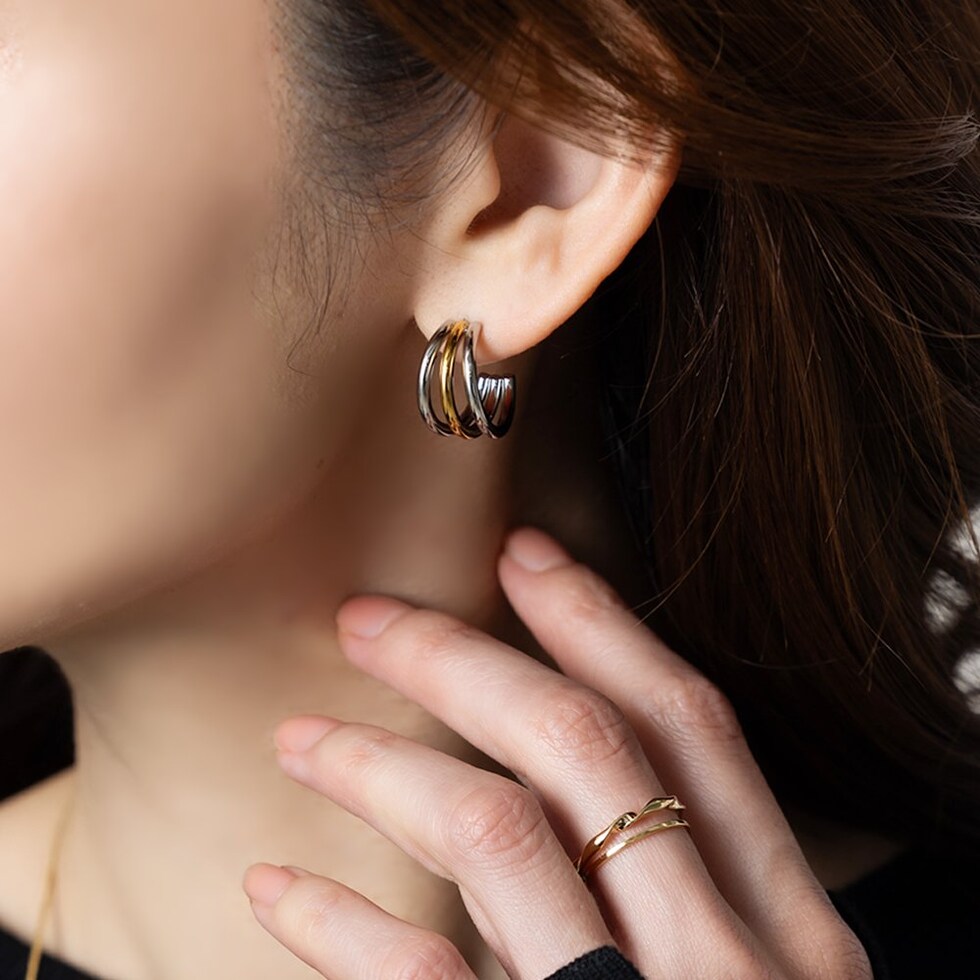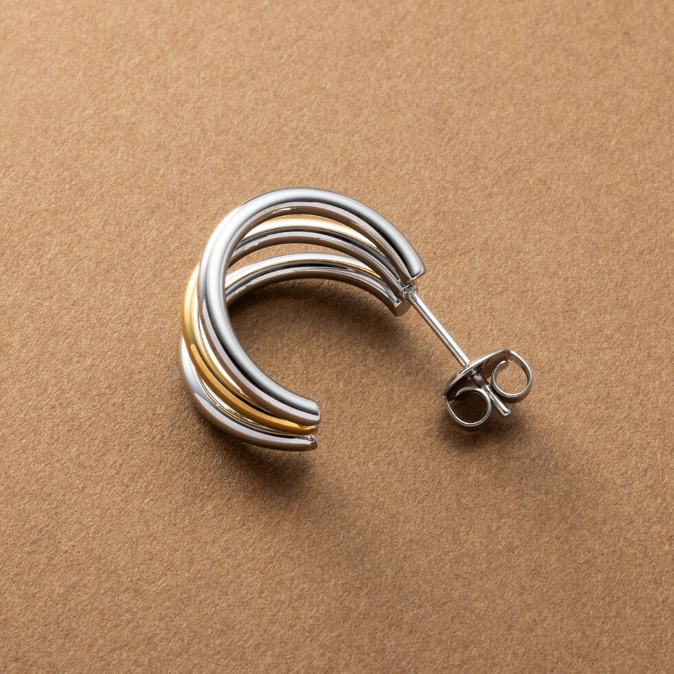 MIXカラー3連ラインのステンレス製C型ピアス。ゴールドとシルバーをMIX使いしたバイカラーの3連ラインが今っぽい。シンプルだけど存在感バツグン、大人スタイルにマストな逸品です。錆びにくいステンレス製でデイリーに活躍しそう◎