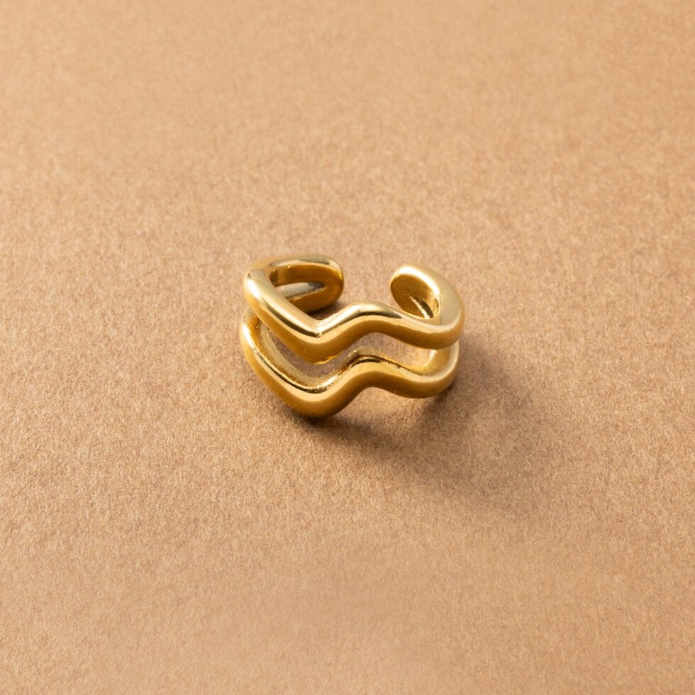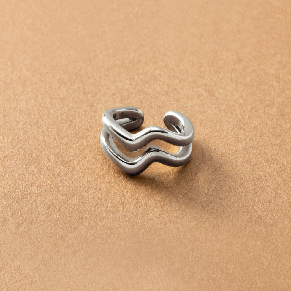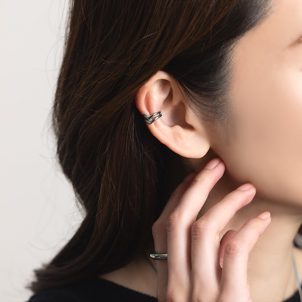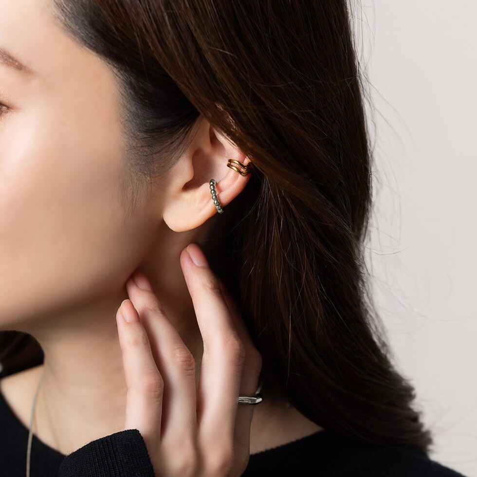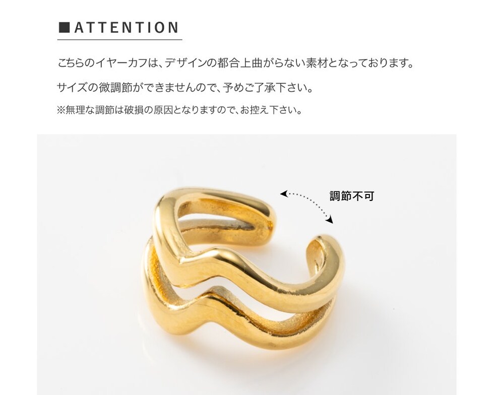 ウェーブダブルラインの小さめ片耳用イヤーカフ。レイヤード風のウェーブがこなれた印象に仕上がるひと品。コーデに程よい存在感を添えるデザインは、お手持ちのアイテムとの重ね付けもオススメです。錆びにくく傷に強いステンレス製でデイリーに活躍しそう。