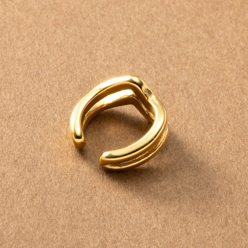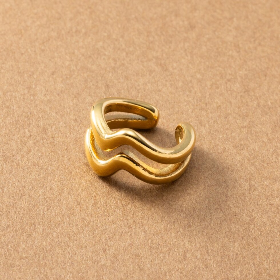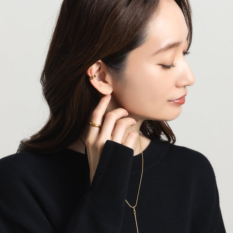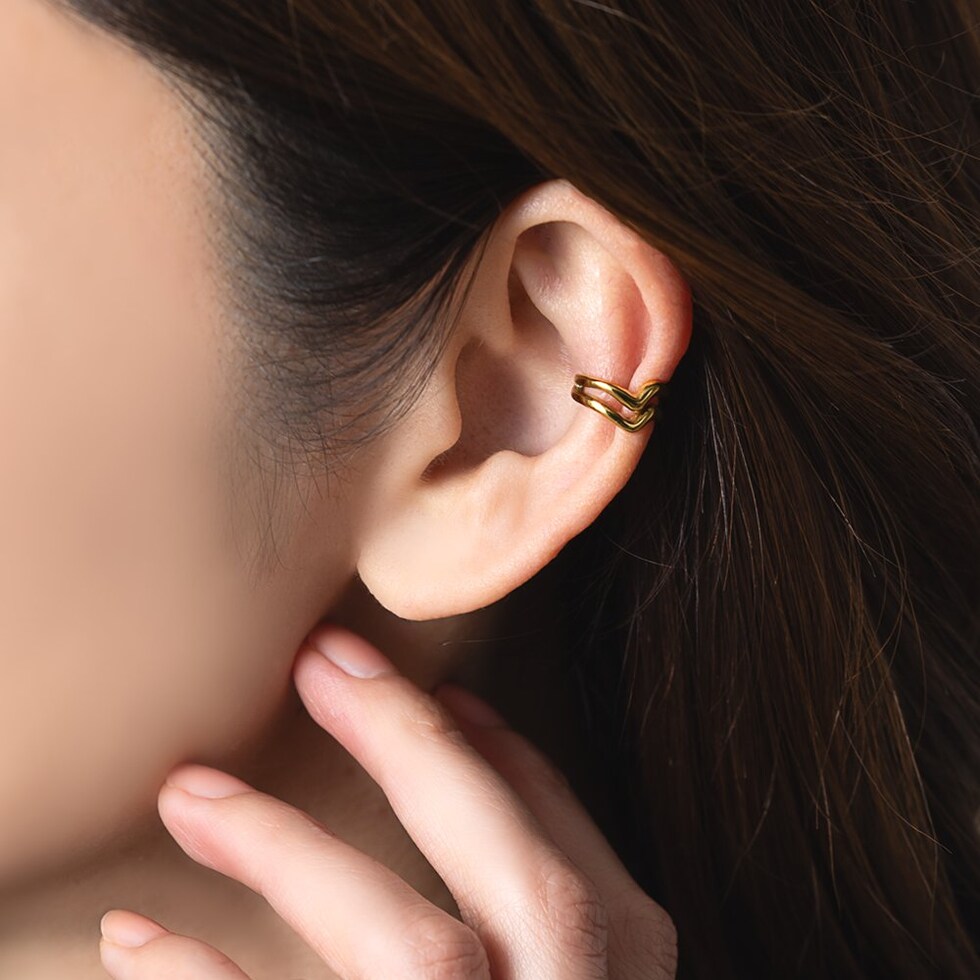 ウェーブダブルラインの小さめ片耳用イヤーカフ。レイヤード風のウェーブがこなれた印象に仕上がるひと品。コーデに程よい存在感を添えるデザインは、お手持ちのアイテムとの重ね付けもオススメです。錆びにくく傷に強いステンレス製でデイリーに活躍しそう。