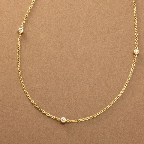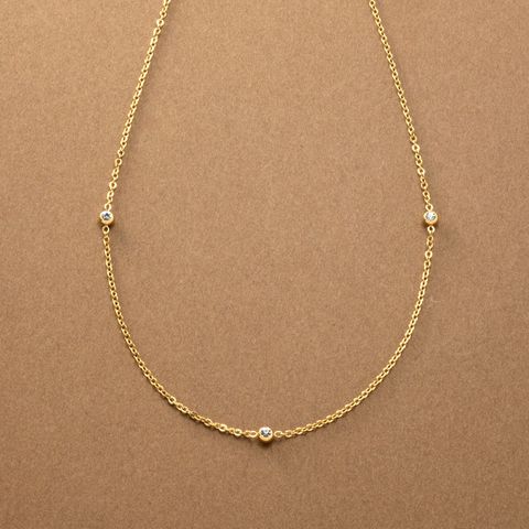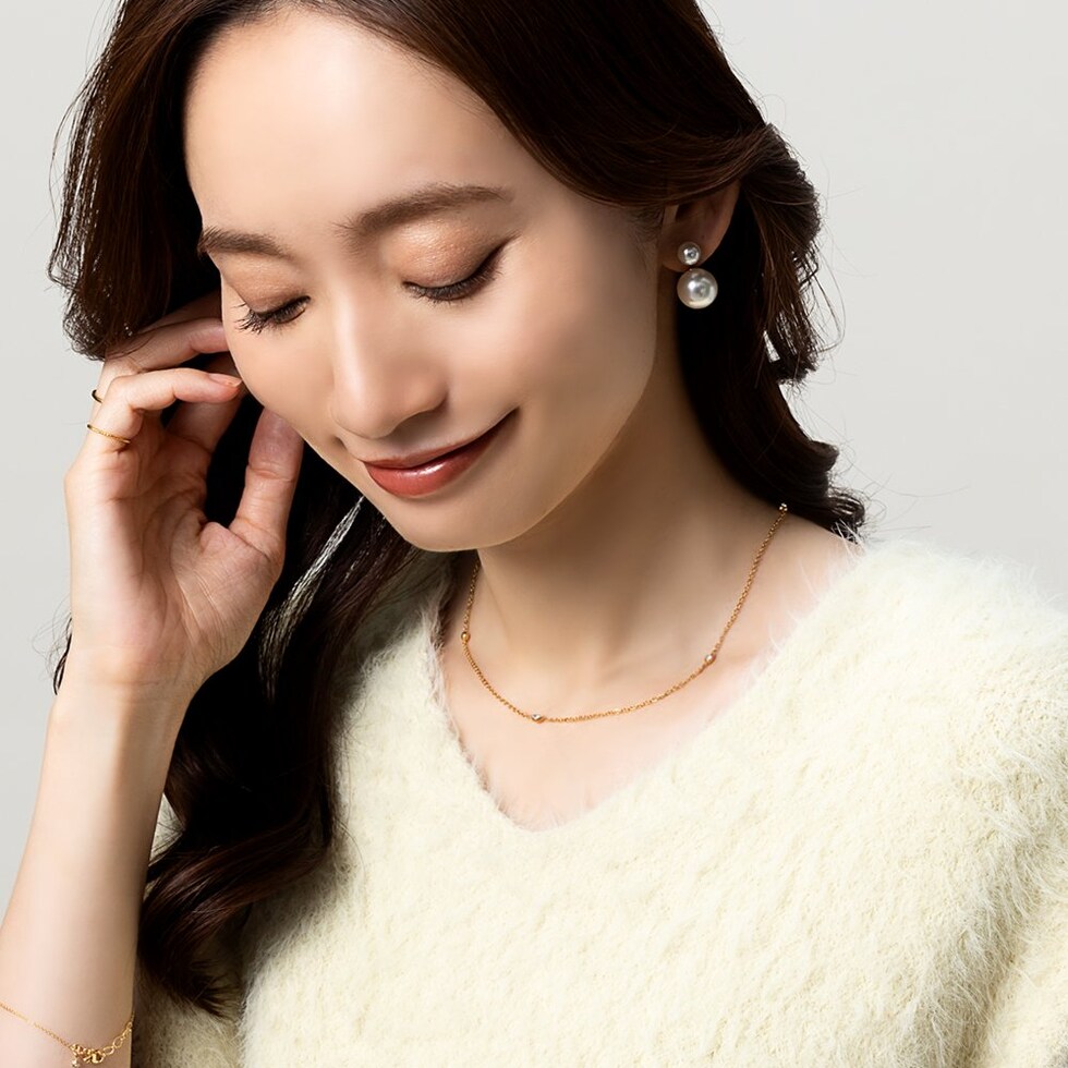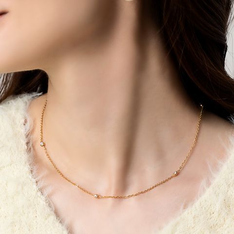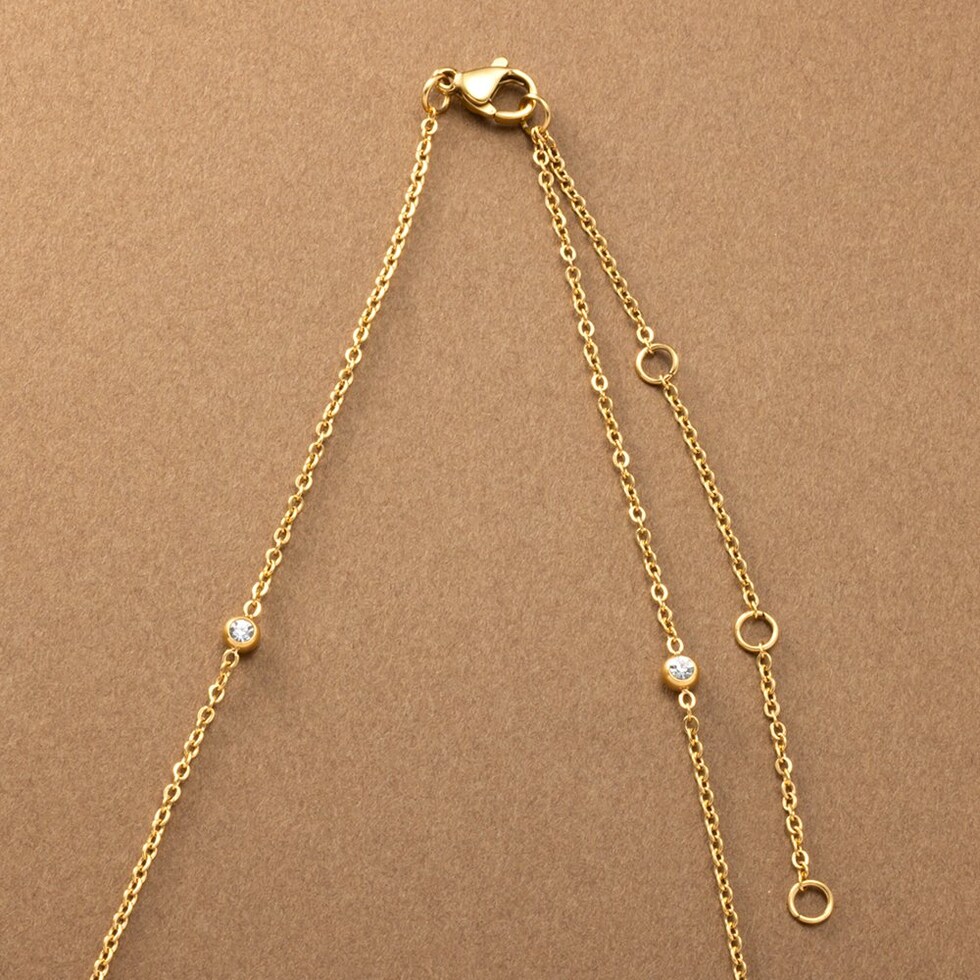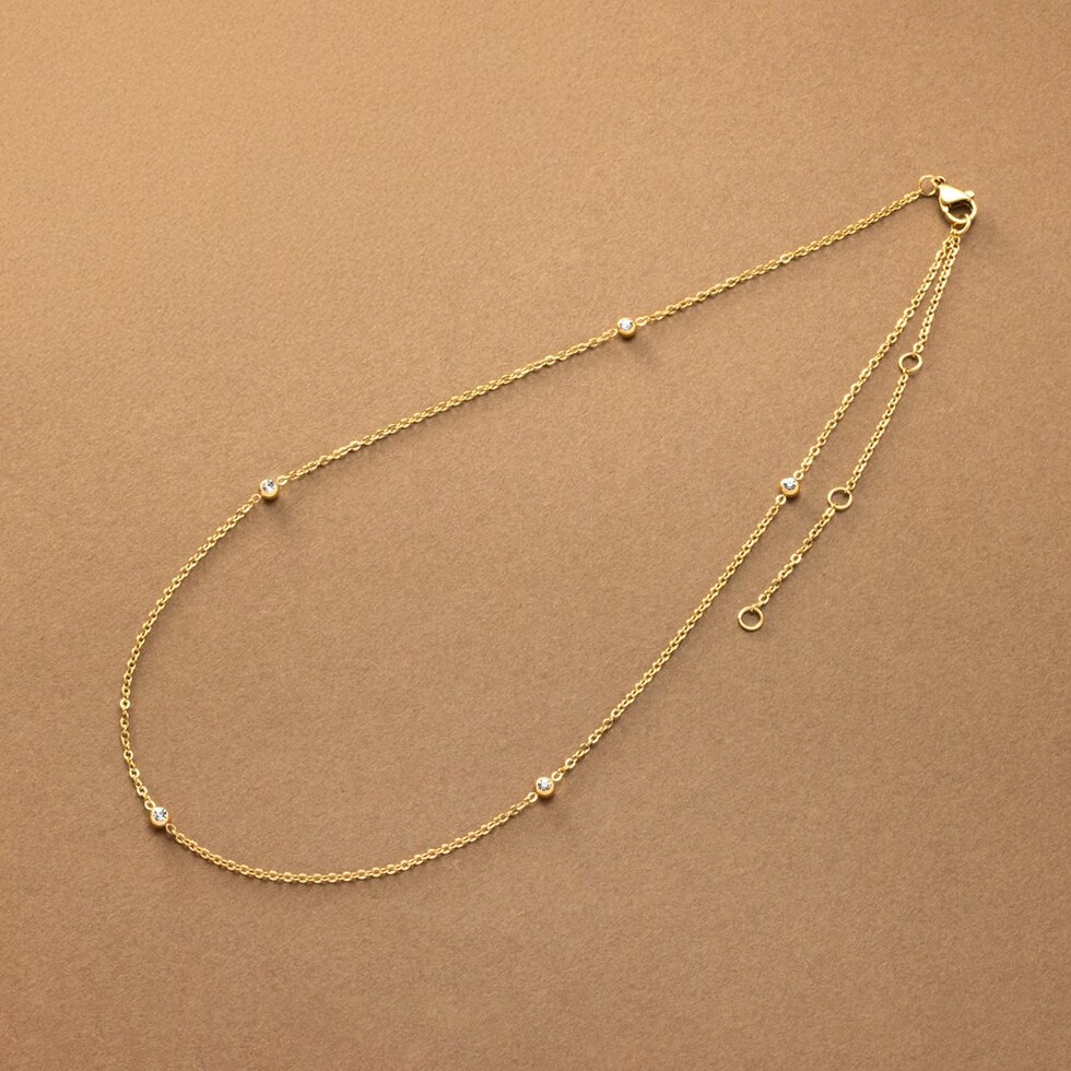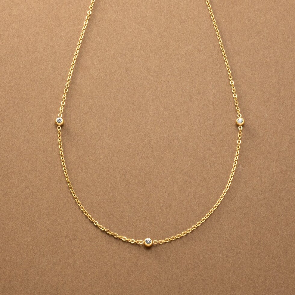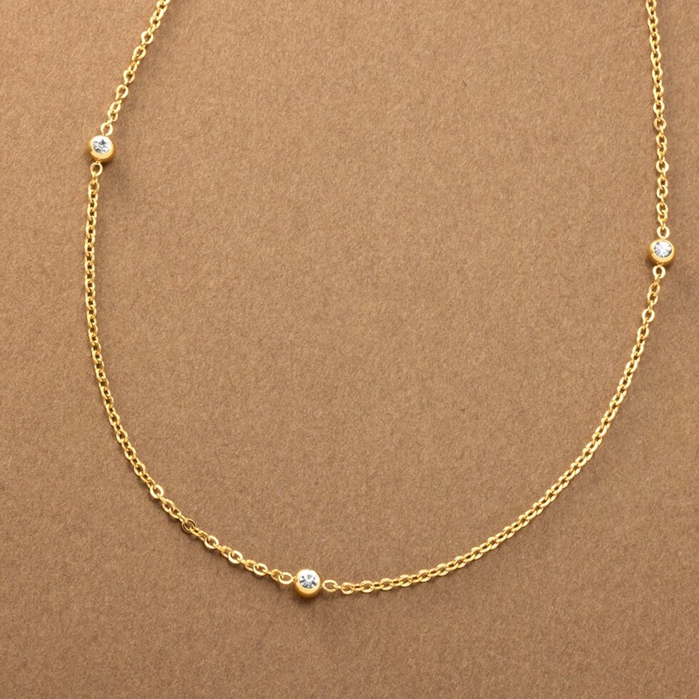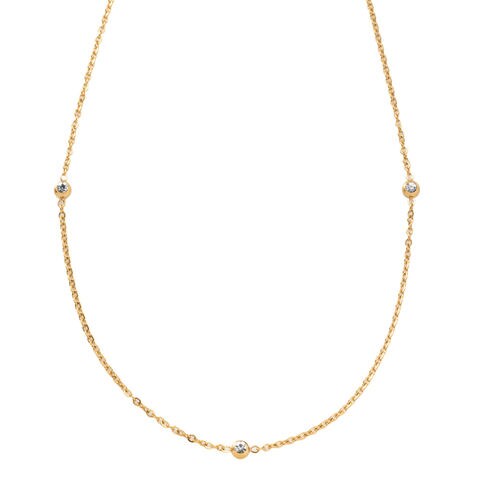 小さめビジューが等間隔に連なるステーションネックレス。華奢チェーンとシンプルで上品なデザインがコーデを選ばないから重宝しそう◎肌馴染みもよく錆びにくいステンレス製だからデイリー使いにぴったりの一品です。