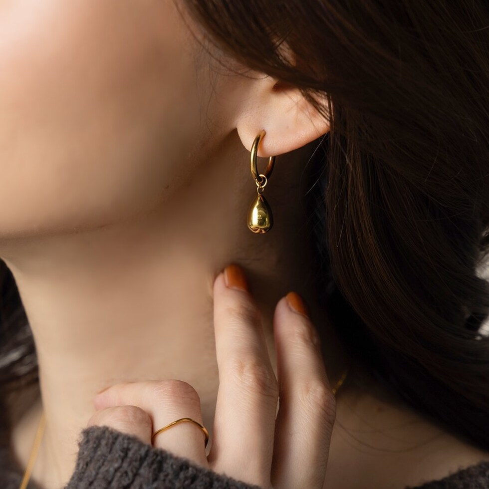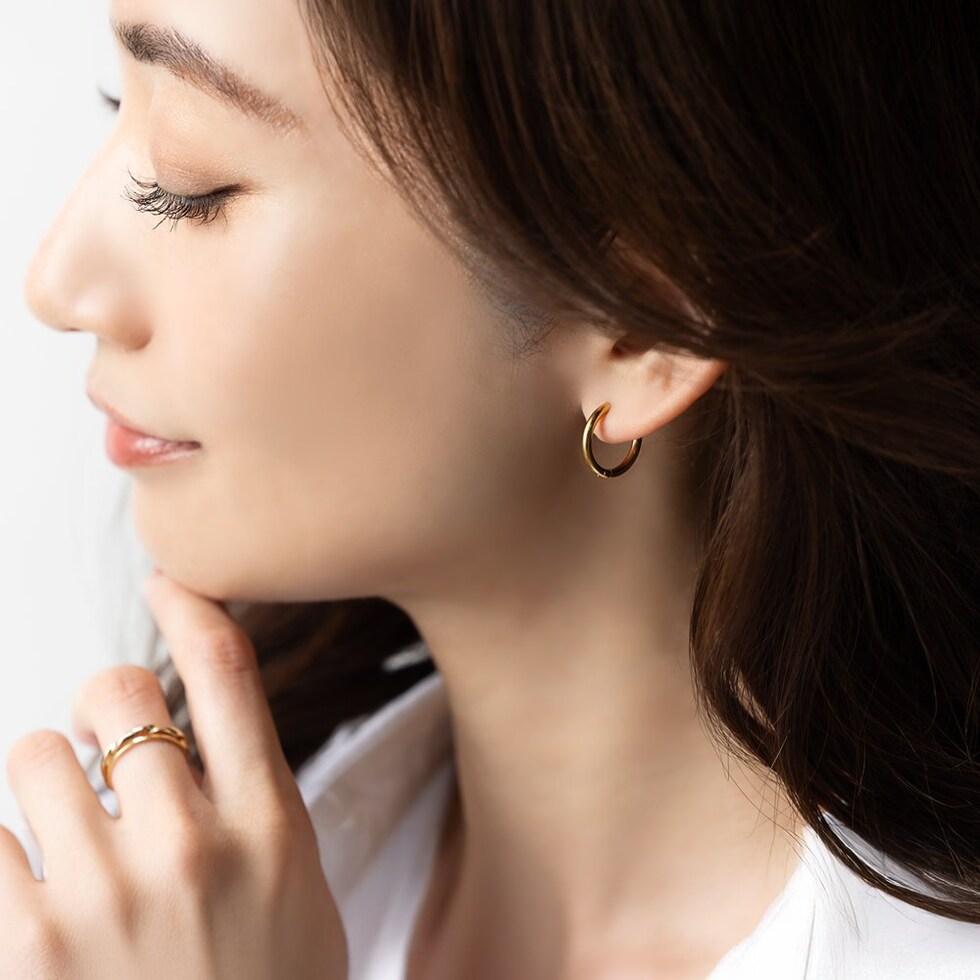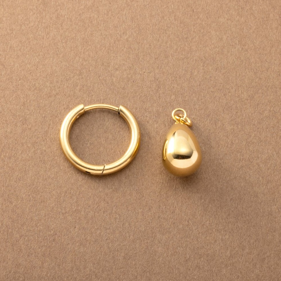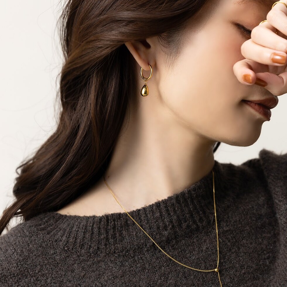 ぷっくり艶感ドロップがさりげなく揺れるフープピアス。洗練されたデザインがお顔周りを大人上品な印象に導きます。モチーフを外してシンプルなフープピアスとしても使える2WAY仕様が嬉しいひと品◎