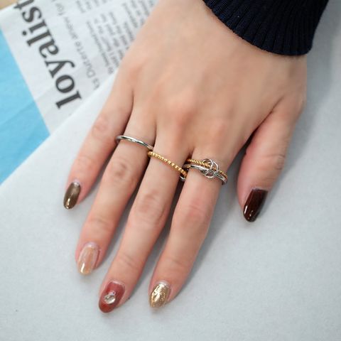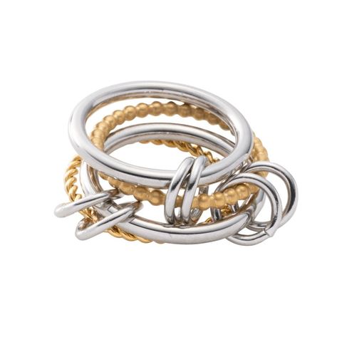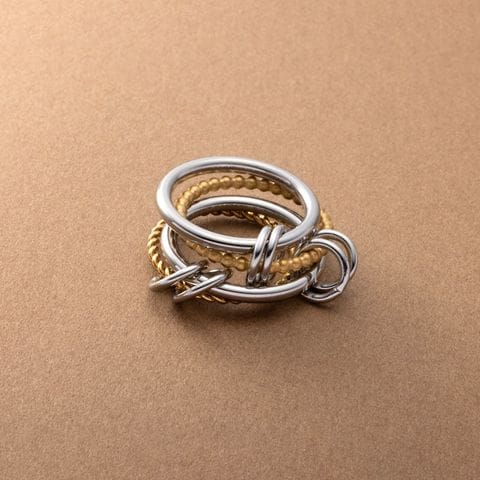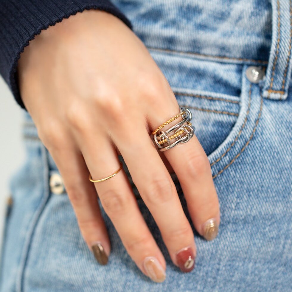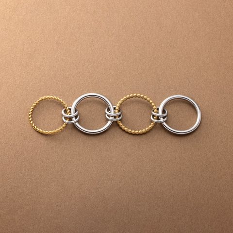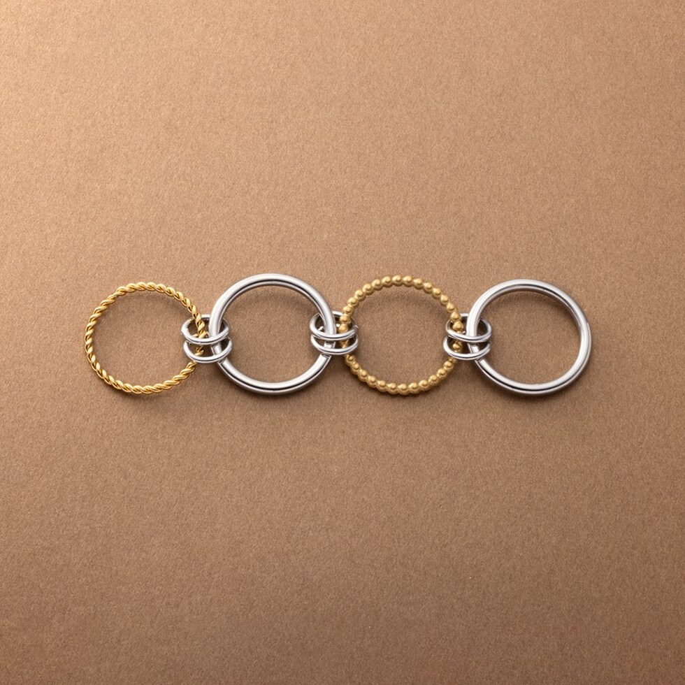 4本のリングを連結させたコンビカラーがお洒落なコネクテッドリング。全て重ねてボリュームを出したり、それぞれ違う指につけたりとアレンジ自在な新感覚のアクセサリーです。これひとつで手元コーデの幅がグッと広がるマストバイアイテム◎錆びにくく傷に強いステンレス製で、デイリーに活躍してくれます。長時間の着用も安心の低アレルギー素材です。